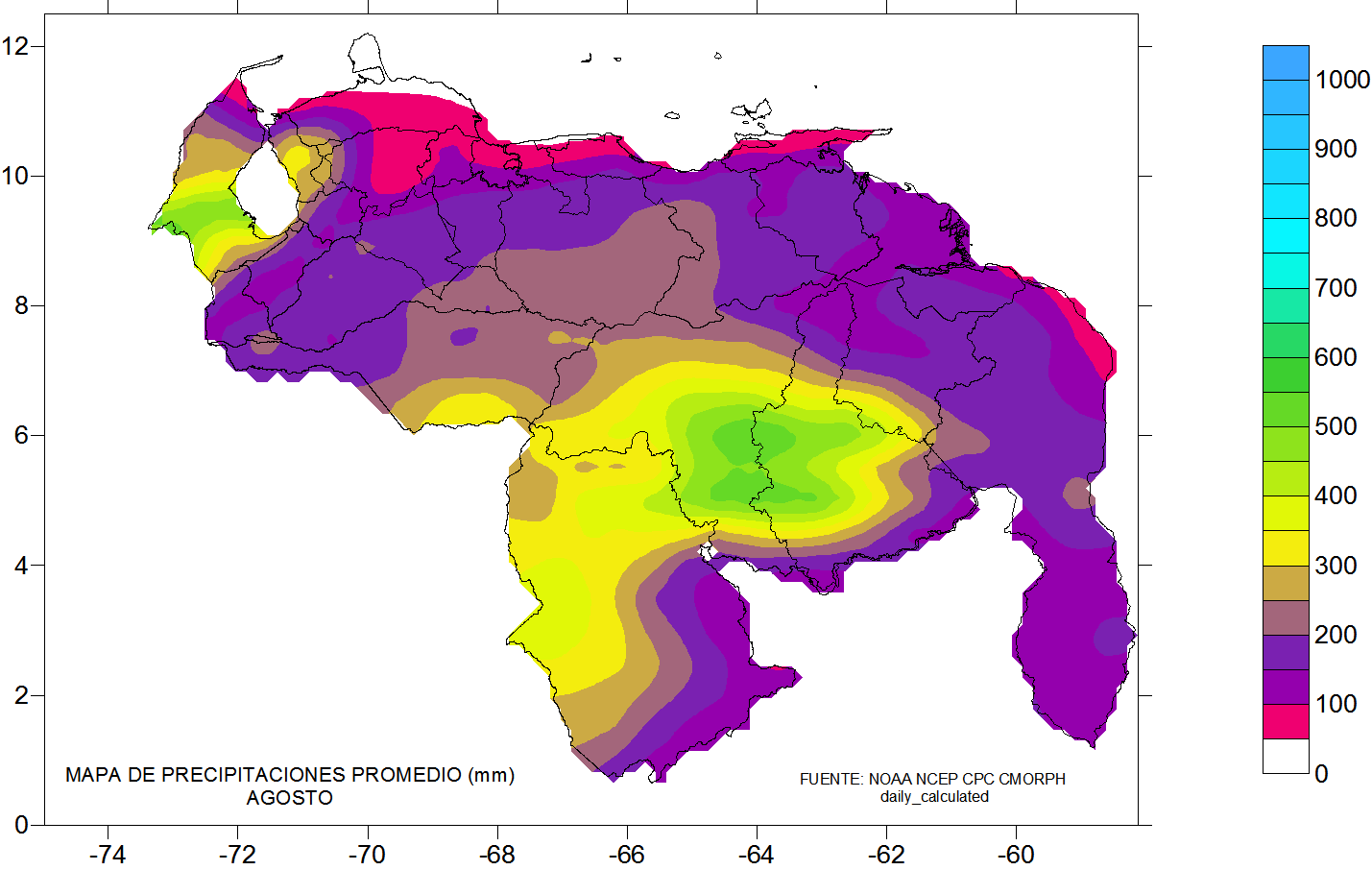 En los mapas de la estadística de la precipitación estimada ( NOAA NCEP CPC CMORPH, daily_calculated) durante los meses junio,julio y agosto, en junio las máximas precipitaciones se ubican en Amazonas, mitad de Bolívar, sru del lago de Maracaibo y sur de Apure, julio y agosto se reducen las áreas de máximas precipitaciones al sur de Amazonas, se mantienes las máximas la mitade Bolívar y se expanden al suroeste de Zulia.