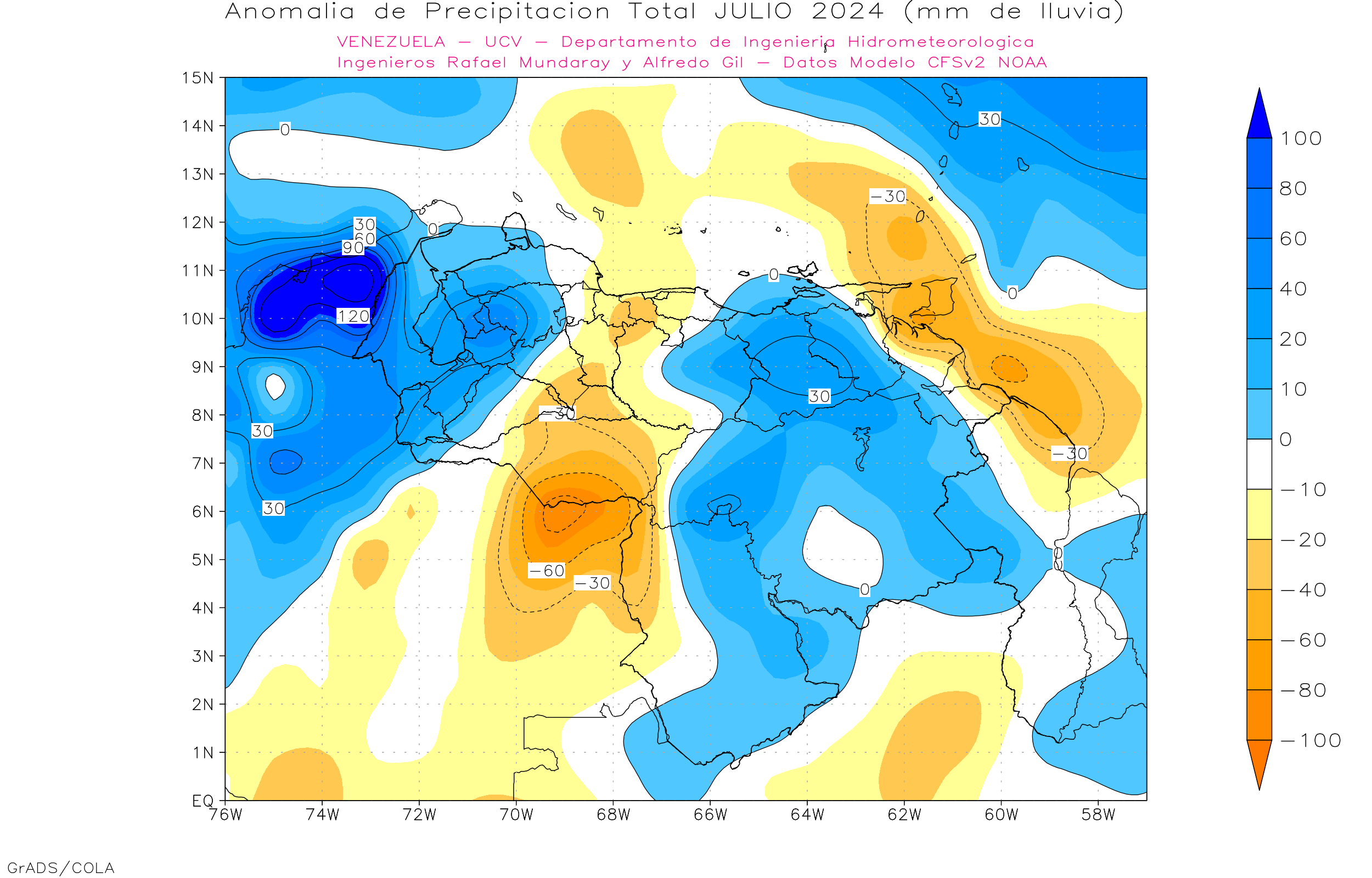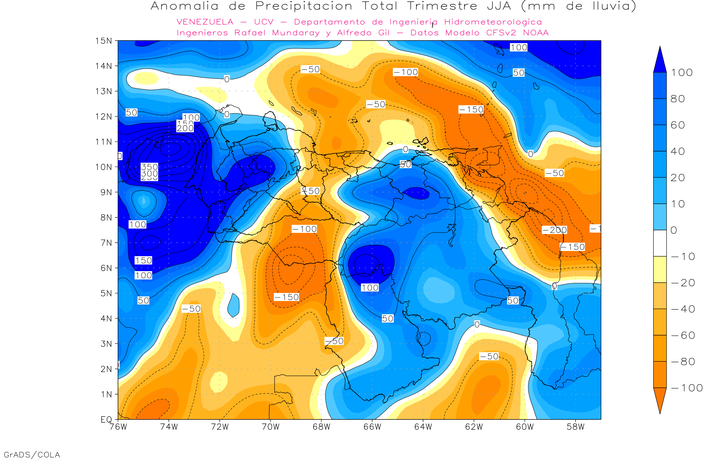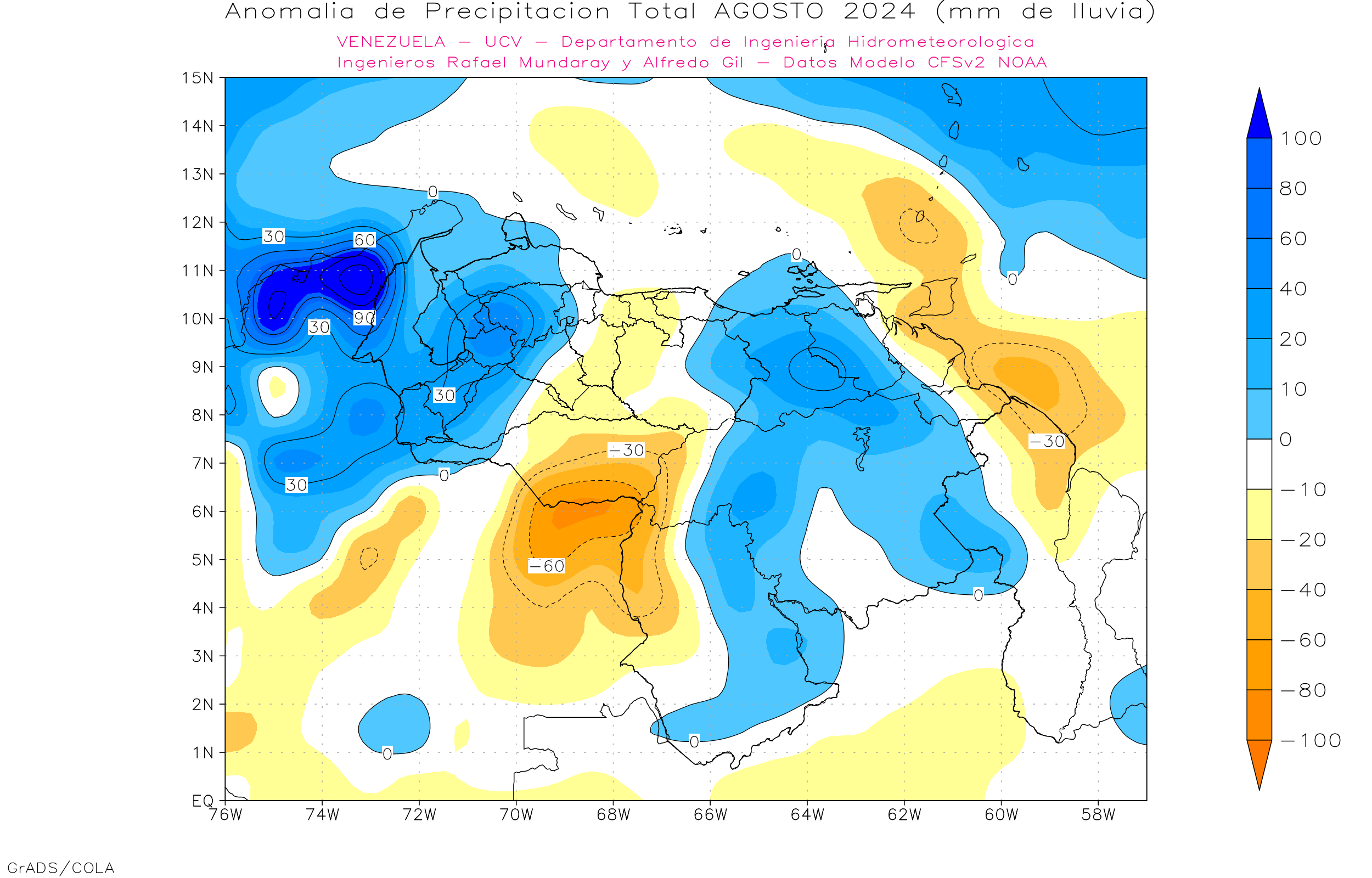 De acuerdo a la estadística de la precipitación estimada ( NOAA NCEP CPC CMORPH, daily_calculated) durante el trimestre Jun-Jul-Ago, los principales eventos de precipitaciones se ven en Amazonas, sur Bolívar y sur0oeste de Zulia con centro de precipitación entre 1200 y 1600 mm, por encima del 7° nortes precipitaciones por debajo de los 700 mm, por debajo de los 7° N la precipitación entre 800 y 1700 mm.