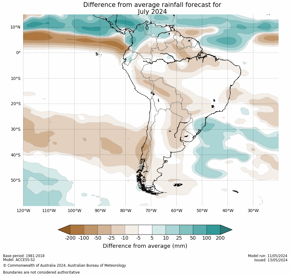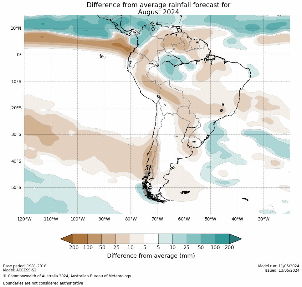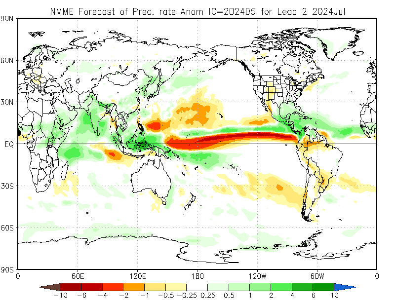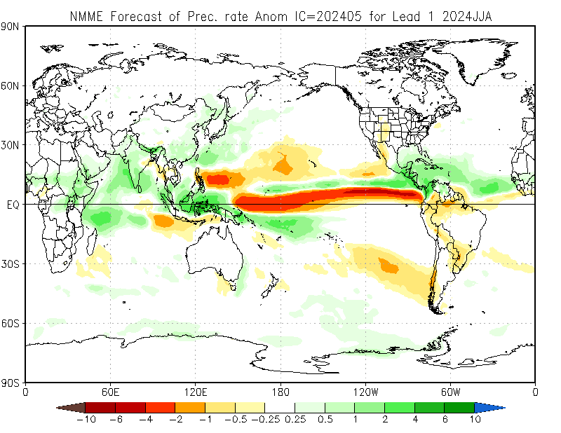 The North American Multi-Model Ensemble (NMME), Deutscher Wetterdienst de Alemania, Meteo France de Francia, ECMWF europeo, Met Office de Inglanterra, IRI, Australia Bureau of Meteorology, emperical, Integrated del CPTEC Brasil y CFSv2 de Estados Unidos. Se observa que el comportamiento de la precipitación para el trimestre Jun-Ago/2024 el 70% de los modelos ubican gran parte del país por encima de la media, lo que representa una reducción con respecto al mes pasado.
