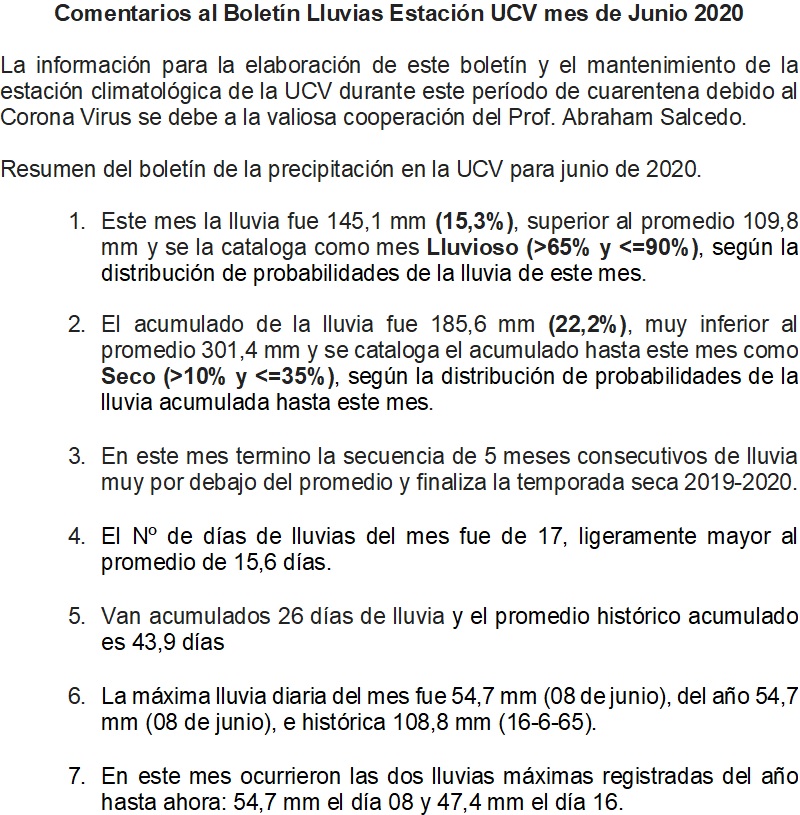 Boletín Lluvias Estación U.C.V. mes de Junio 2020