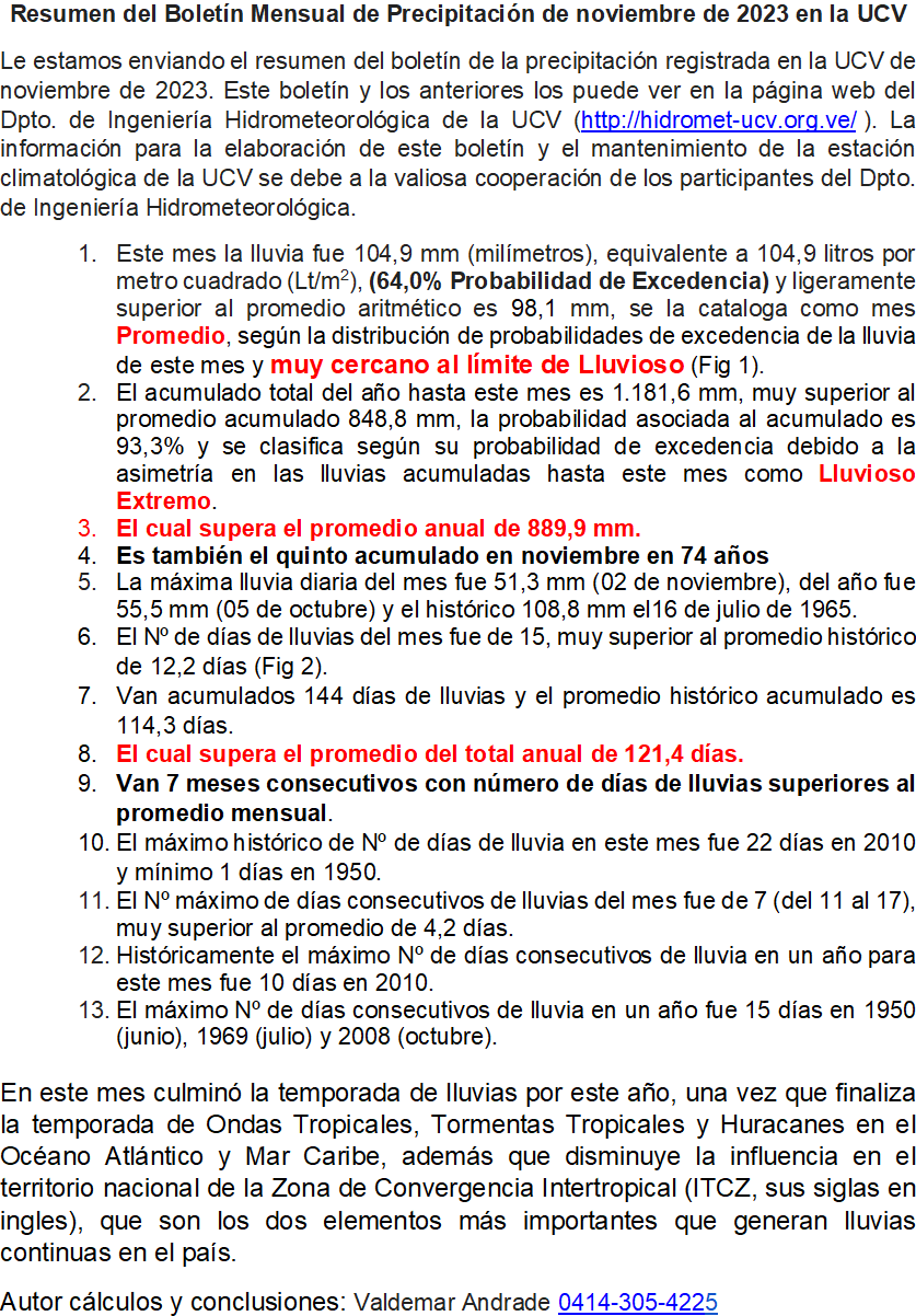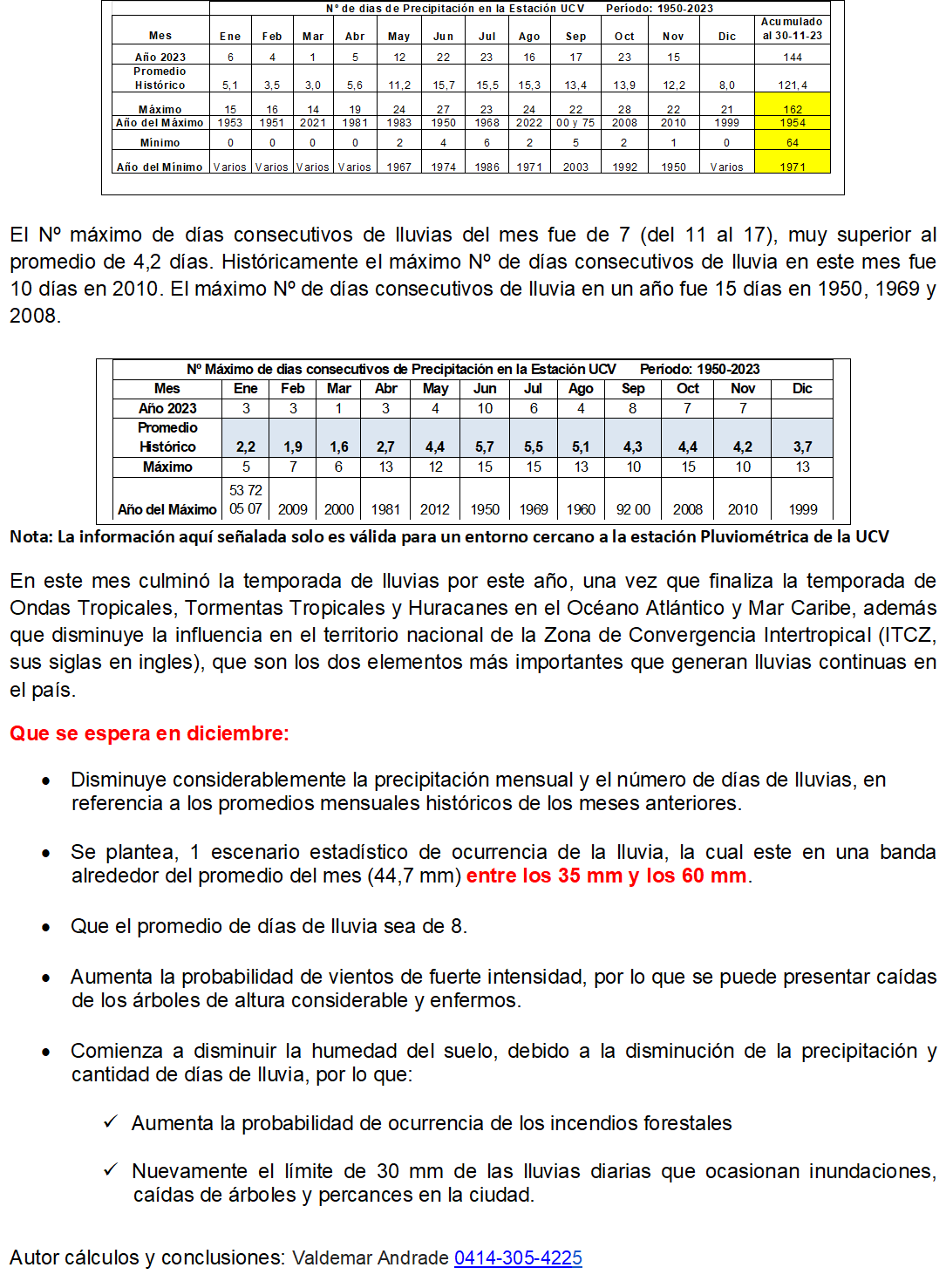 Boletín Lluvias Estación U.C.V. mes de Noviembre 2023