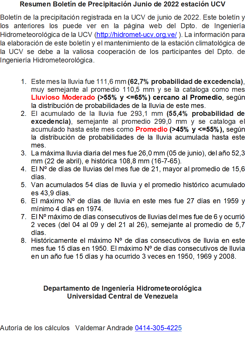 Boletín Lluvias Estación UCV – junio 2022 30/06/2022 Actualidad Hidrometeorológica, CAMBIO CLIMÁTICO, CLIMATOLOGÍA, Hidrología, Inundaciones Venezuela, Meteorología Ver Lluvias UCV Lluvia UCV al 30-06-22 Anexo Junio 2022 CompartirTwittearCompartirCompartirCorreo electrónico Entradas relacionadas ROBO EN EL DEPARTAMENTO DE ING. HIDROMETEOROLÓGICA Así encontramos el Departamento de Ingeniería Hidrometeorologica de la Universidad Central de Venezuela el día… Comentarios al Boletín de Precipitación Estación UCV mes de Mayo Estimados Amigos Ante todo un gran saludo Quiero destacar 3 notas importantes referentes a la lluvia… La deforestación tropical distorsiona las precipitaciones y vientos del mundo Los efectos catastróficos de la desforestación no se limitan al aumento de CO2 en la…