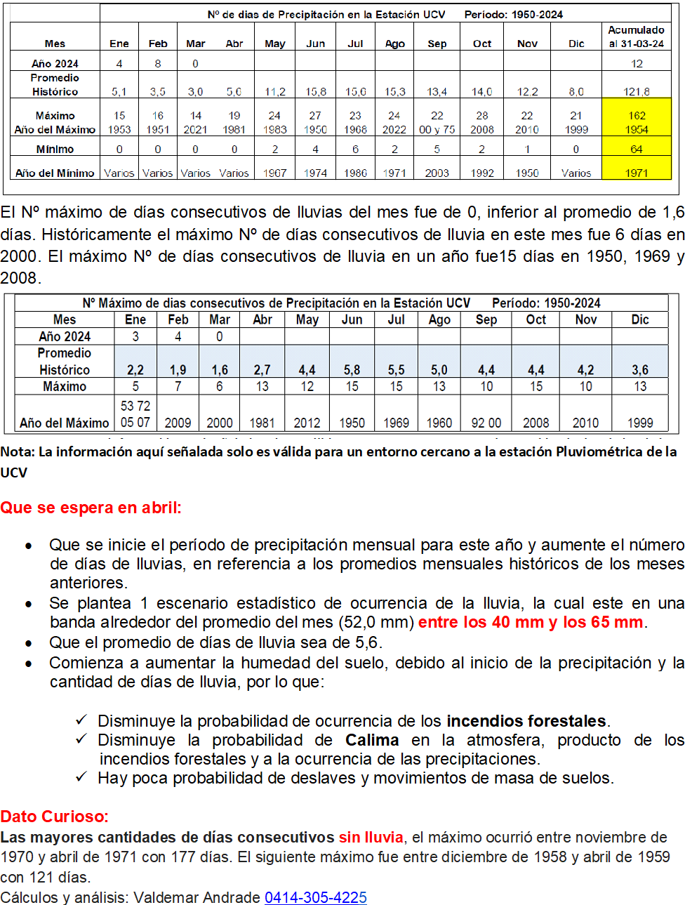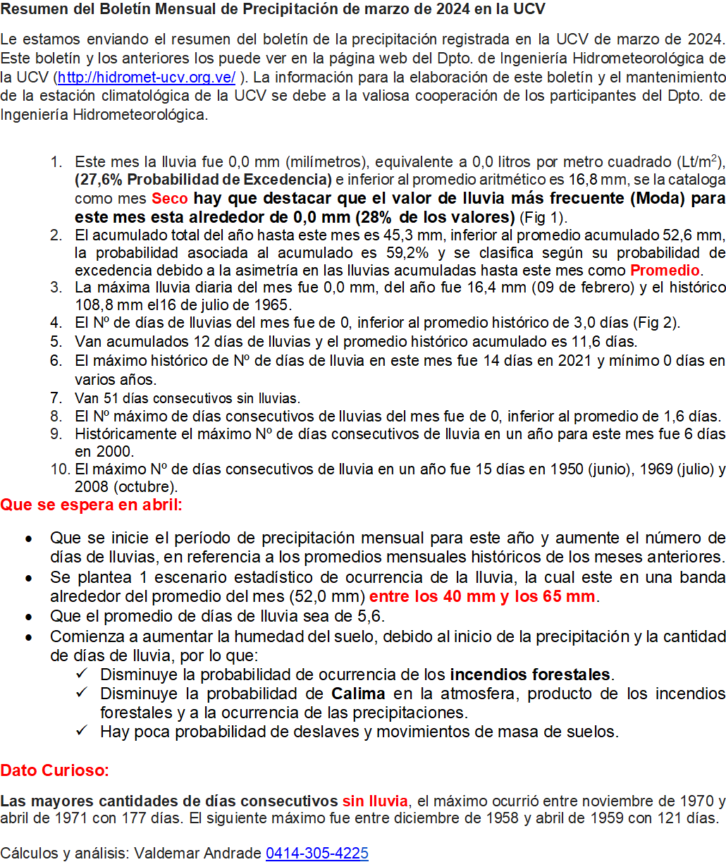 Boletín Lluvias UCV Estación U.C.V. mes de Marzo 2024