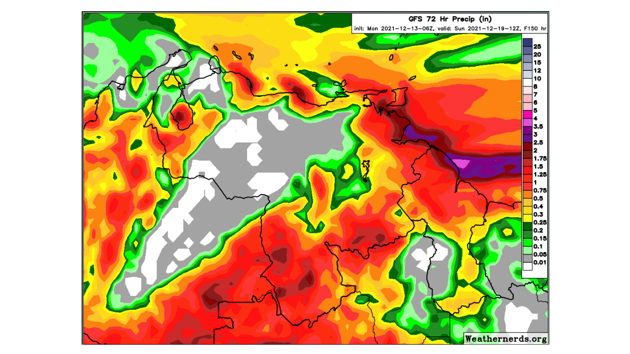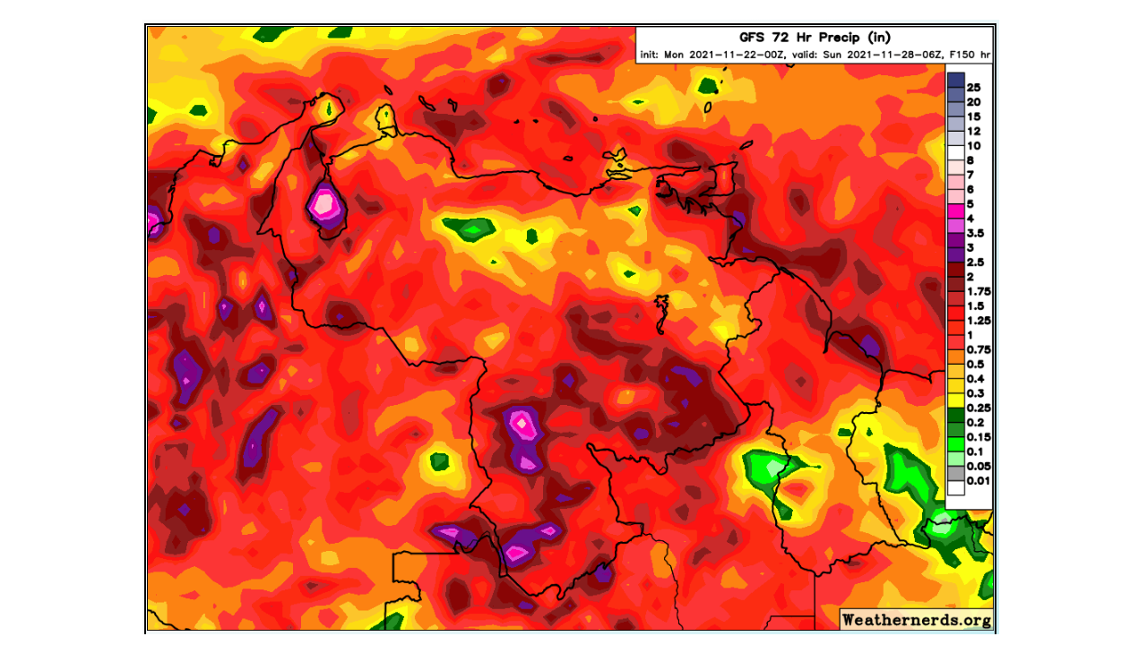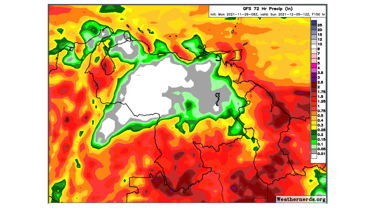 Pronostico de Anomalías Semanales para Venezuela, del 27/12/21 al 23/01/22, usando datos del Modelo CFSv2 de NOAA y ECMWF. Nota: anomalías positivas, precipitaciones sobre la media y negativas por debajo de la media histórica (1999-2010). Anomalías negativas no significa que…