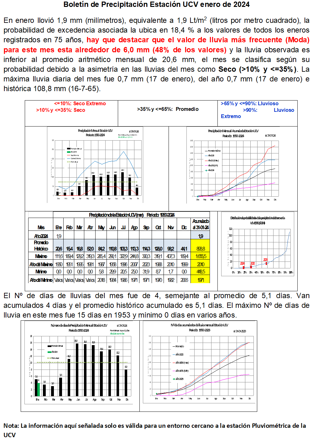 Para datos abrir Página del Departamento de Ingeniería Hidrometeorológica Universidad Central de Venezuela: (https://hidromet-ucv.org/) Lluvia UCV al 31-01-24 Anexo Enero 2024