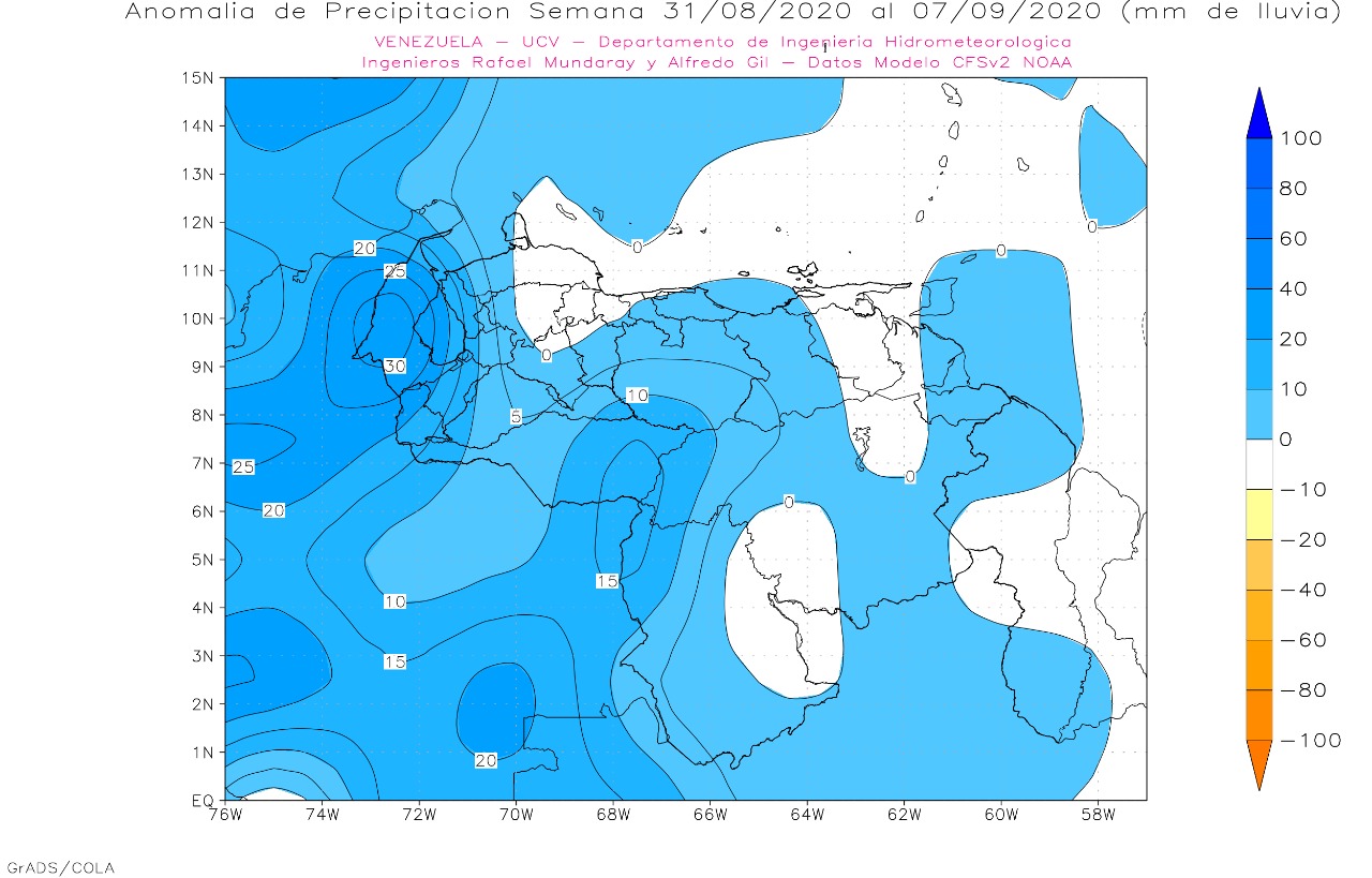 Pronostico subestacional de Anomalías de Precipitaciones Semanales para Venezuela, entre 14/09 al 12/10 de 2020, usando datos del Modelo CFSv2 de NOAA. La semana del 14 al 21 de septiembre, se prevé anomalías positivas de precipitaciones al sur del país…