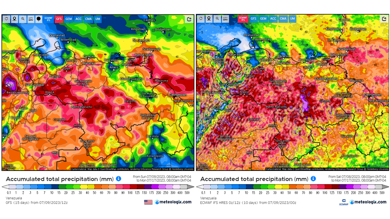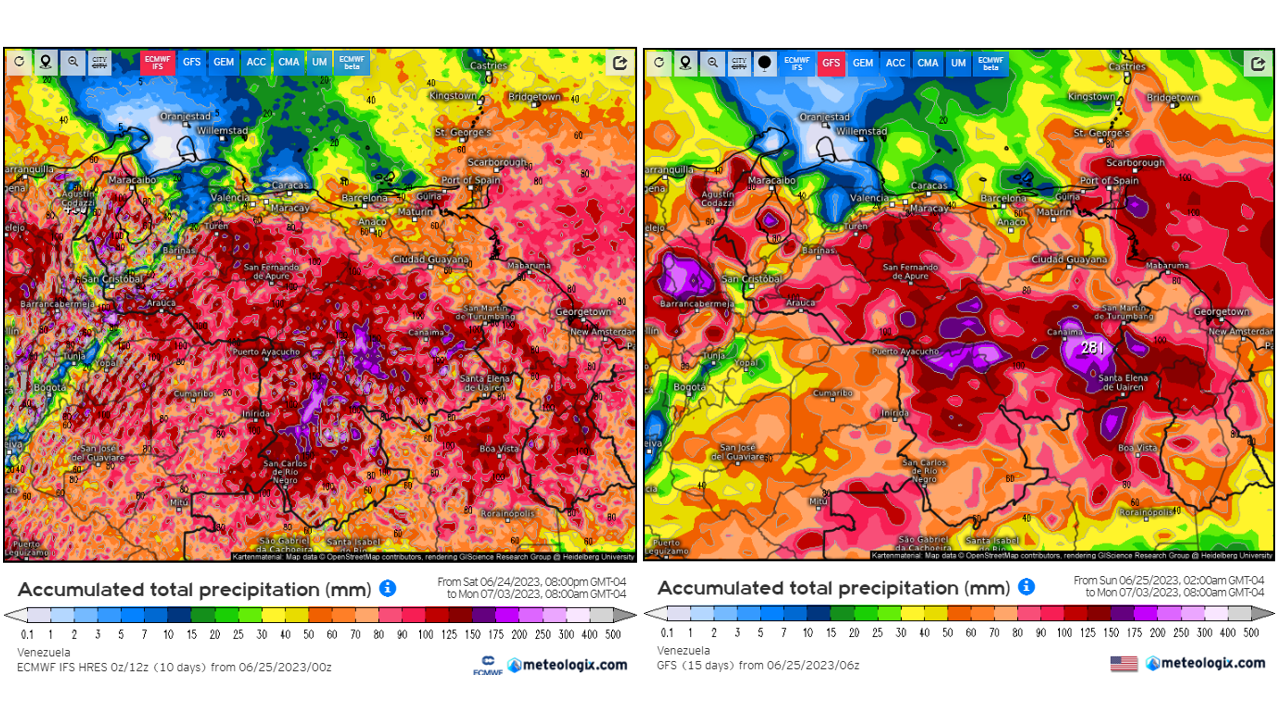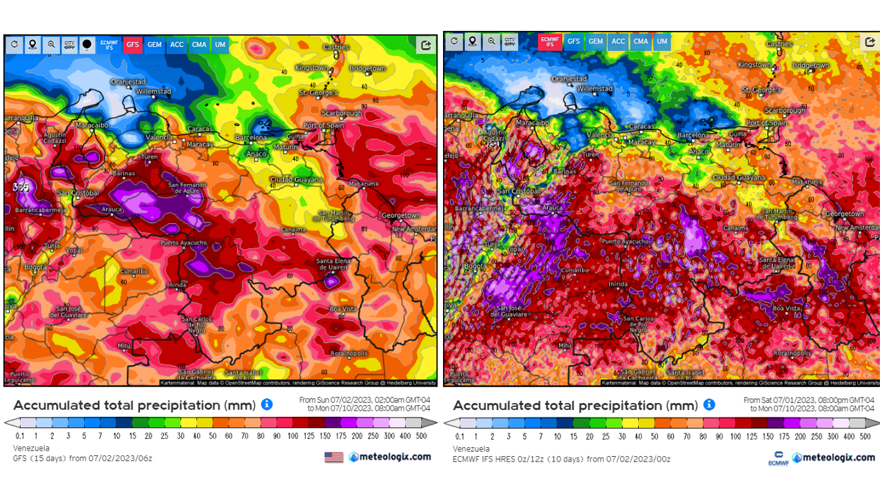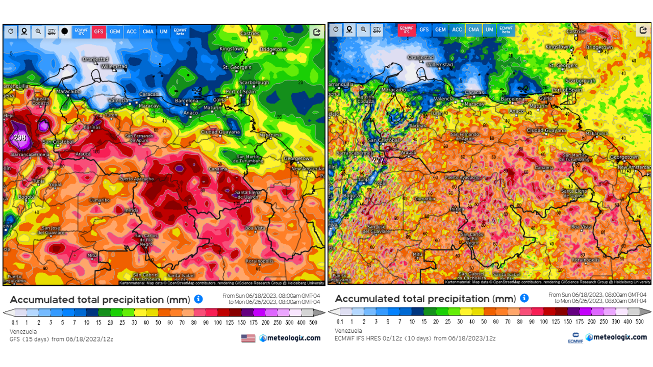 Pronostico de Anomalías Semanales para Venezuela, del 06/08 al 02/09/2023, usando datos del Modelo CFSv2 de NOAA y ECMWF. Nota: anomalías positivas, precipitaciones sobre la media y negativas por debajo de la media histórica (1999-2010). Anomalías negativas no significa que…