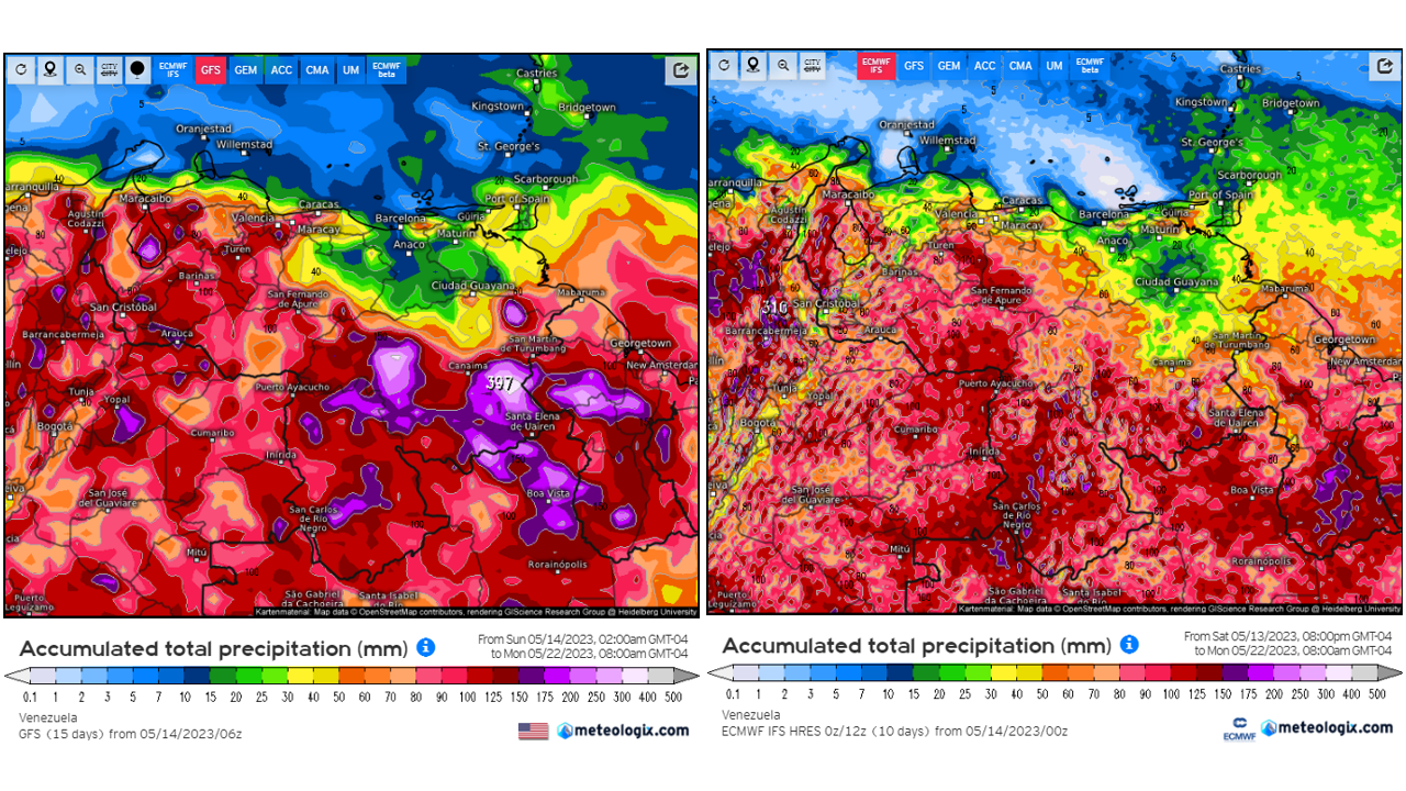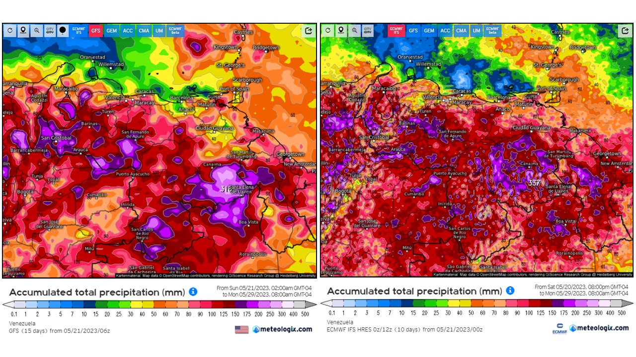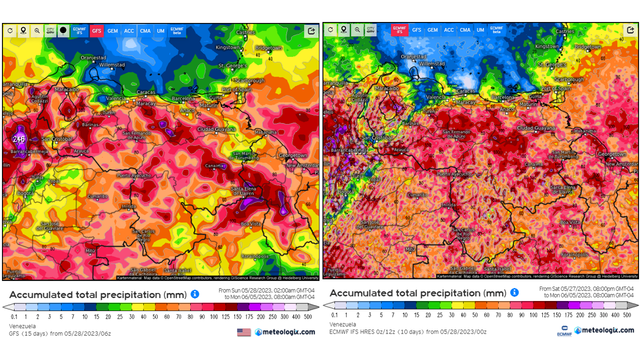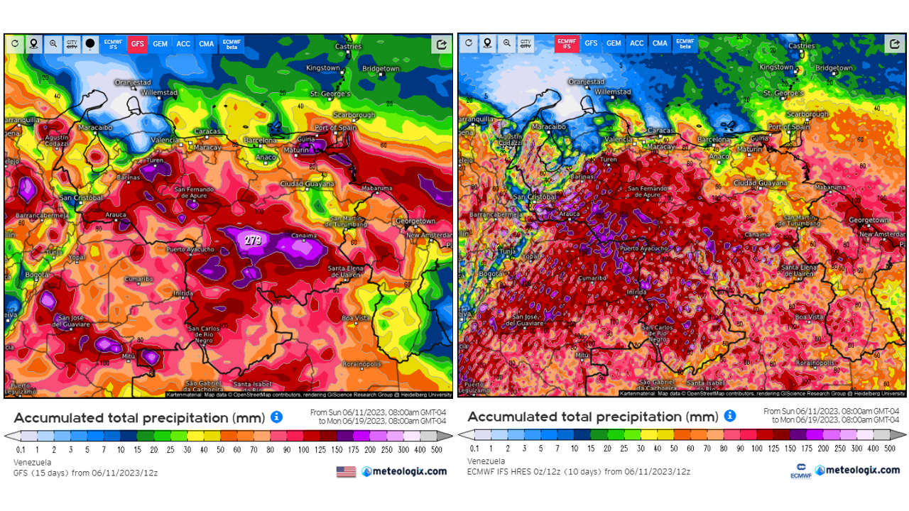 Pronostico de Anomalías Semanales para Venezuela, del 06/08 al 02/09/2023, usando datos del Modelo CFSv2 de NOAA y ECMWF. Nota: anomalías positivas, precipitaciones sobre la media y negativas por debajo de la media histórica (1999-2010). Anomalías negativas no significa que…