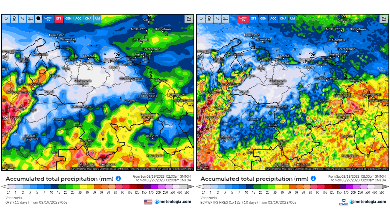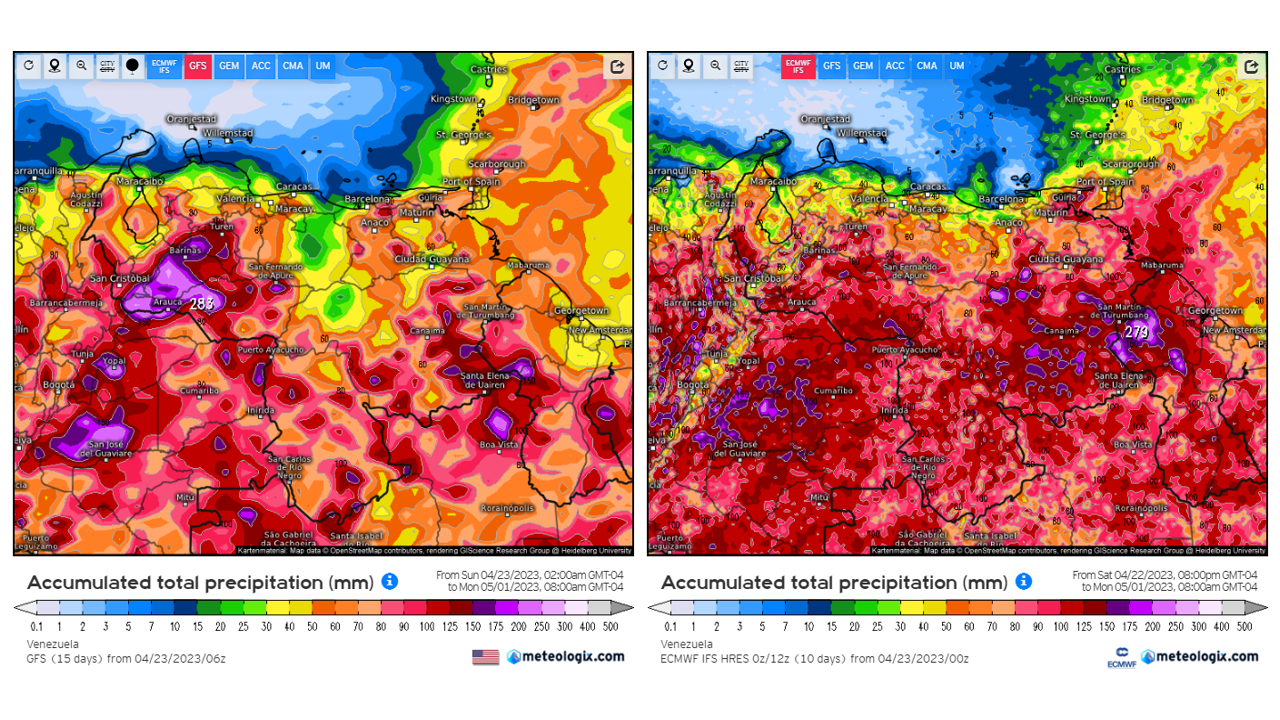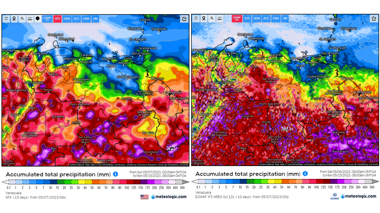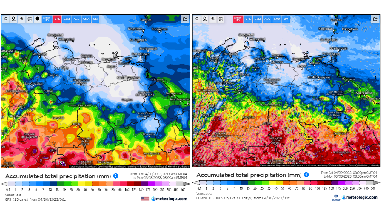 Pronostico de Anomalías Semanales para Venezuela, del 07/05 al 03/06/2023, usando datos del Modelo CFSv2 de NOAA y ECMWF. Nota: anomalías positivas, precipitaciones sobre la media y negativas por debajo de la media histórica (1999-2010). Anomalías negativas no significa que…