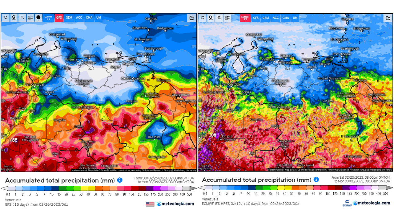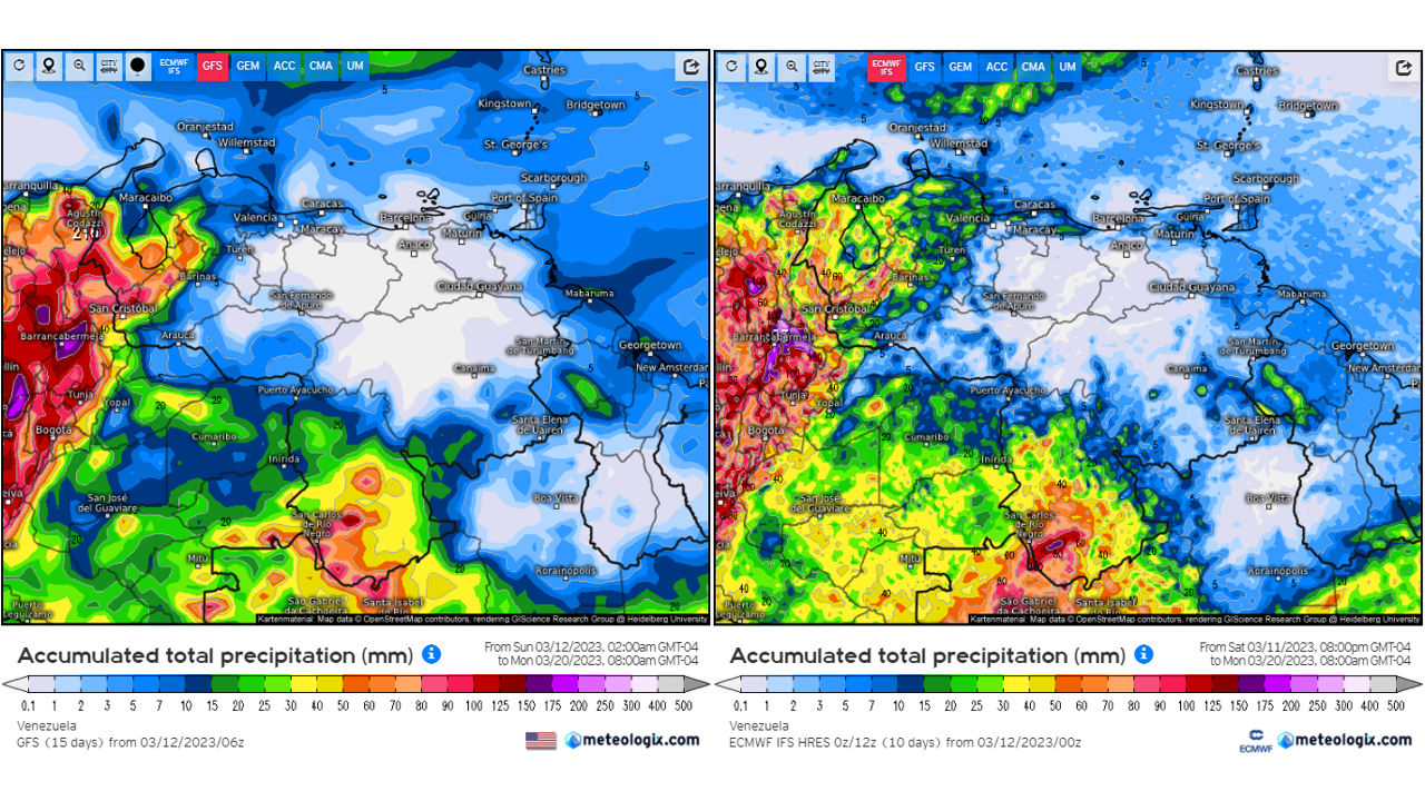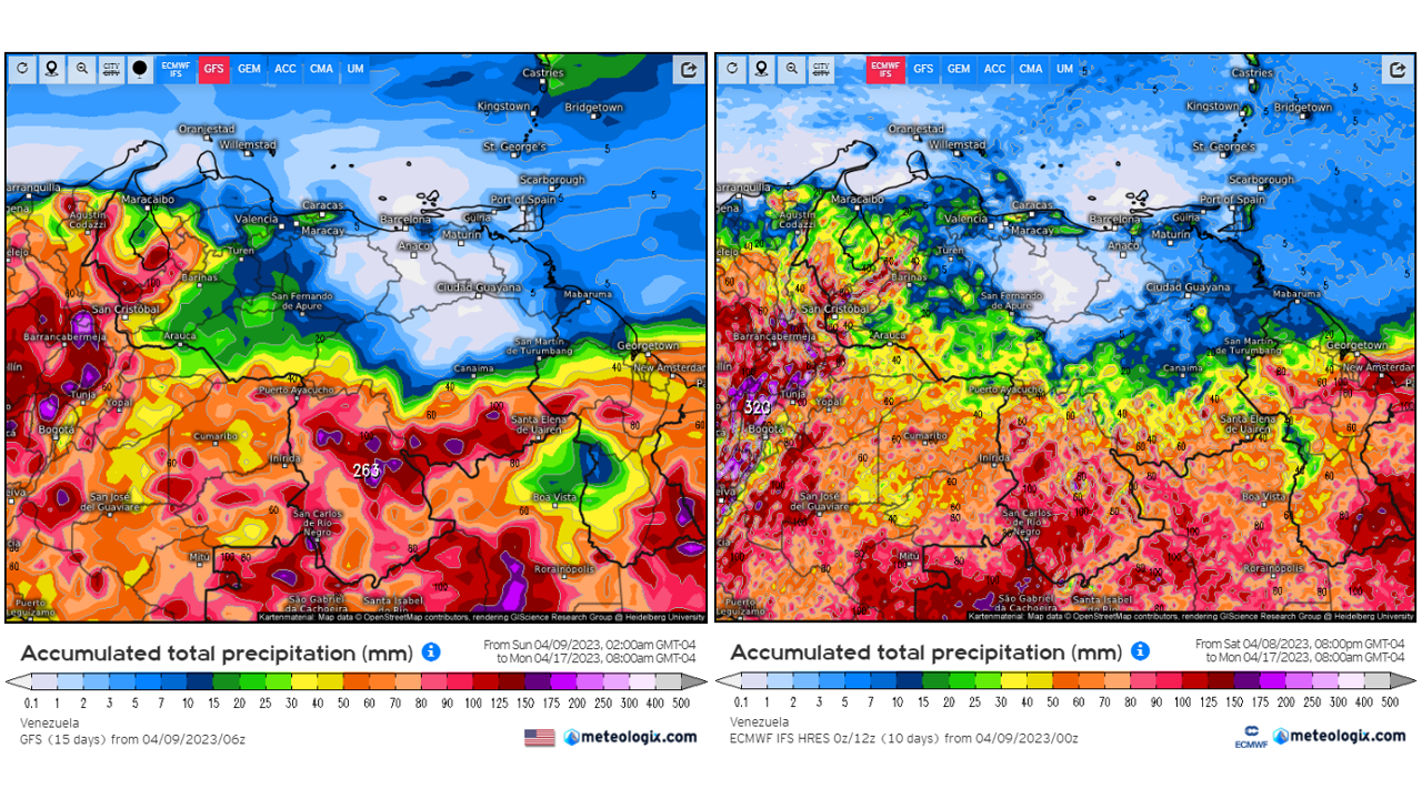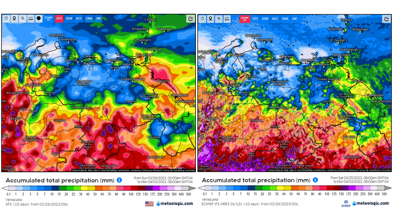 Pronostico de Anomalías Semanales para Venezuela, del 07/05 al 03/06/2023, usando datos del Modelo CFSv2 de NOAA y ECMWF. Nota: anomalías positivas, precipitaciones sobre la media y negativas por debajo de la media histórica (1999-2010). Anomalías negativas no significa que…