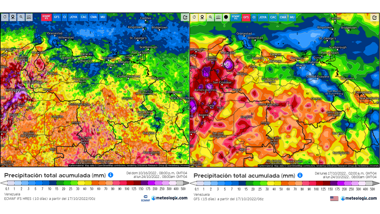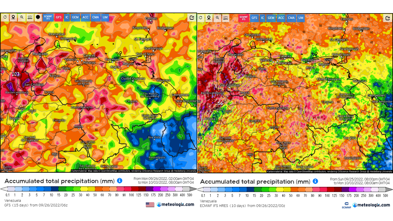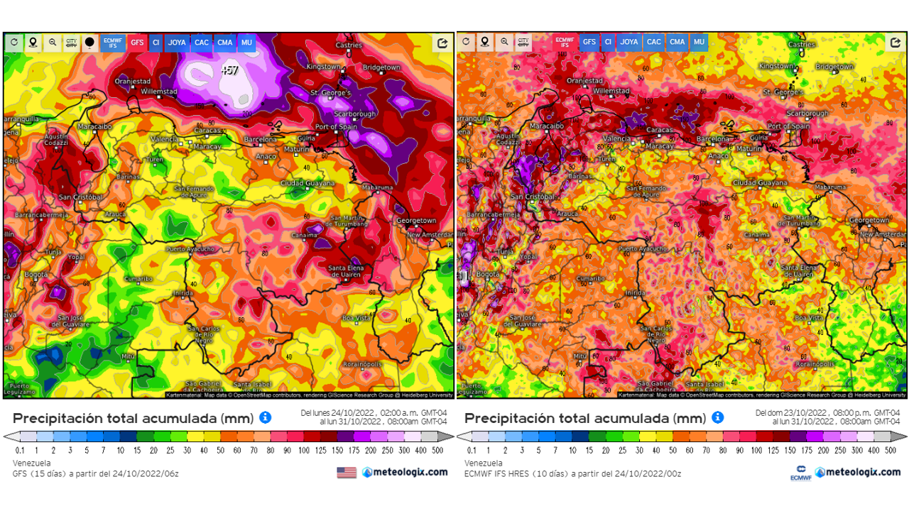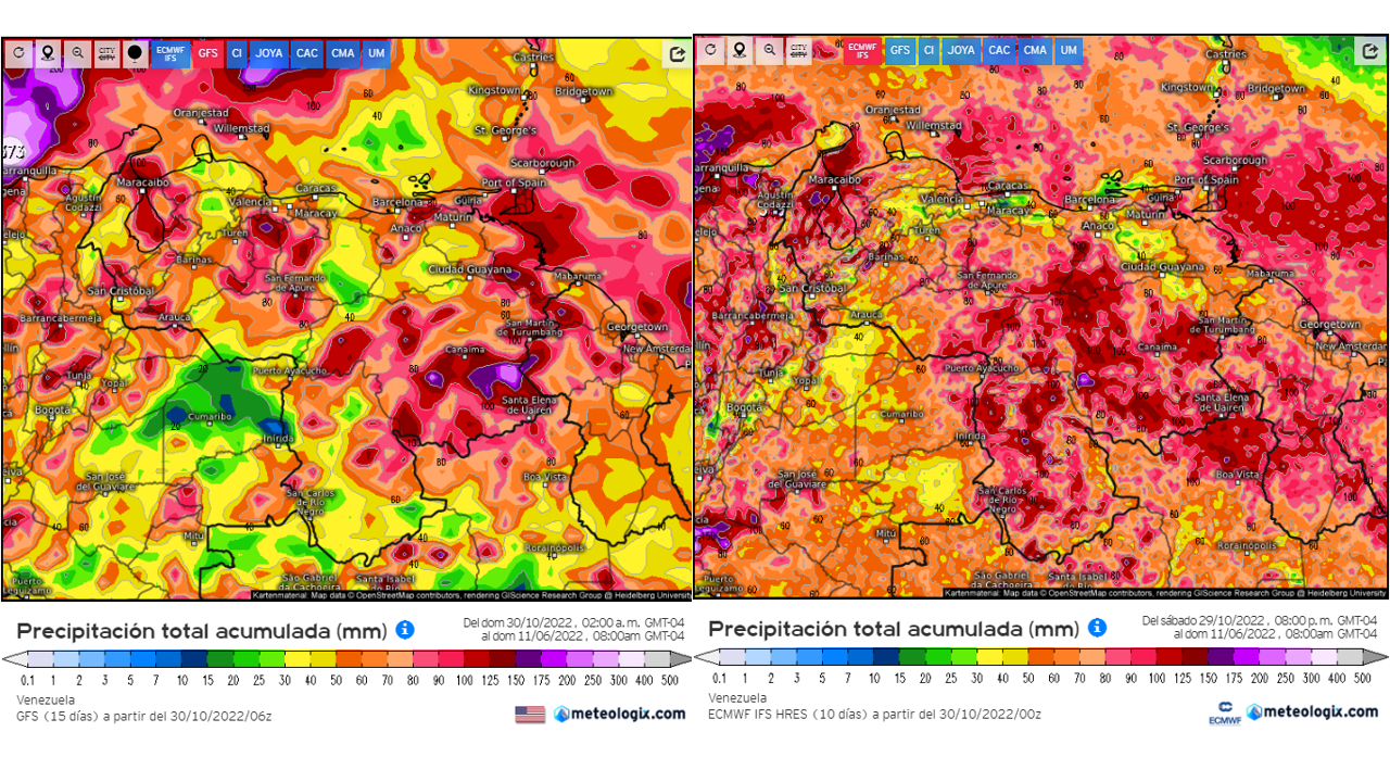 Pronostico de Anomalías Semanales para Venezuela, del 27/11 al 24/12/2022, usando datos del Modelo CFSv2 de NOAA y ECMWF. Nota: anomalías positivas, precipitaciones sobre la media y negativas por debajo de la media histórica (1999-2010). Anomalías negativas no significa que…