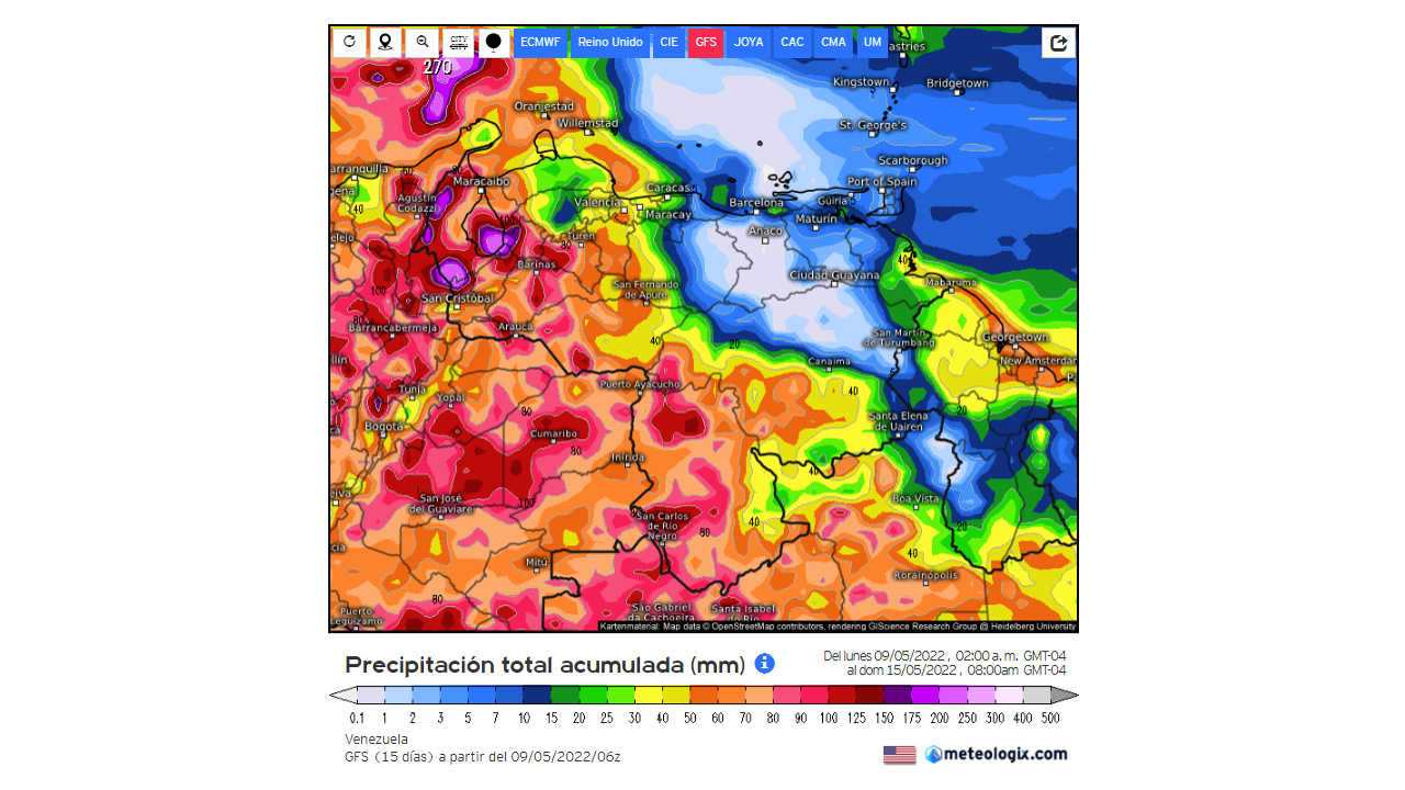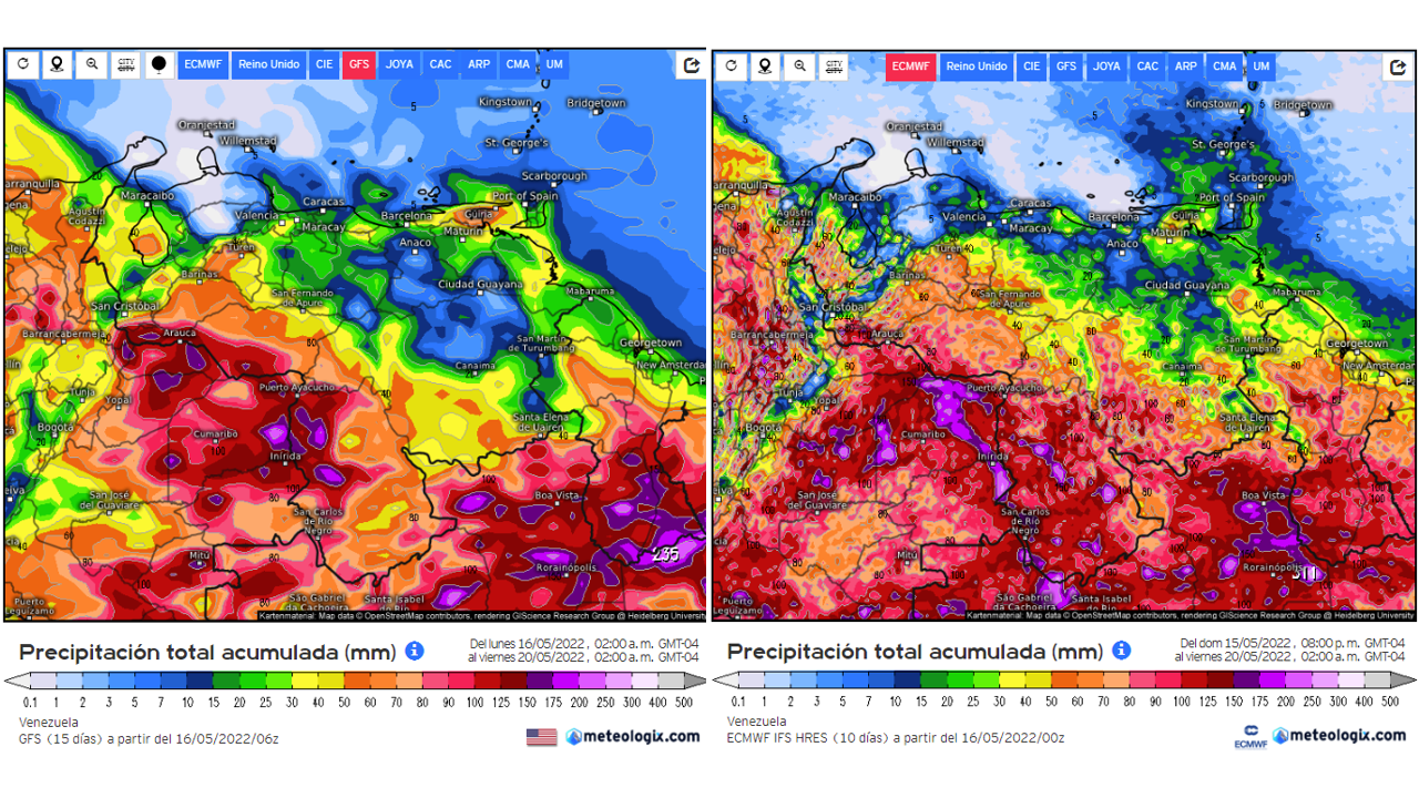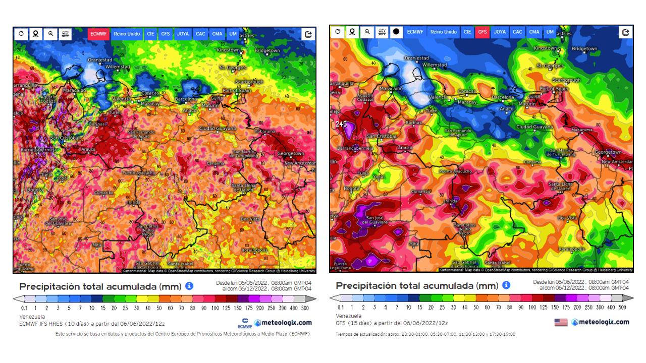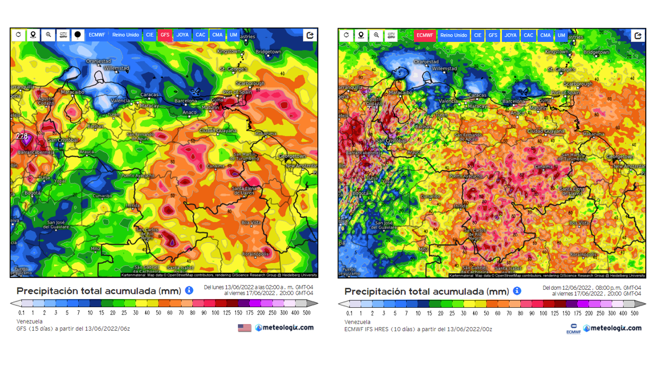 Pronostico de Anomalías Semanales para Venezuela, del 13/06 al 09/07/22, usando datos del Modelo CFSv2 de NOAA y ECMWF. Nota: anomalías positivas, precipitaciones sobre la media y negativas por debajo de la media histórica (1999-2010). Anomalías negativas no significa que…
