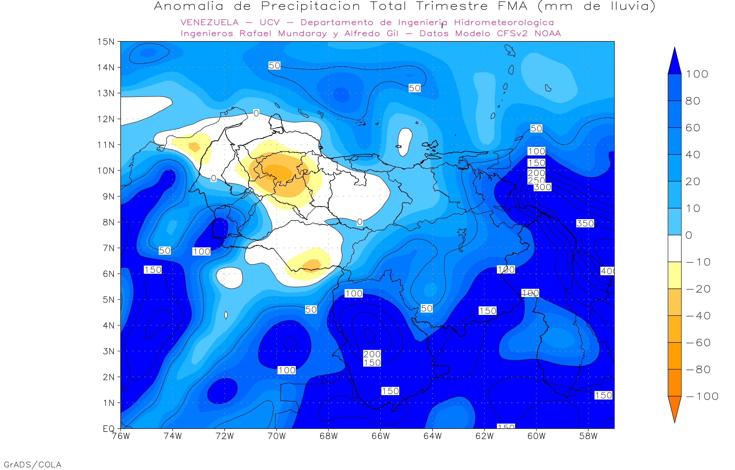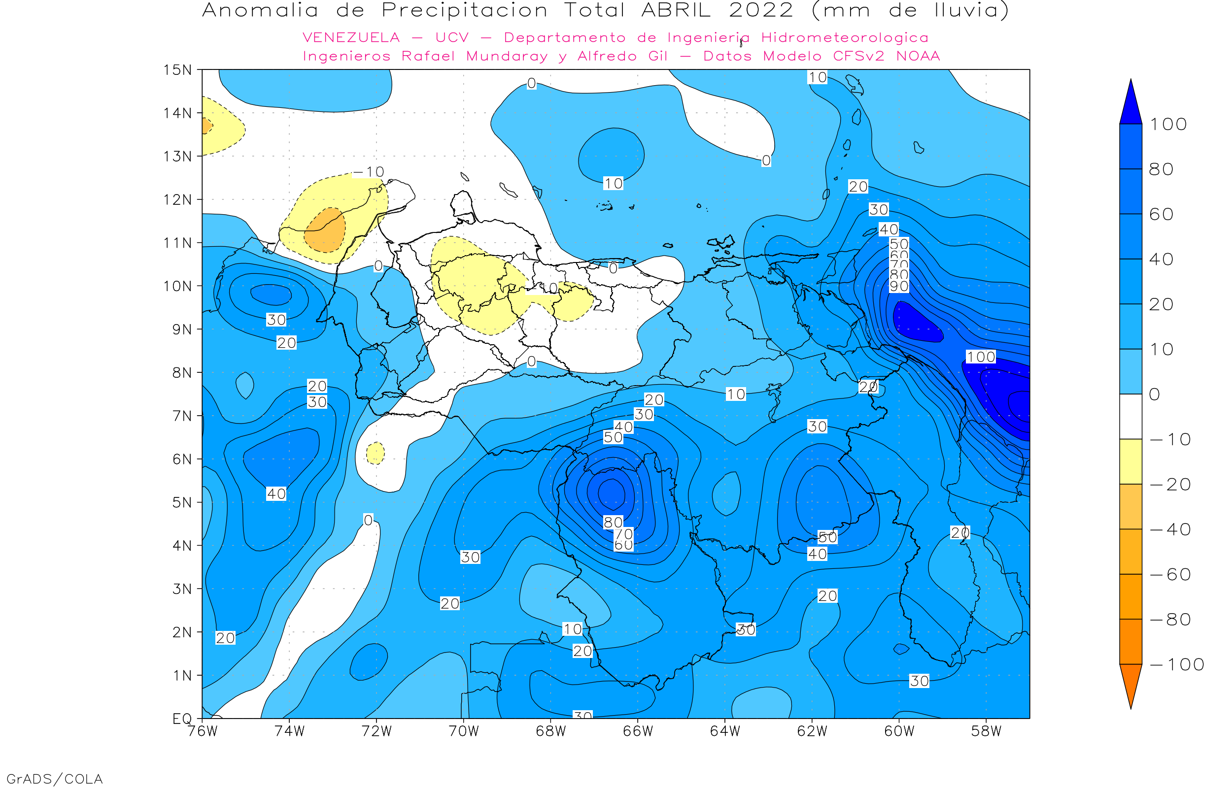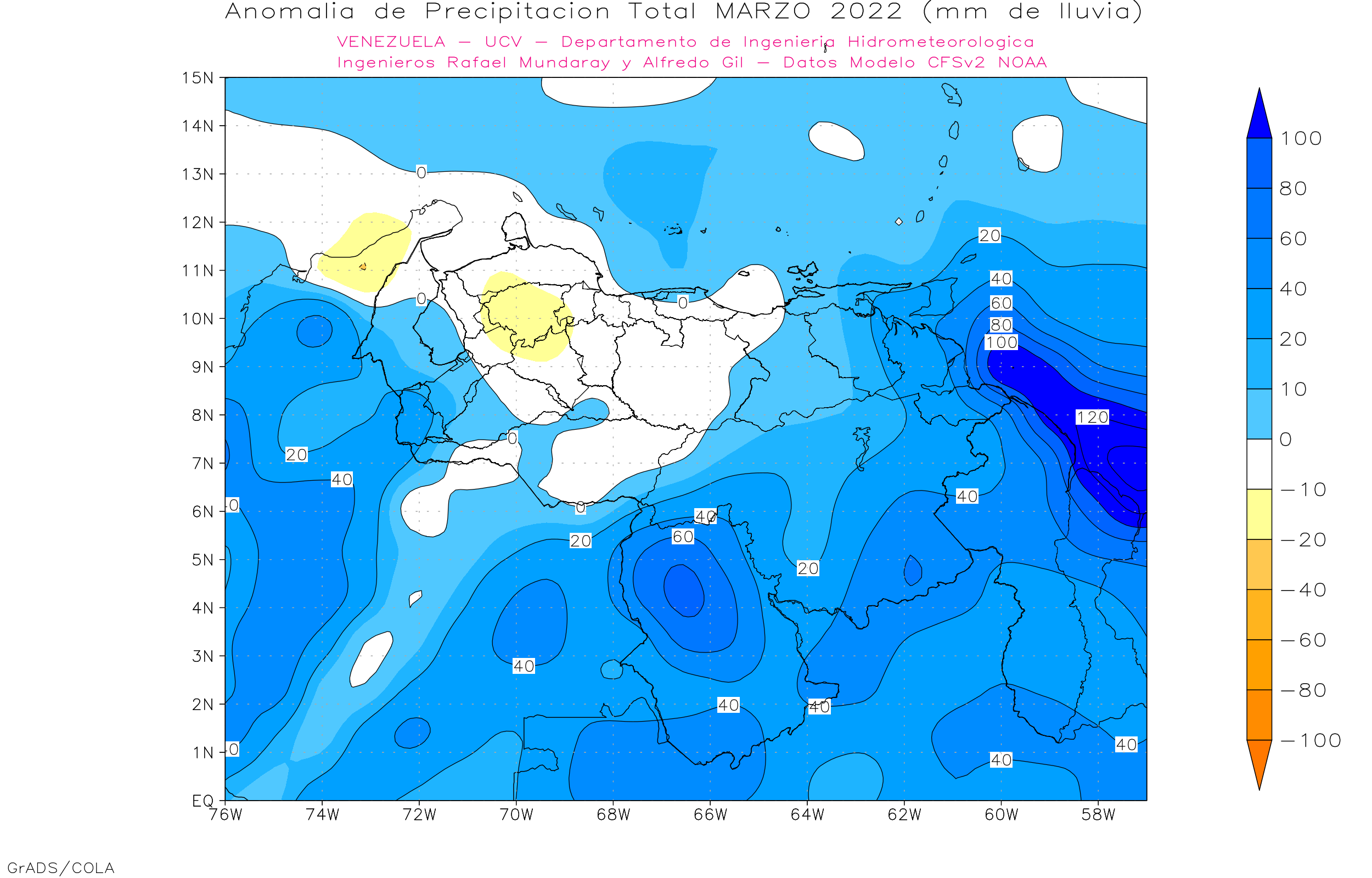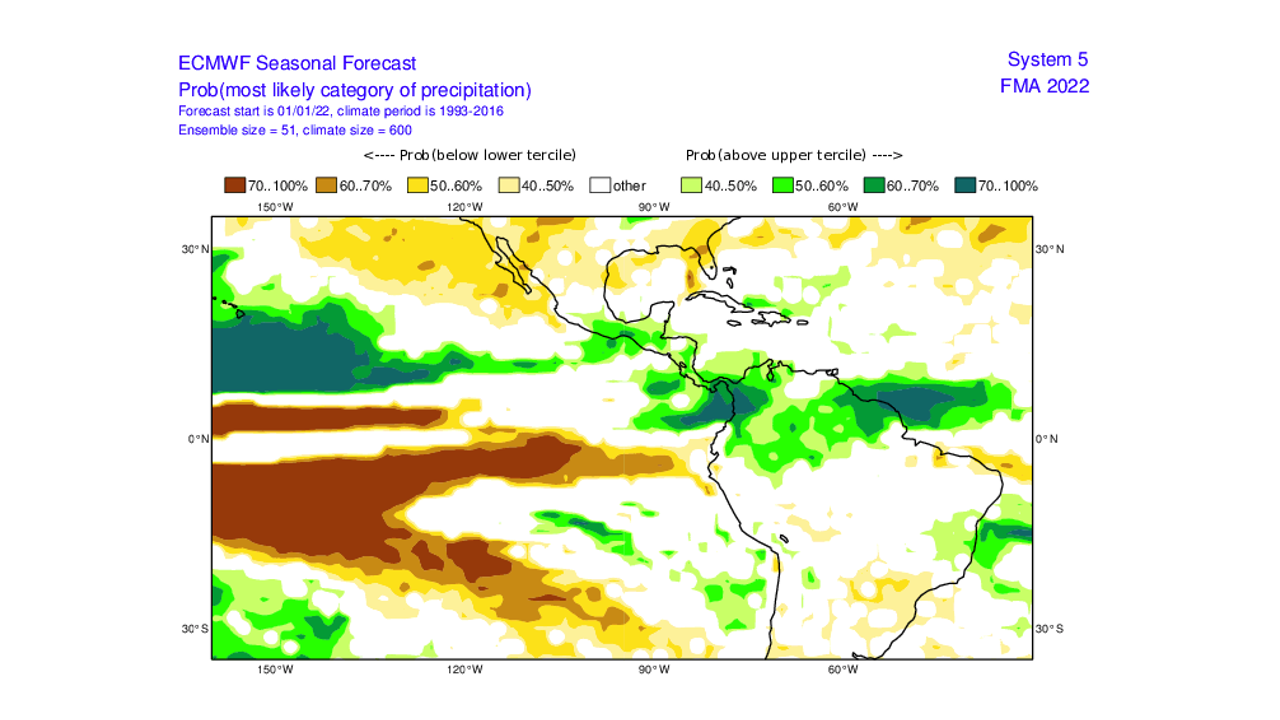 Evaluando 7 modelos de pronósticos estacionales de precipitaciones, de diferentes países (Met Office de Inglaterra, Deutscher Wetterdienst de Alemania, Meteo France de Francia, ECMWF europeo, IRI, e Integranted EUROBRISA de Brasil y CFSv2 de Estados Unidos).  Se observa que para el trimestre feb-mar+-abr/22, 7 de los modelos dan anomalías positivas al sur (en especial al sur de Bolívar y Amazonas). Los estados centrales (Aragua, Carabobo, Miranda, Vargas, Yaracuy y Guárico) 2  de los modelos dan  anomalías positivas y 5 precipitaciones promedio. Los estados occidentales (Zulia, Lara, Falcón) 3 modelos dan anomalías positivas, 2 precipitaciones cercanas al promedio y 2 anomalías nehgativas. La región andina (Táchira, Mérida y Trujillo) 7 modelos dan anomalías positivas de precipitación. Los llanos occidentales (Portuguesa, Apure, Barinas y Cojedes) 2 modelos dan anomalías positivas de precipitación y 5 modelos precipitaciones cercanas al promedio, y la región oriental (Anzoátegui, Sucre, Monagas y Delta Amacuro) 4 modelos dan anomalías positivas y 3 modelos precipitaciones cercanas al promedio.