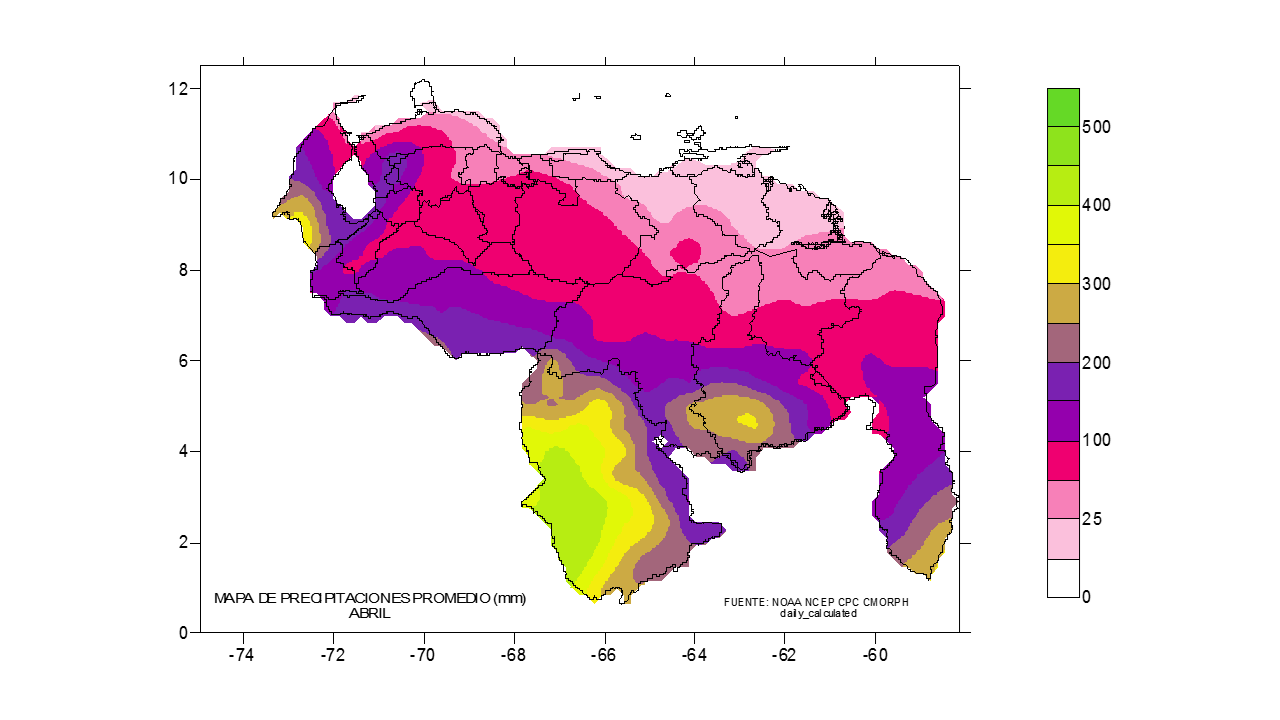 En los mapas sw la estadística de la precipitación estimada ( NOAA NCEP CPC CMORPH, daily_calculated) durante los meses febrero, marzo y abril, se observa como la precipitación  va subiendo hacia el norte, en dos primeros mes los eventos importante se ubican hacia el sur (Bolívar y Amazonas), luego se va desplazando en abril hacia los llanos occidentales y oeste de Zulia
