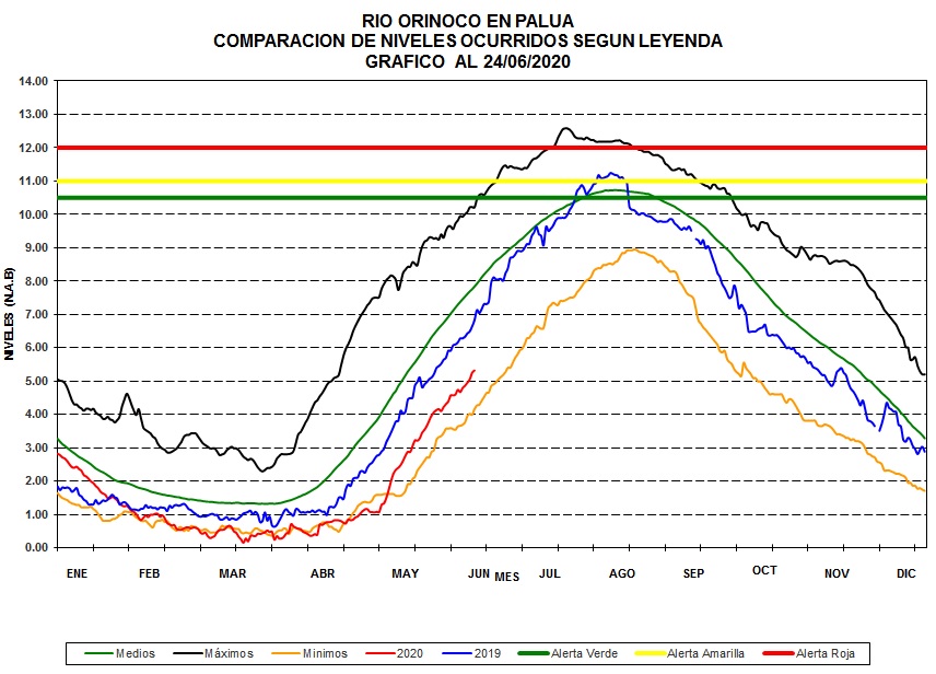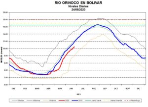 La estación río Orinoco en Palua, el nivel para la fecha se ubica 2.52 m por debajo de la media, se mantiene la tendencia de sus niveles por debajo de la media