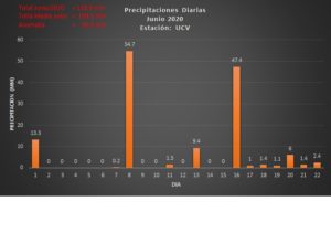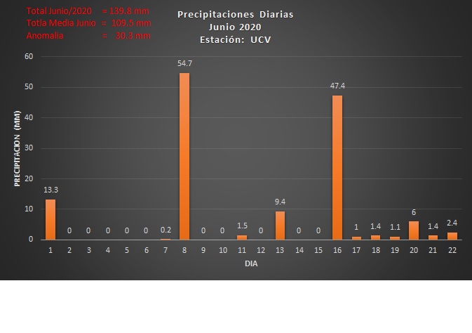 Los únicos datos que se disponen son de la estación UCV, gracias al esfuerzo del Dpto. de Ingeniería Hidrometeorológica, Escuela de Ing. Civil, Fac. de Ingeniería, que se operar diariamente durante la cuarentena, donde se aprecia anomalías positiva.