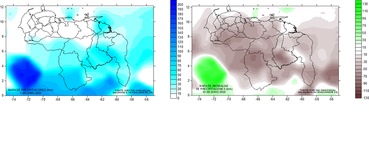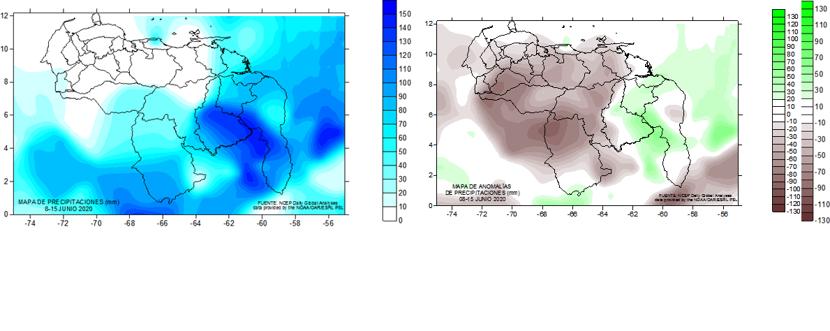 Durante la semana del 1 al 8 de junio, se aprecia mayor cantidad de lluvias, que del 8 al 16, pero esta con menor anomalías negativas. La semana del 15 al 22 se presentaron mas volumen de lluvias que la semana de 8 al 15, pero menos que del 1 al 8. Las anomalías menores que las semanas anteriores.