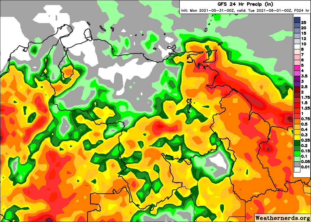 PRONOSTICO DE ANOMALÍAS SEMANALES DE PRECIPITACIÓN, DURANTE EL PERIODO DEL 31/05 AL 27/06 DE 2021 Semanales para Venezuela, del 31/05 al 27/06 de 2021, usando datos del Modelo CFSv2 de…