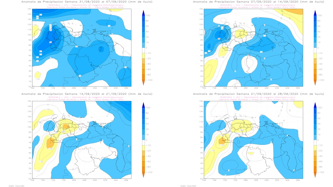 PRONOSTICO DE ANOMALÍAS SEMANALES, DURANTE EL PERIODO 31/08 HASTA AL 28/09 DE 2020. Pronostico subestacional de Anomalías de Precipitaciones Semanales para Venezuela, entre 31/08 al 28/09 de 2020,…