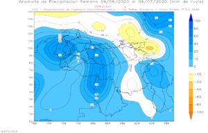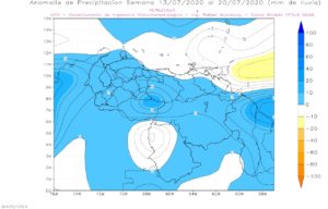 La semana del 13 al 20 de julio de 2020, anomalías positiva en casi todo el territorio nacional , exceptuando amazonas con precipitaciones dentro de lo normal.