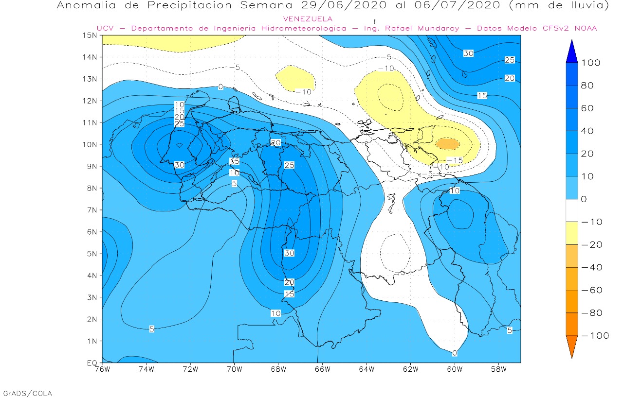 Se observa que la ultima semana de junio, presenta déficit en la región central, el oriente y cuenca del Caroní, anomalías positivas en la región de los andes , sur del lago y llanos occidentales, precipitaciones dentro de lo normal Falcón, Lara, sur de Amazonas y Delta Amacuro.