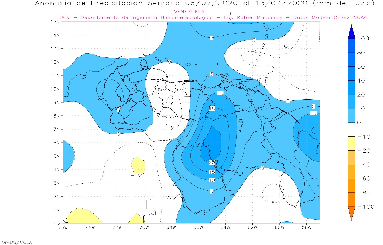 La semana entre el 06 y 13 de julio de 2020, se presentan anomalías positivas en el oriente, cuenca del Caroní, occidente y los andes, la región central con lluvias en promedio.
