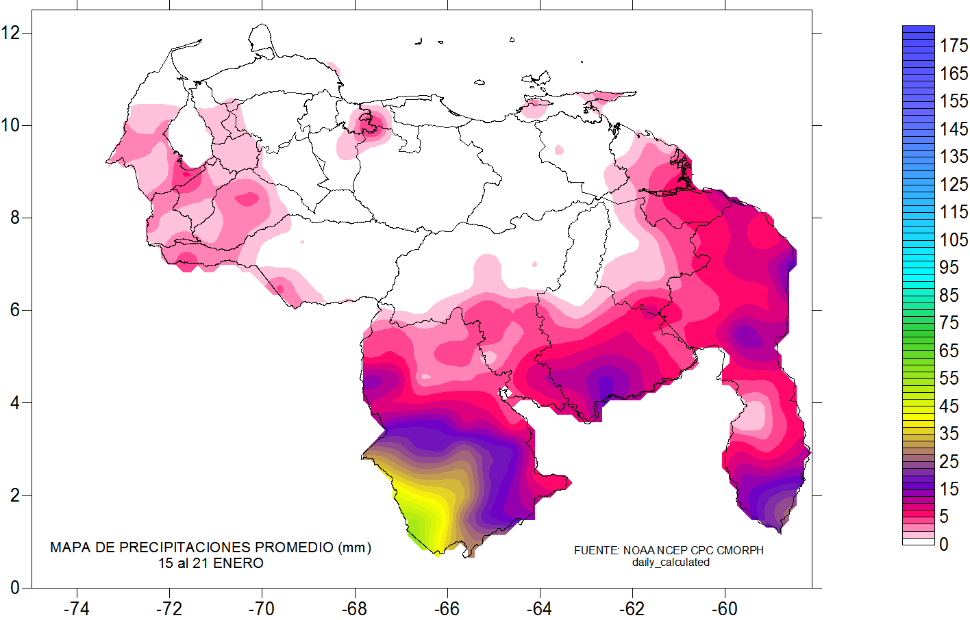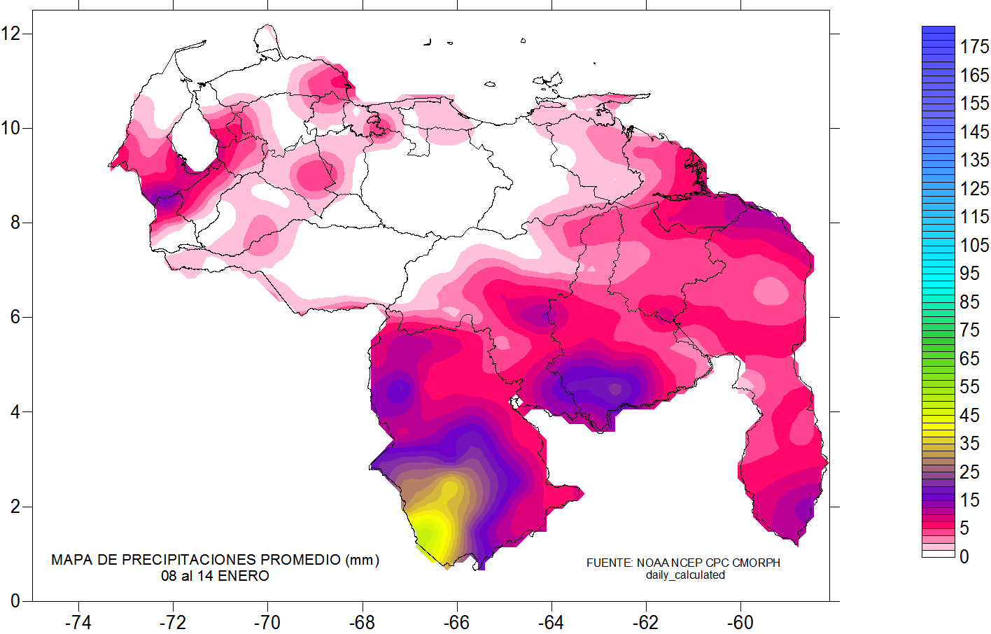 De acuerdo a la estadística de las precipitaciones estimadas para esta semana, se observa que los eventos más importantes se mantiene al sur del país . Ya se observa que las lluvias por encima de los 50 mm se ubican al sur de de los estados Bolívar y Amazonas, precipitaciones por debajo de los 5 mm al norte de 6° norte, se observan precipitaciones en los llanos occidentales por debajo de 1 mm.