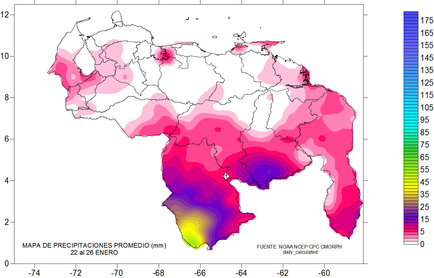 De acuerdo a la estadística de la precipitación estimada ( NOAA NCEP CPC CMORPH, daily_calculated) durante el periodo del 01 al 28/01/2023, se observa que los principales eventos de precipitaciones ocurren al sur del país (Amazonas y Bolívar). Los eventos por encima de los 40 mm se ubican al sur de los 2° norte, vienes bajando los valores con respecto. a las semanas anteriores y los llanos centrales y occidentales para la IV semana presenta precipitaciones promedio por debajo de los 2 mm.