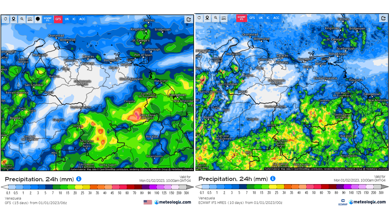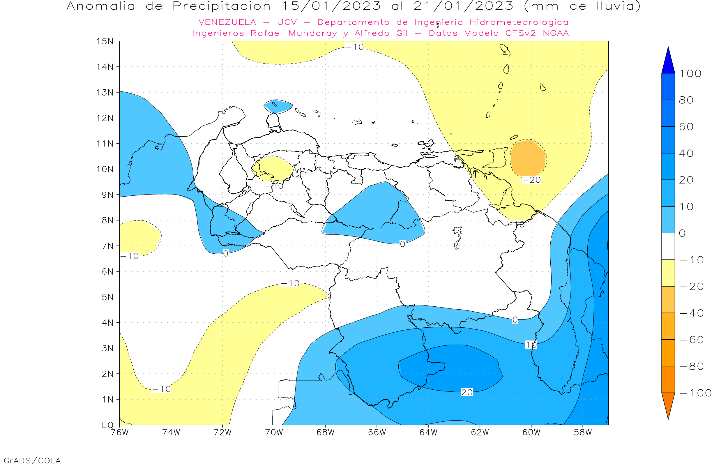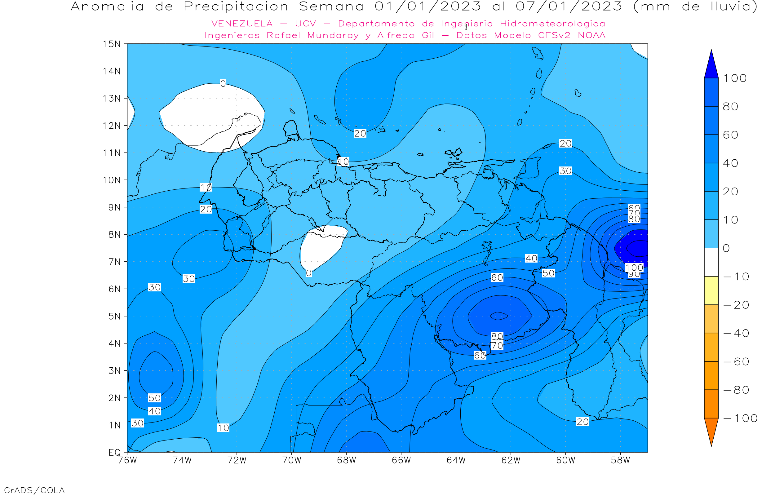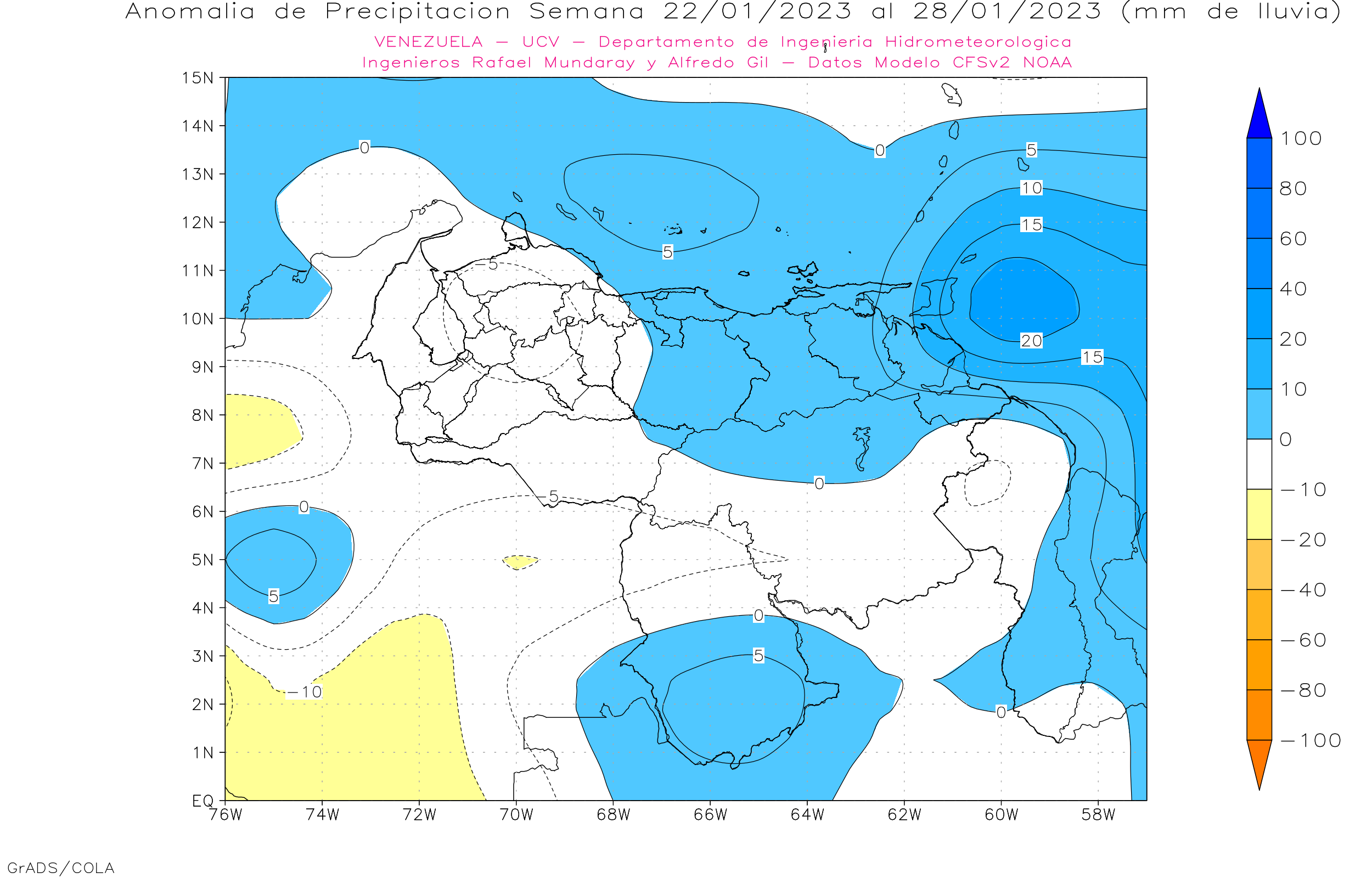 Pronostico de Anomalías Semanales para Venezuela, del 01 al 28/01/2023, usando datos del Modelo CFSv2 de NOAA y ECMWF.
