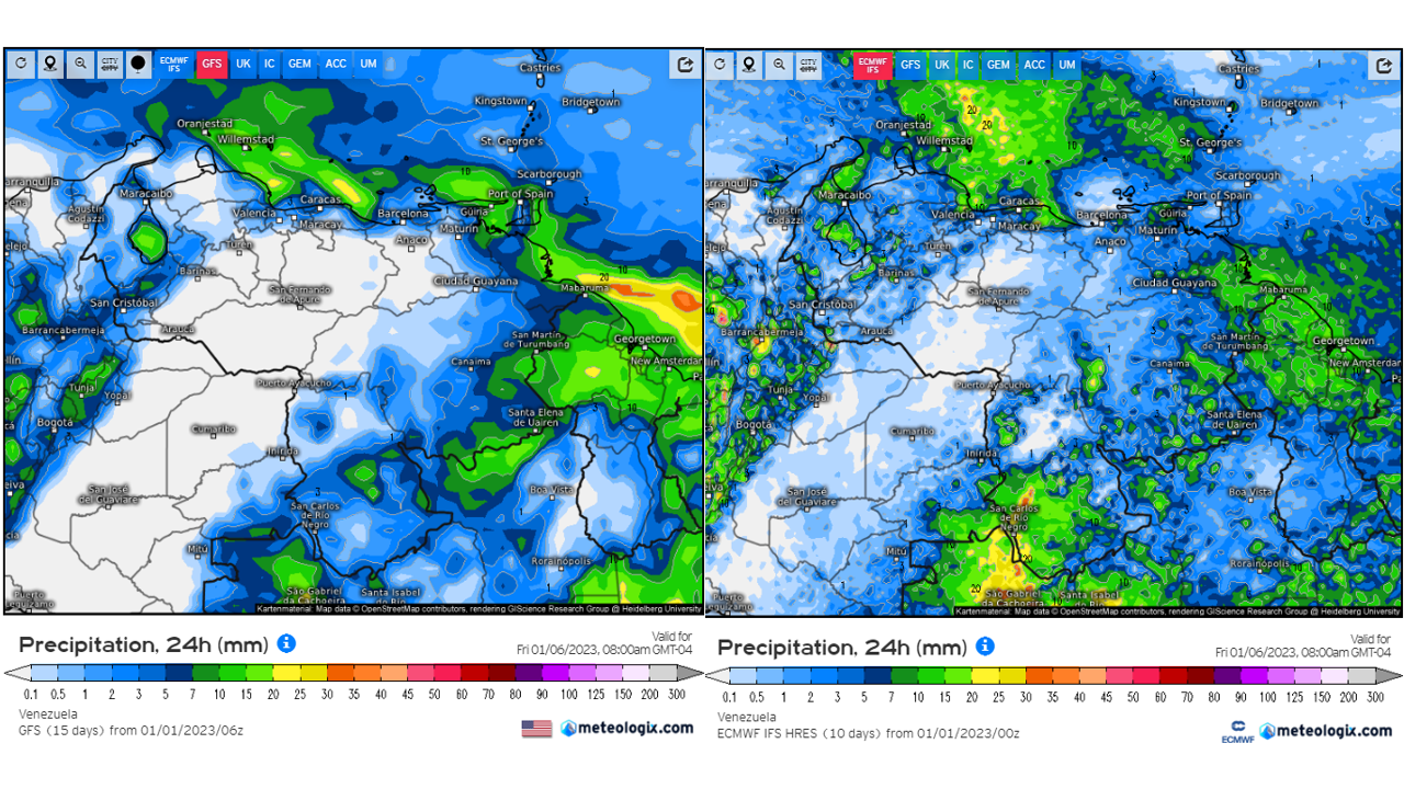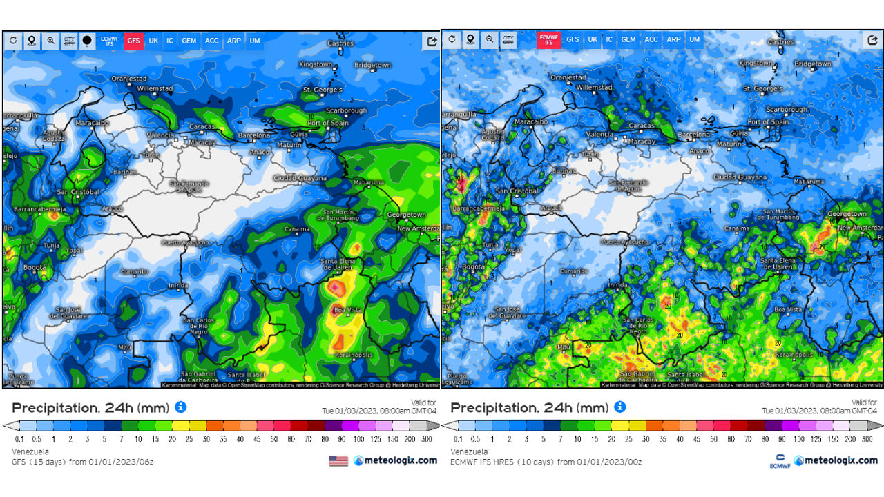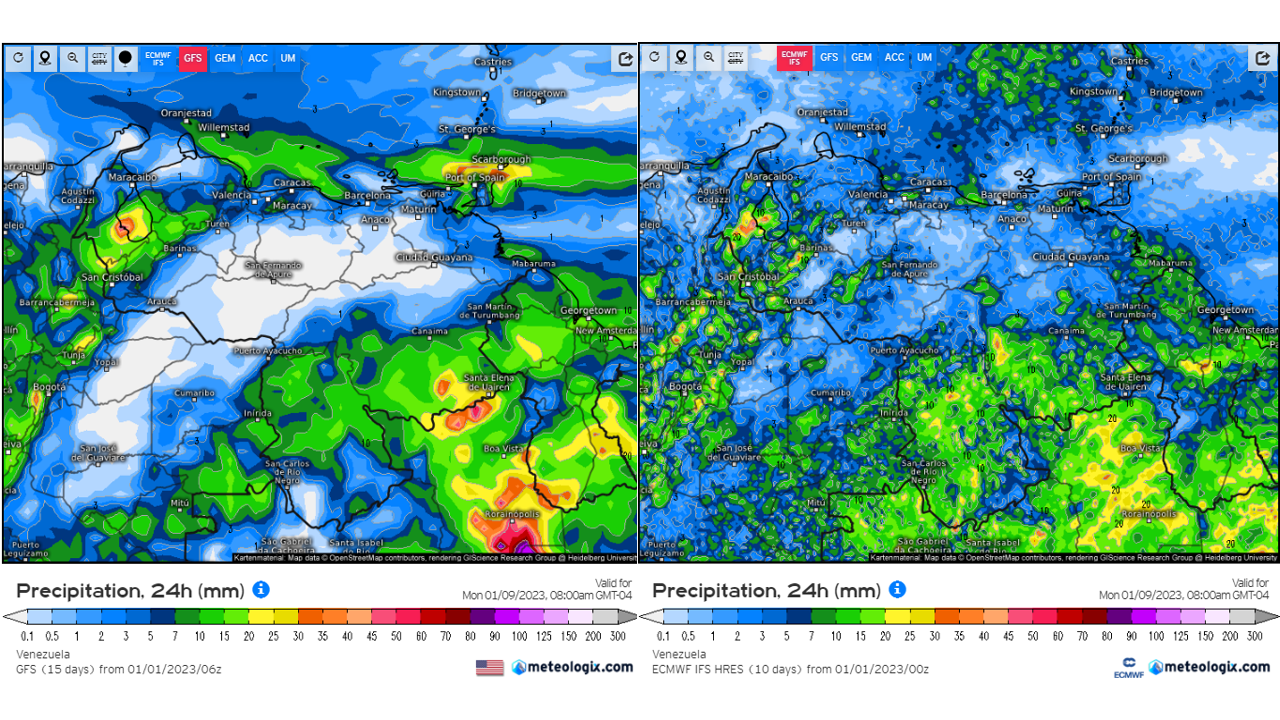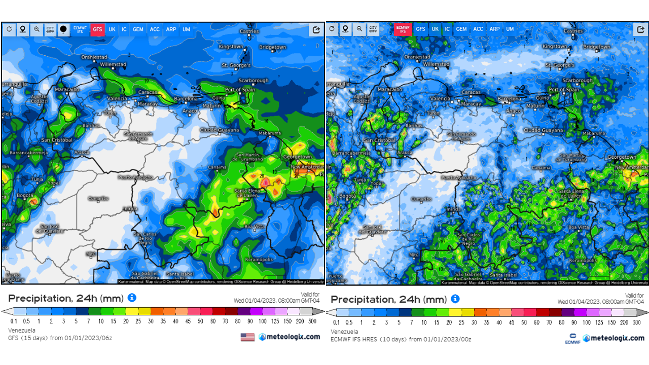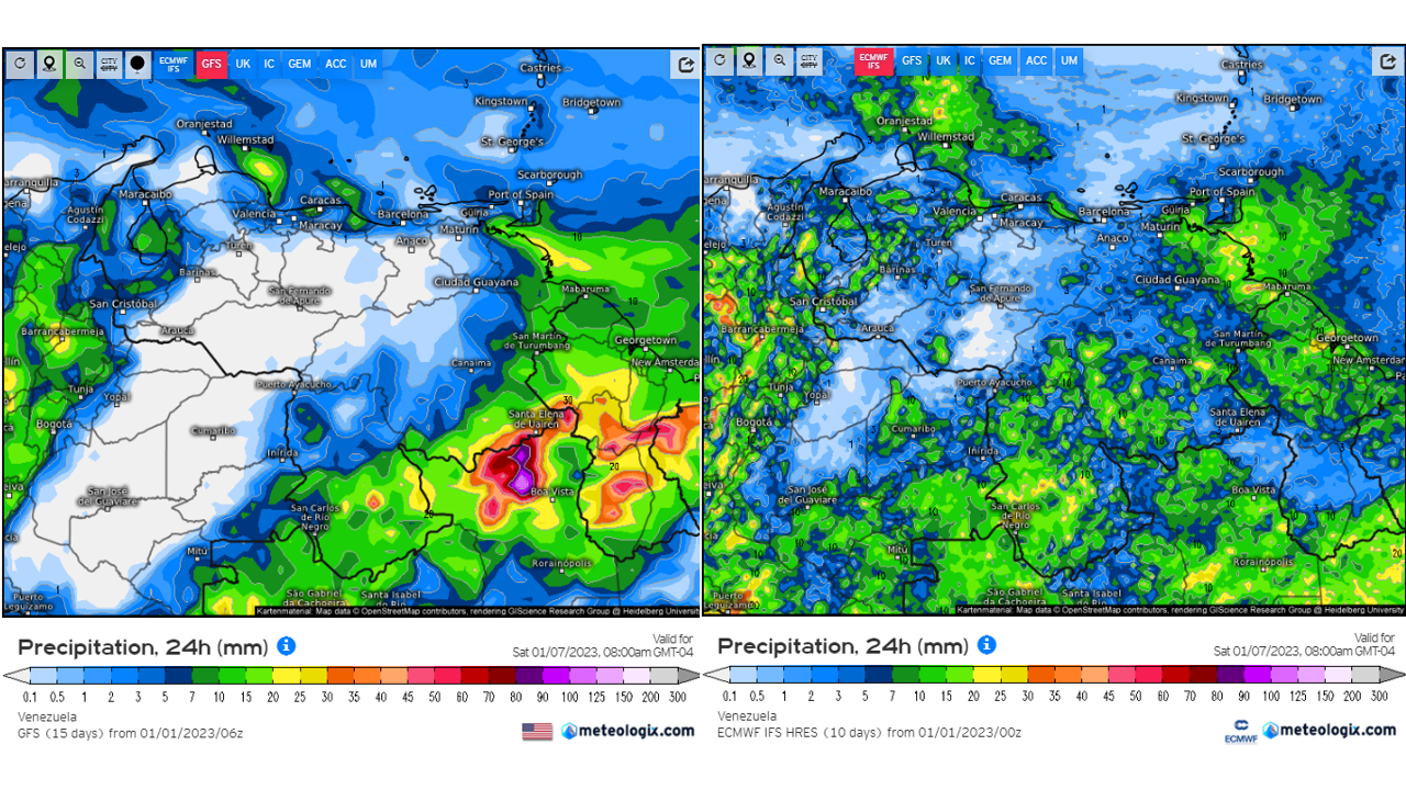 El modelo GFSv2 prevé en general eventos de precipitaciones dentro del promedio histórico en casi todo el territorio nacional. Las anomalías positivas mas importantes al sur de los estados Bolívar, Amazonas y Táchira.