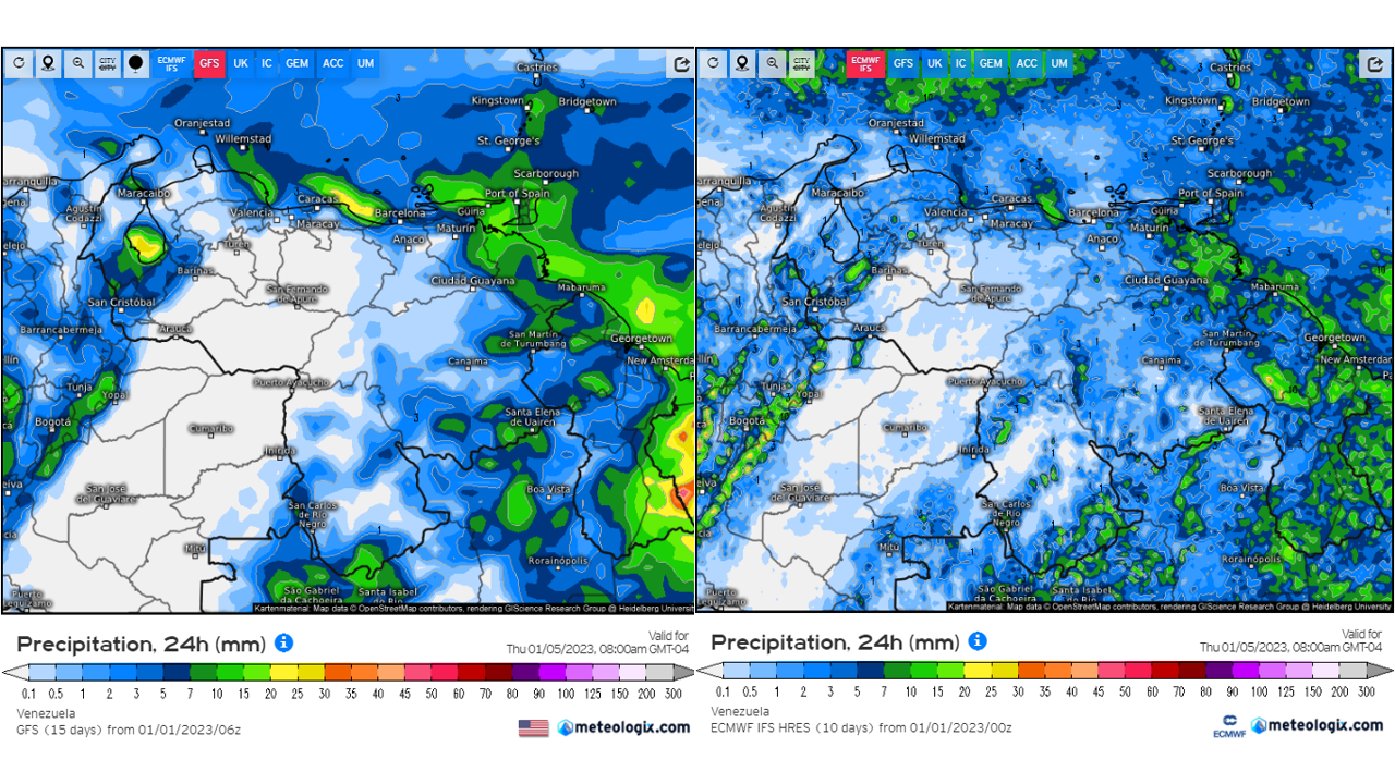 El modelo GFSv2 prevé en general eventos de precipitaciones dentro del promedio histórico en casi todo el territorio nacional. Las anomalías positivas mas importantes al sur de los estados Bolívar, Amazonas, Suroeste de Zulia, Mérida y Táchira.
