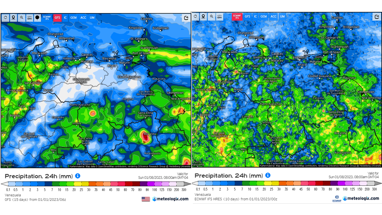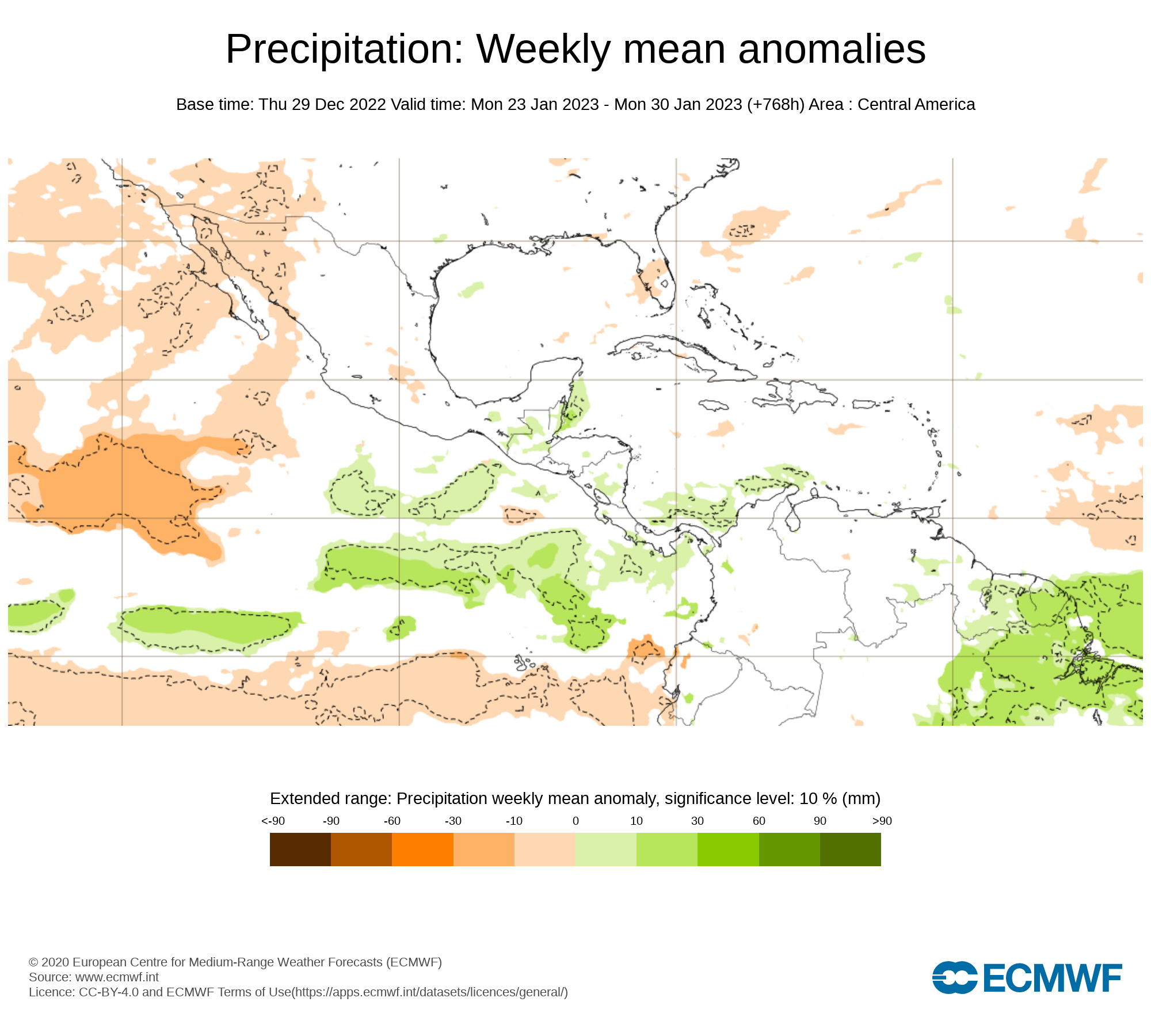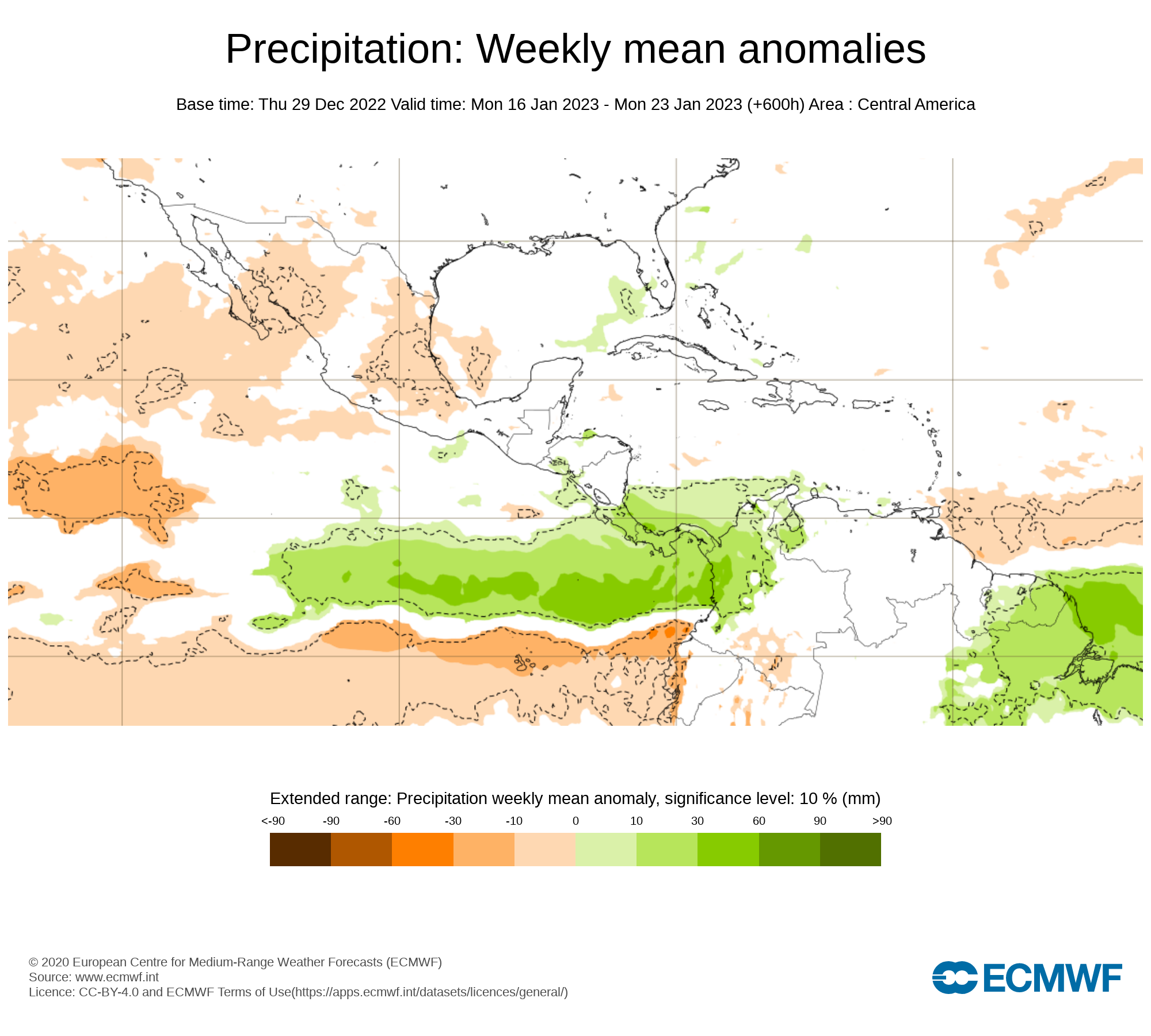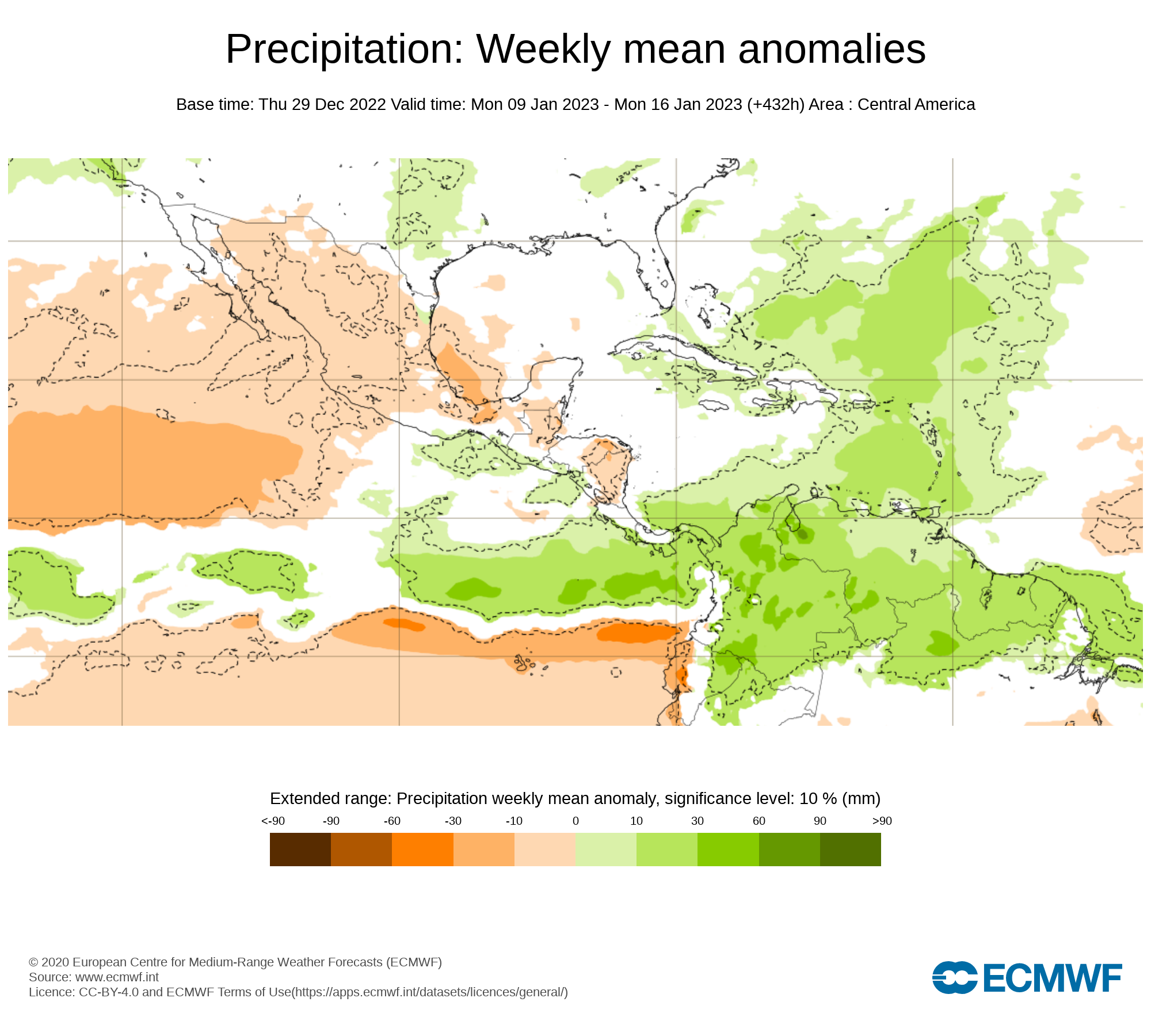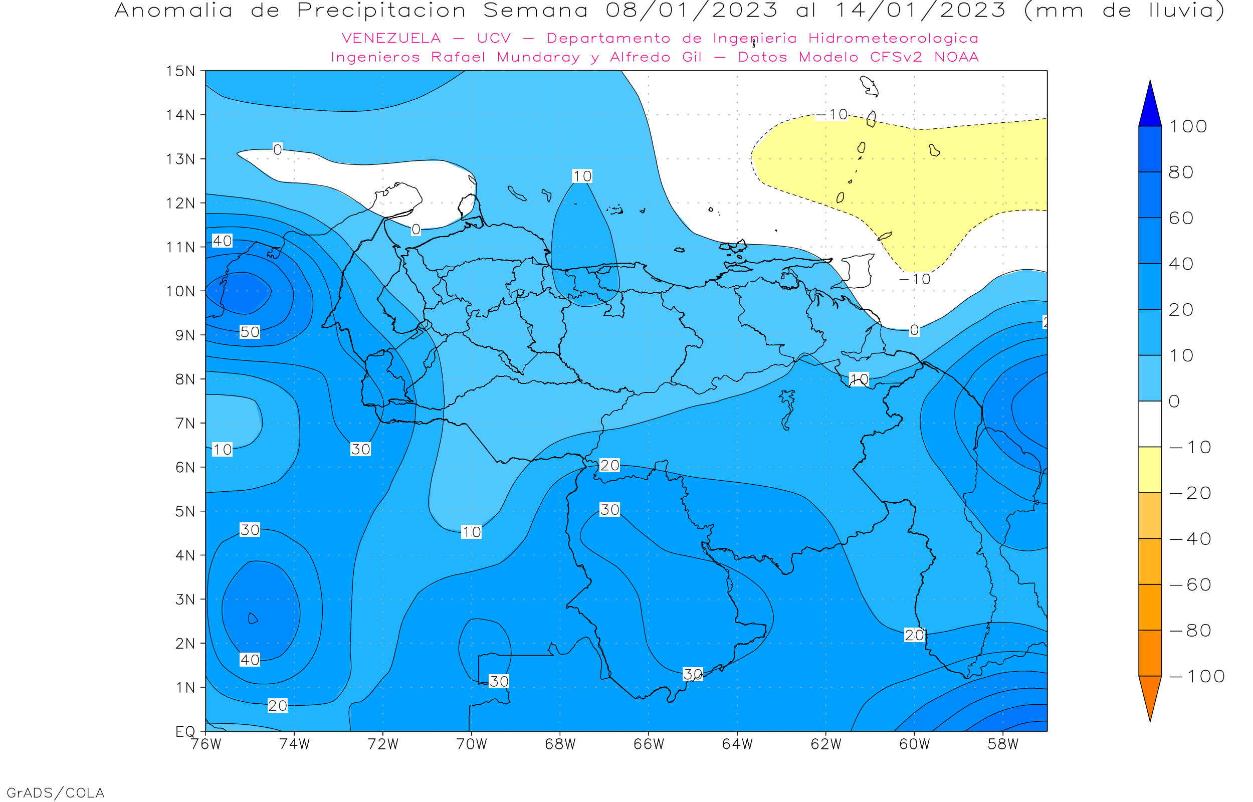 El pronostico semanal emitido por European Centre for Medium-Range Weather Forecast (ECMWF), se esperan eventos de precipitaciones promedio sobre el territorio nacional. Las anomalías positivas mas importantes en los andes, Zulia, Amazonas, Bolívar, región centro norte costera, oeste de los estados Falcón y Lara.