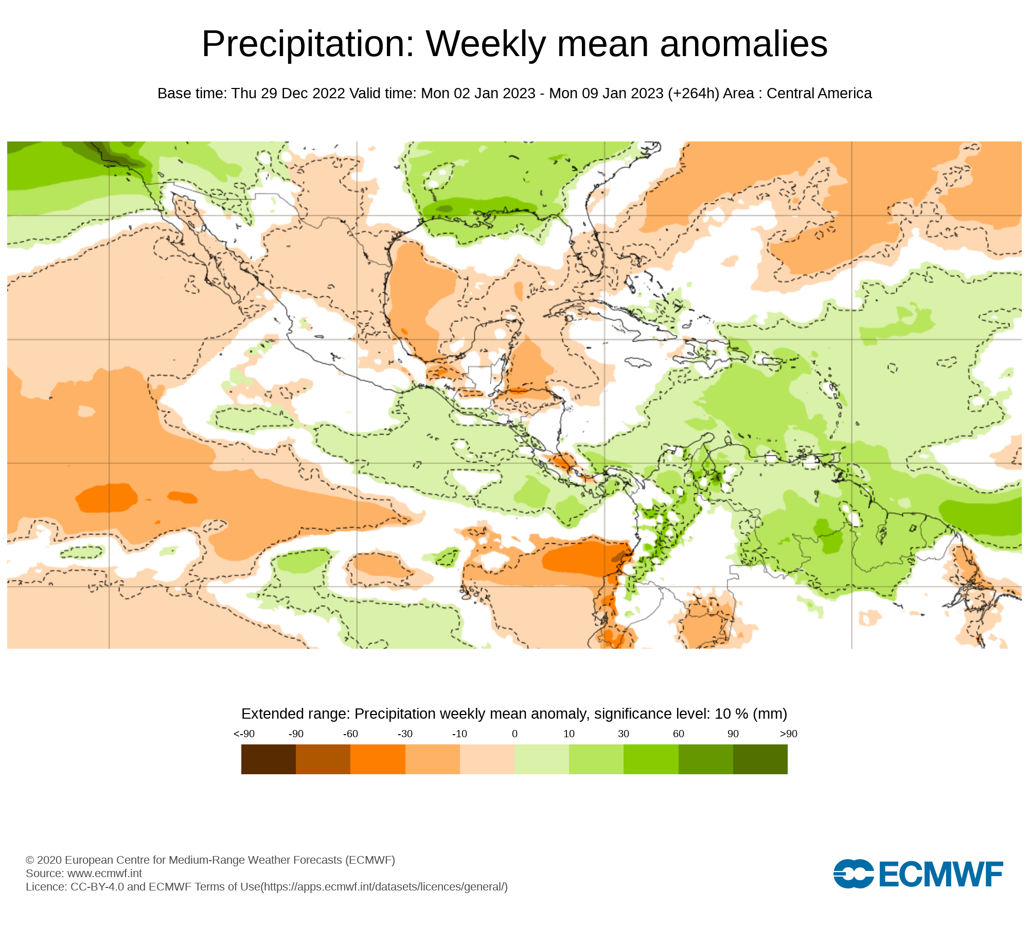 El pronostico semanal emitido por European Centre for Medium-Range Weather Forecast (ECMWF), se esperan eventos de precipitaciones promedio sobre el territorio nacional.