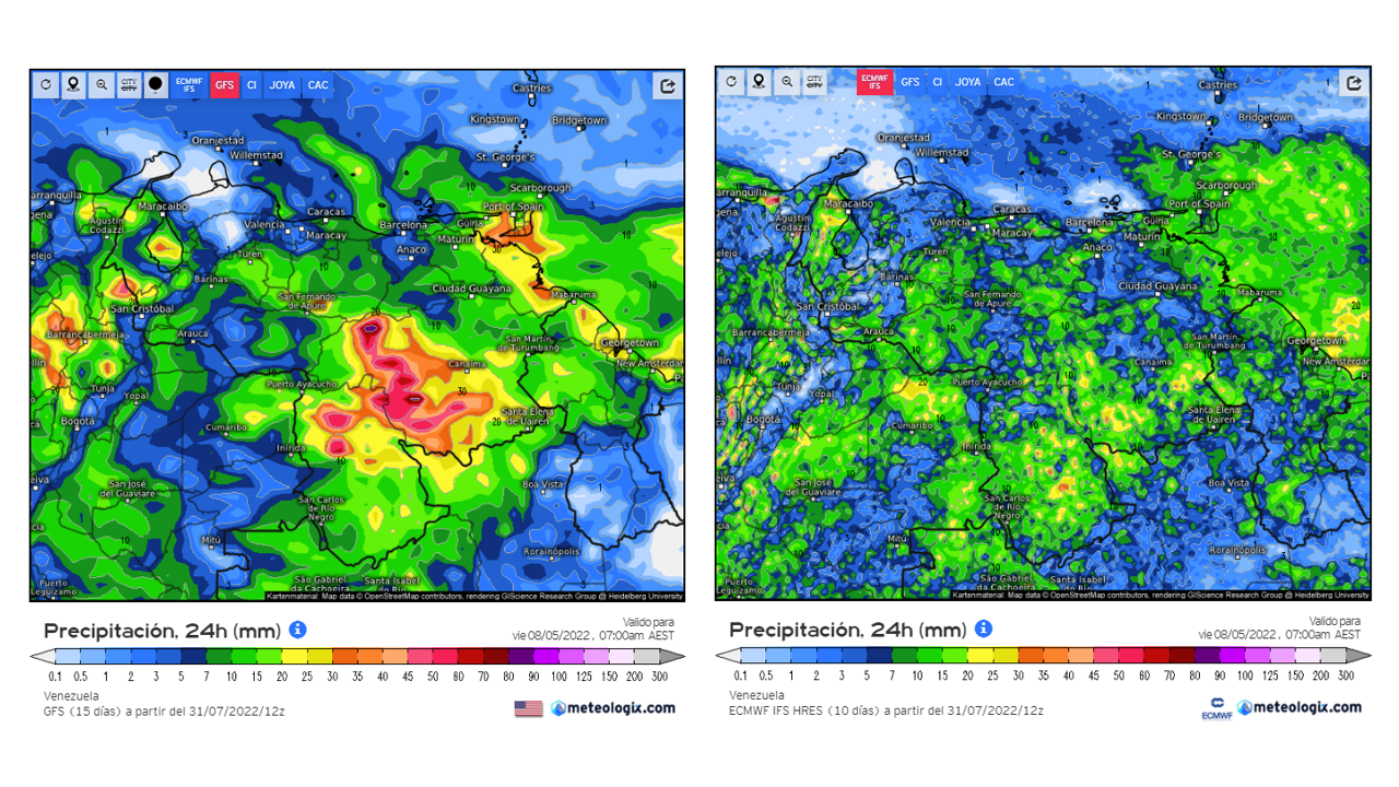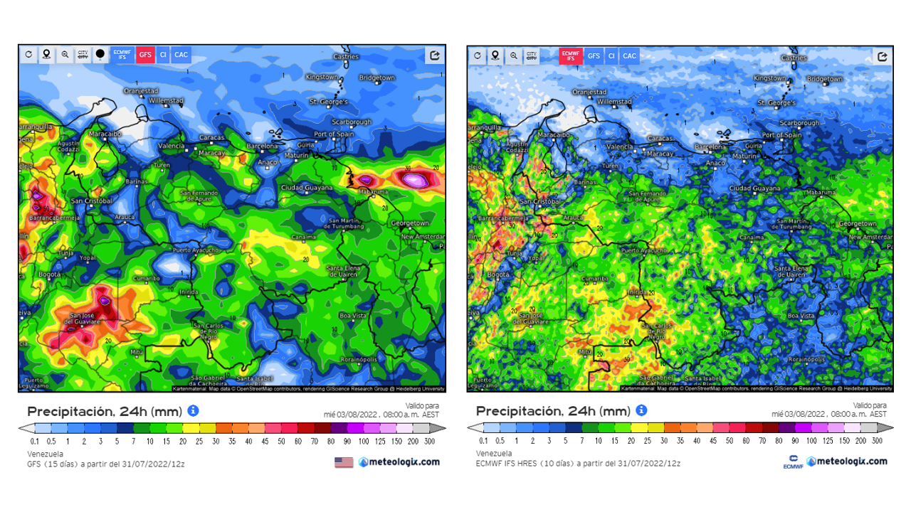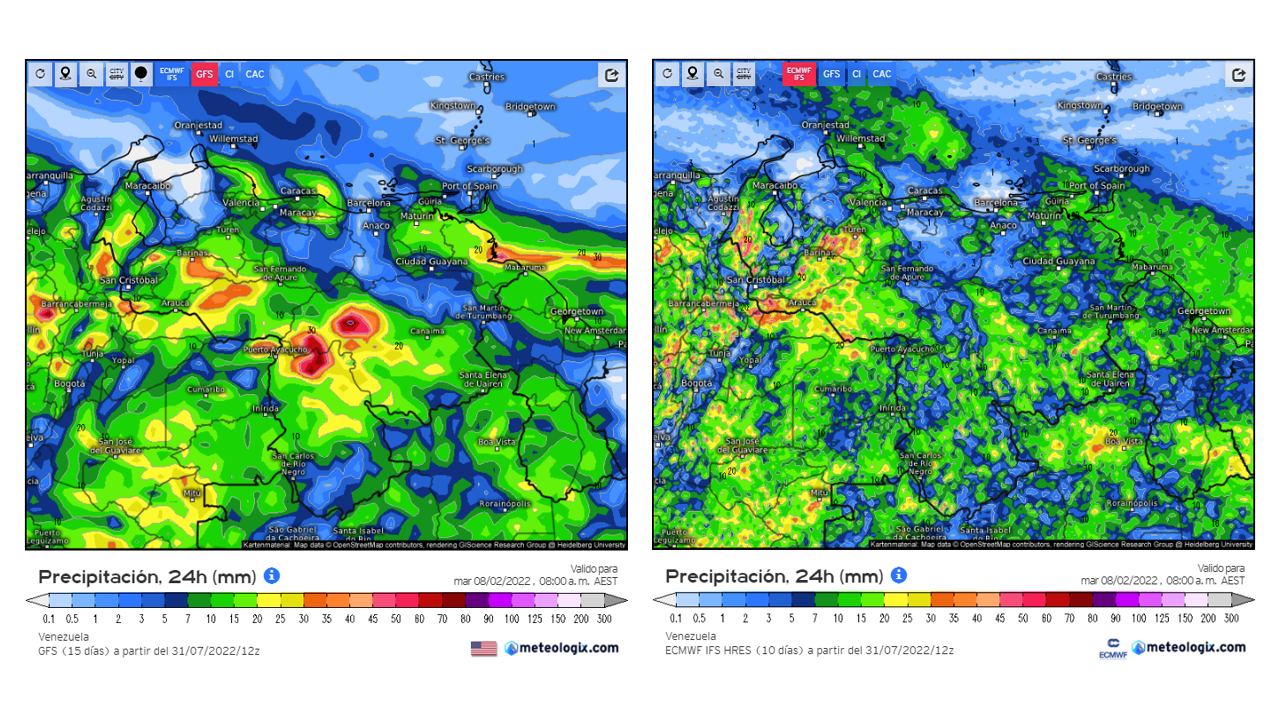 El pronostico semanal emitido por European Centre for Medium-Range Weather Forecast (ECMWF), se esperan eventos de precipitaciones promedio sobre el territorio nacional, las anomalías más importantes se esperan en Zulia, los andes, Falcón y llanos occidentales.