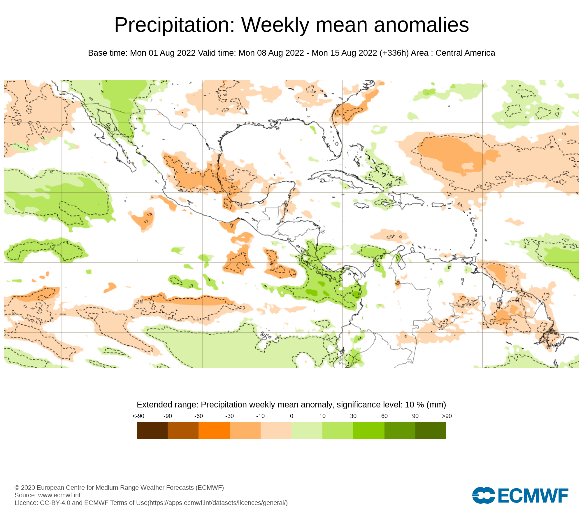 El pronostico semanal emitido por European Centre for Medium-Range Weather Forecast (ECMWF), se esperan eventos de precipitaciones promedio sobre el territorio nacional, las anomalías mas importantes se esperan en Zulia, los andes, Falcón y Bolívar.
