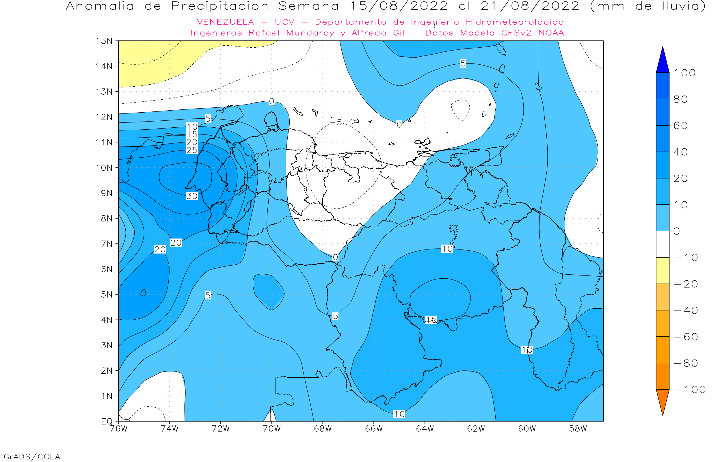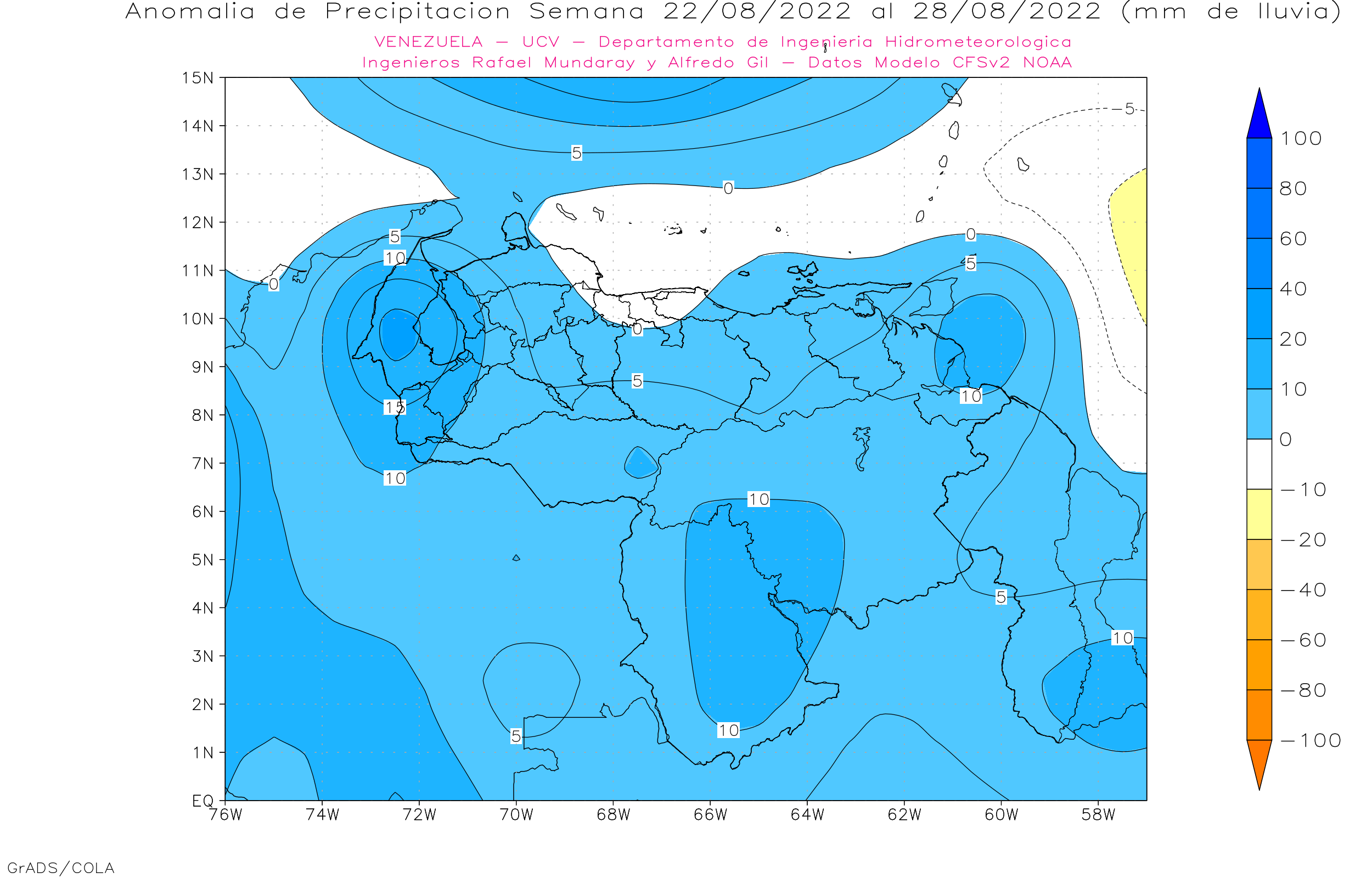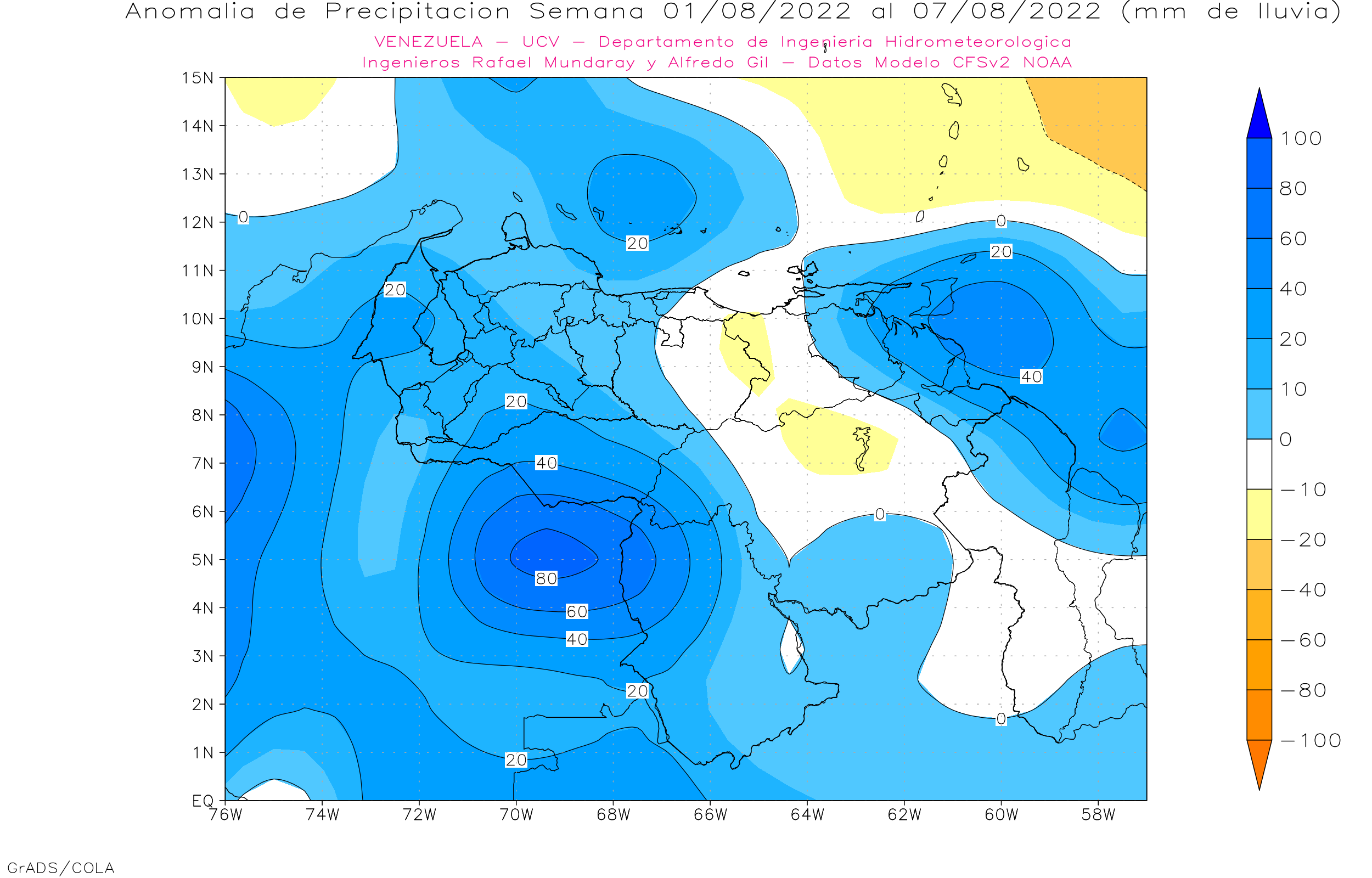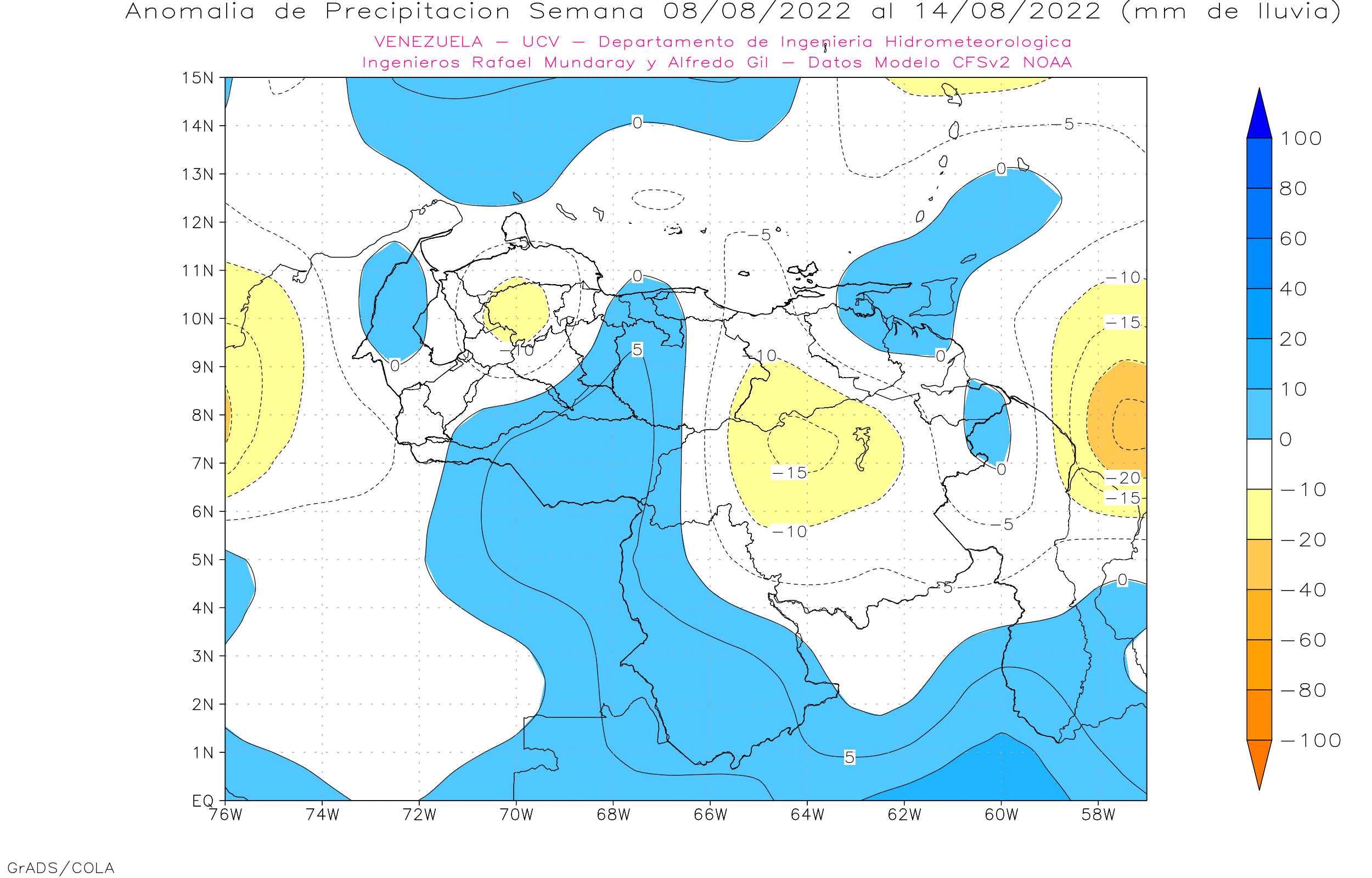 Pronostico de Anomalías Semanales para Venezuela, del 01 al 28/08/22, usando datos del Modelo CFSv2 de NOAA y ECMWF.
