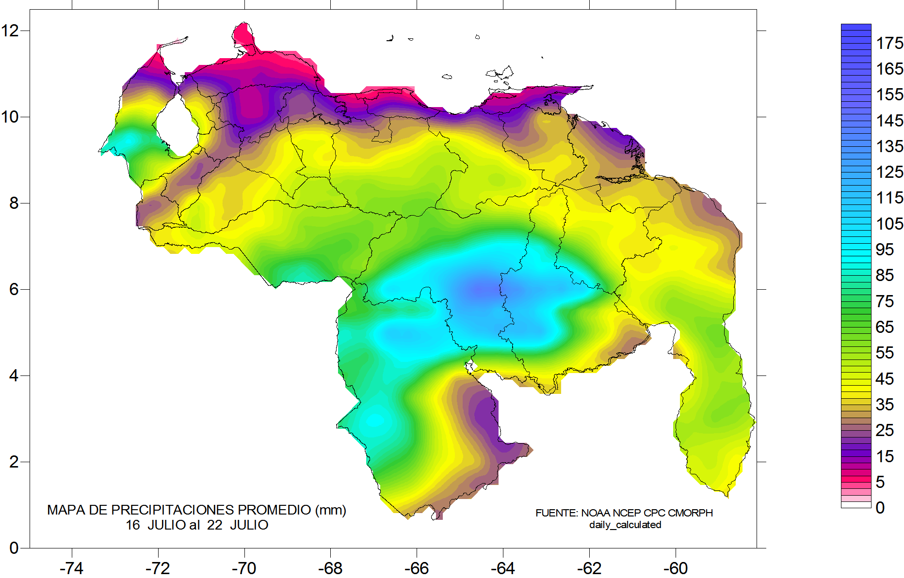 De acuerdo a la estadística de las precipitaciones estimadas para esta semana, se observa que los eventos más importantes se mantiene al sur del país y suroeste de Zulia, pero una reducción hacia el sureste de Amazonas con valores cercanos a 35 mm, los centro de alta precipitación cercanos a 85 en casi toda Amazonas y mayores de 110 mm en el suroeste de Bolívar. Lluvias por encima de los 75 mm se ubican al sur de 9° norte. Los llanos occidentales mantiene los eventos de precipitaciones entre 45 y 75 mm, la región nor central y oriental con valores entre 5 y 20 mm, al sur de los estados Anzoátegui y Monagas centro de 45 mm. Oeste de Zulia con centro de lluvias de 90 mm. Falcón y Lara con centro de precipitaciones de entre 5 y 15 mm.