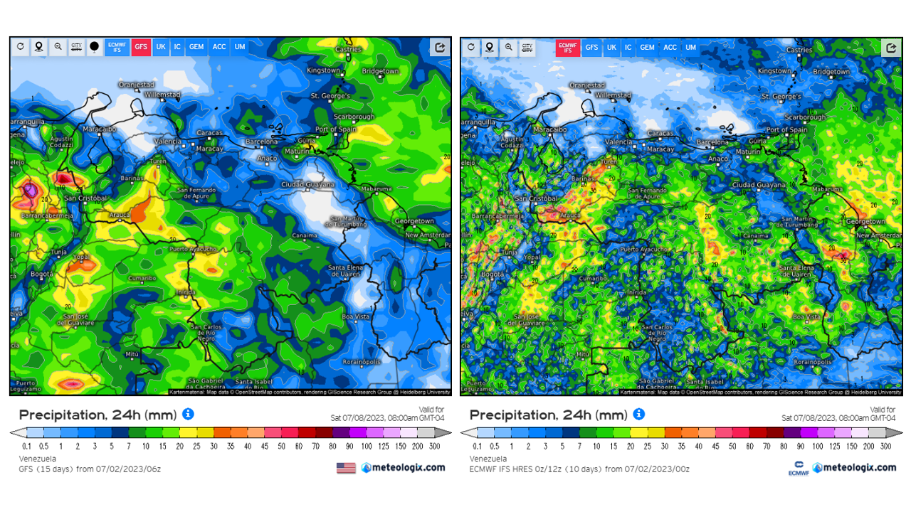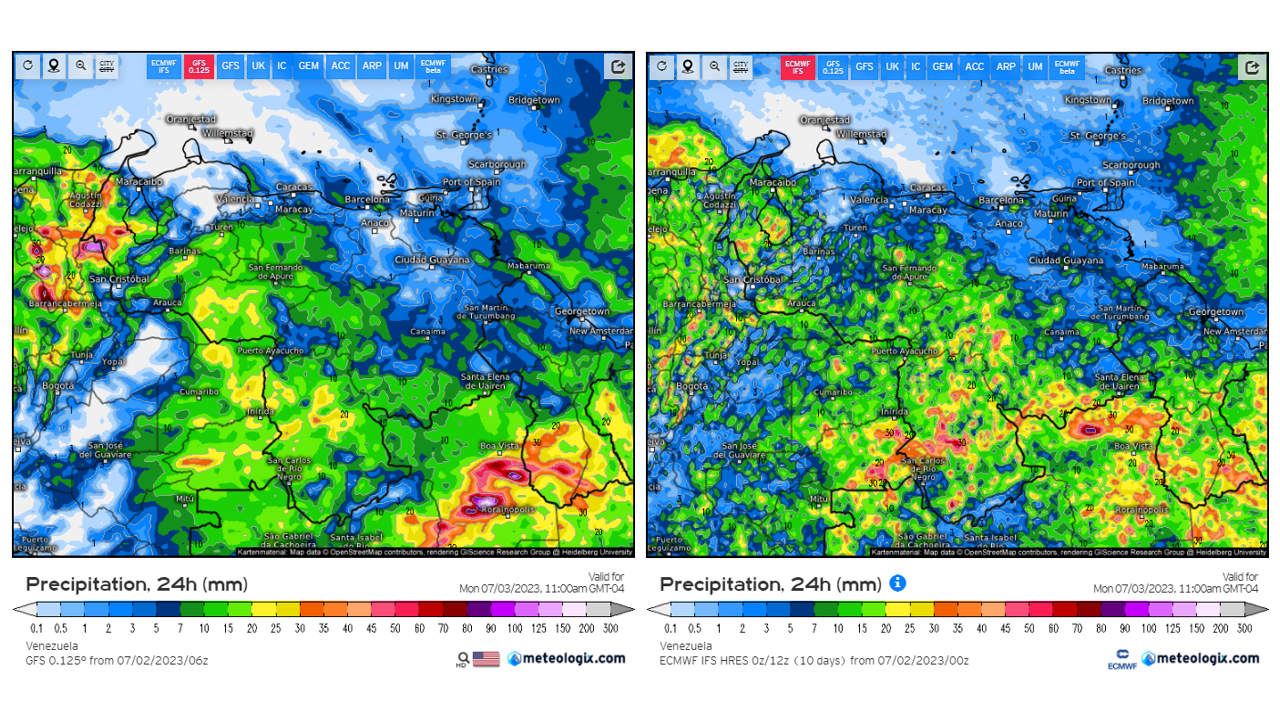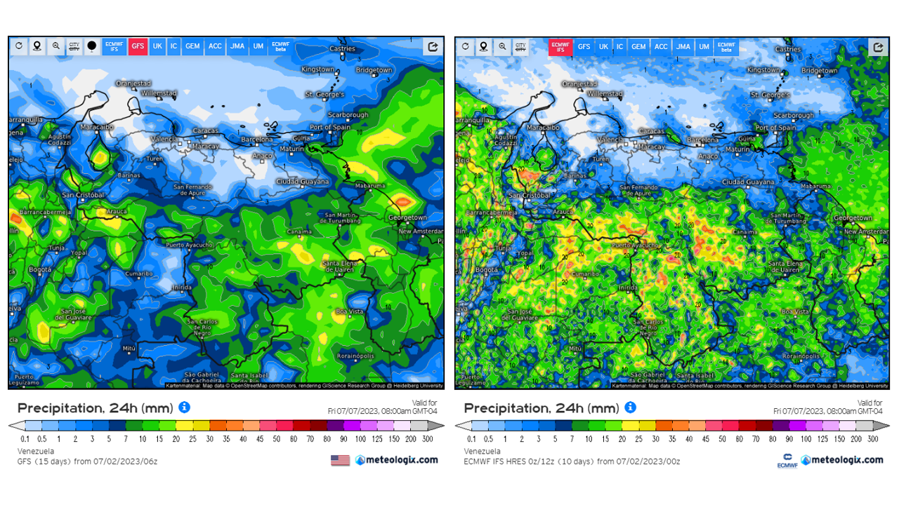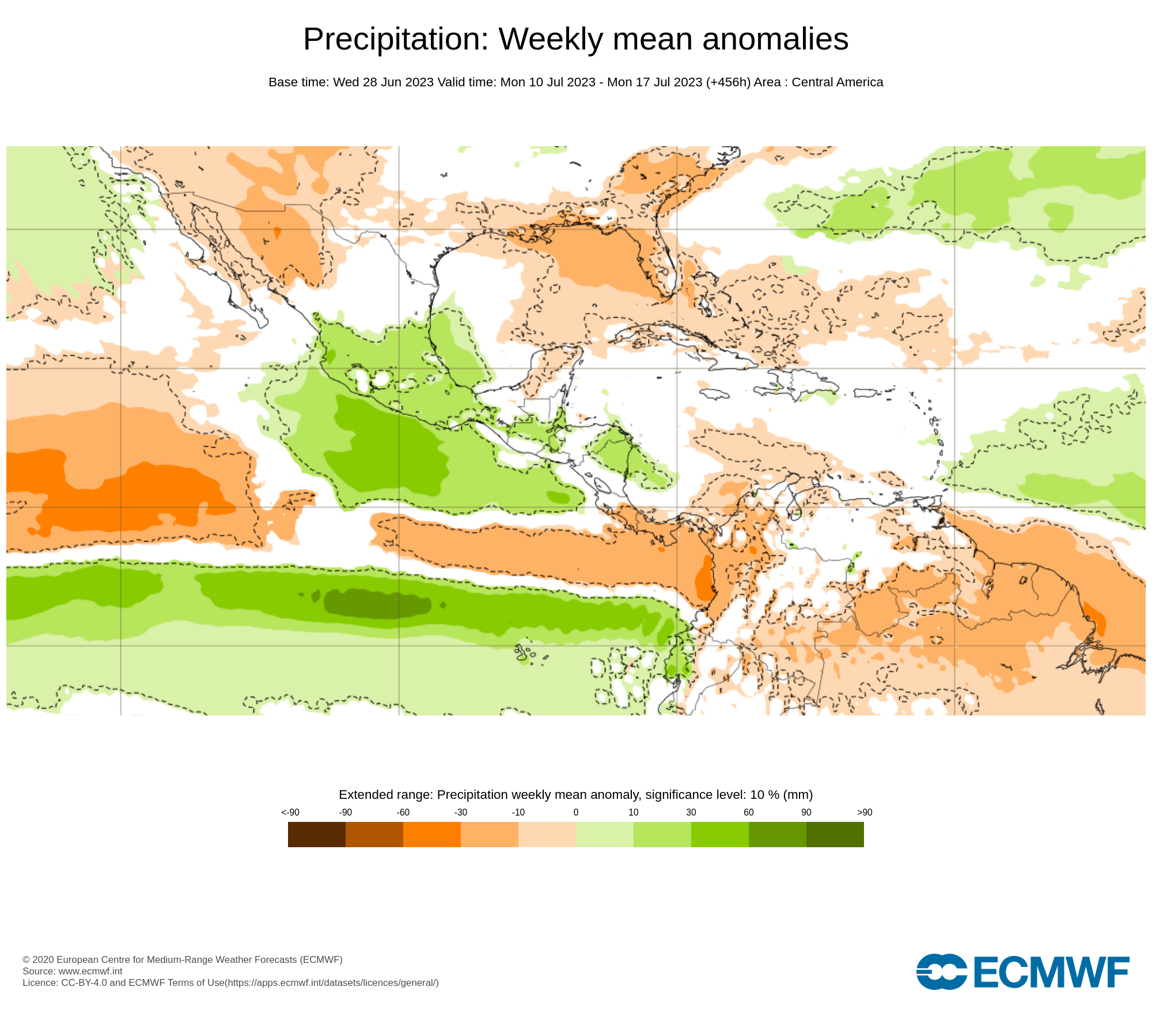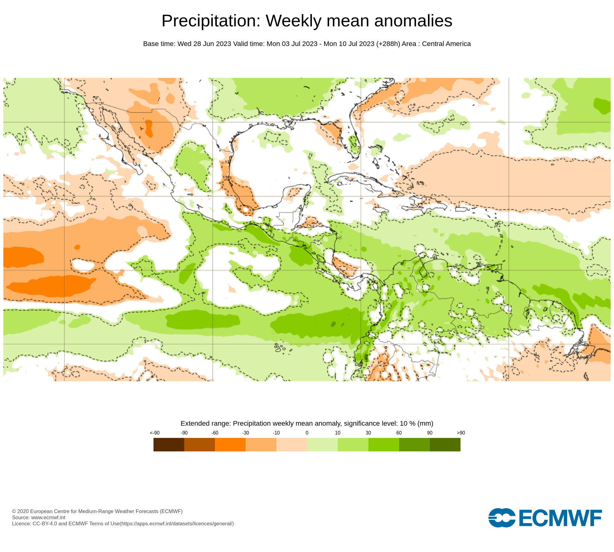 El pronostico semanal emitido por European Centre for Medium-Range Weather Forecast (ECMWF), se esperan eventos de precipitaciones promedio sobre casi todo el territorio nacional, con anomalías negativas al sur de Bolívar y Amazonas.