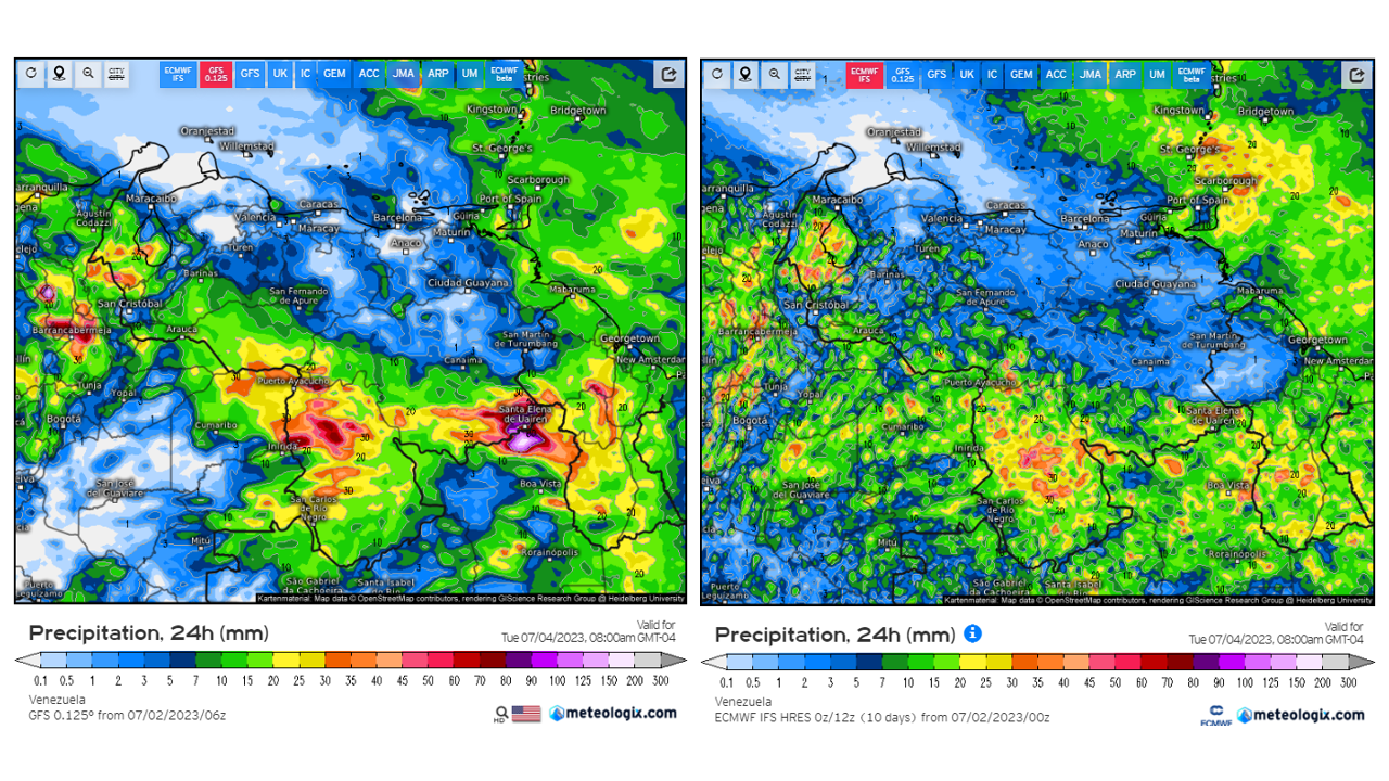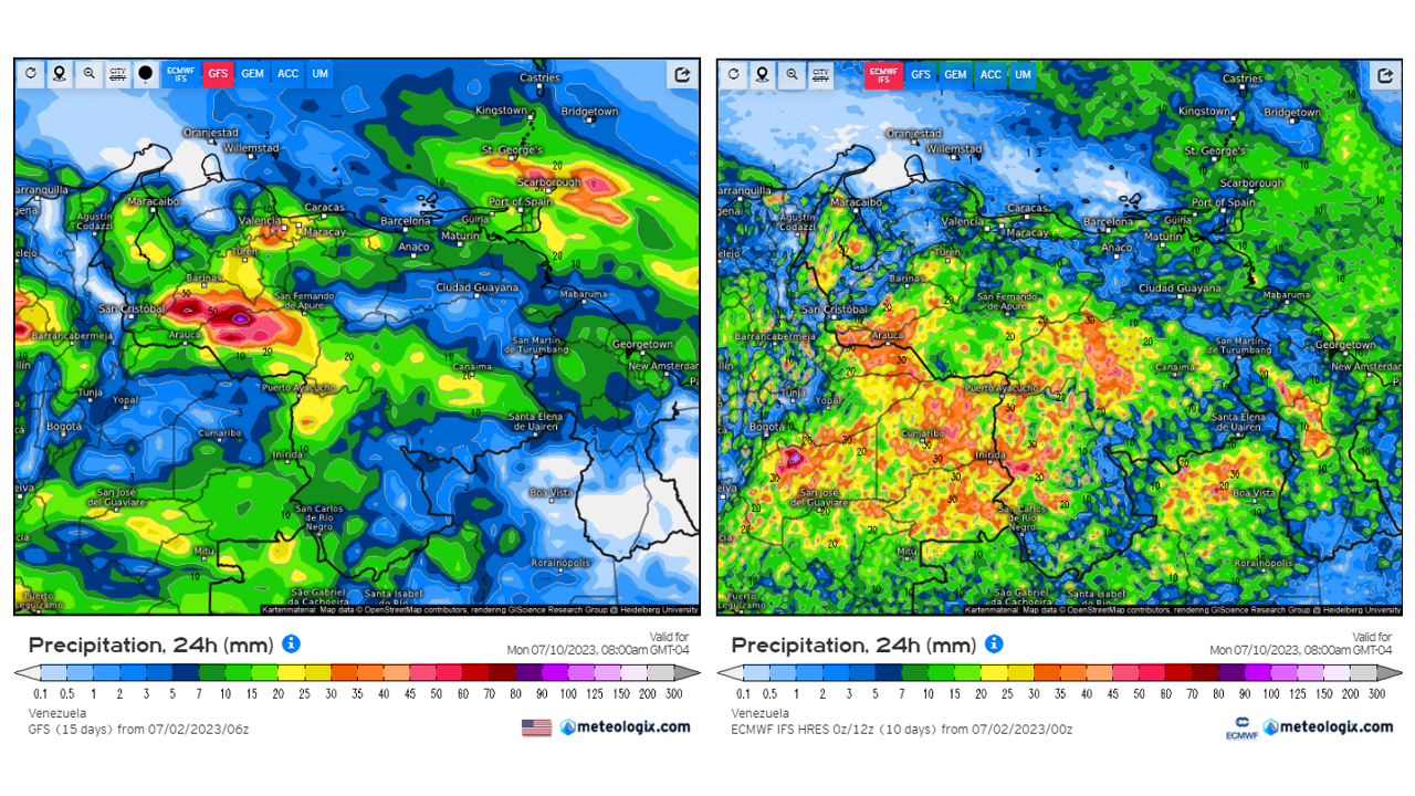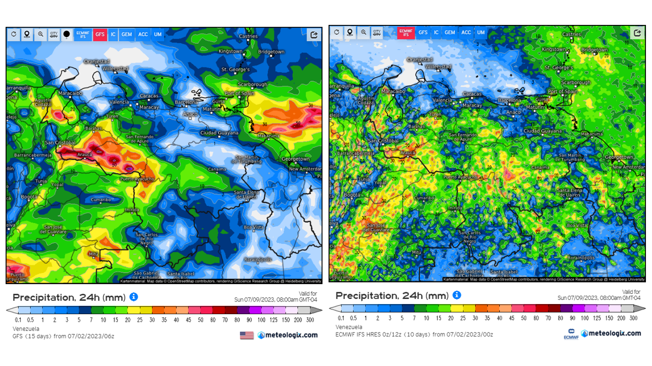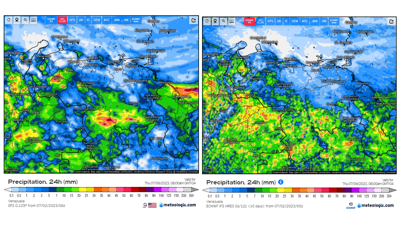 El modelo GFSv2 prevé en general eventos de precipitaciones dentro del promedio histórico en casi todo el territorio nacional, con anomalías postivas en Bolívar y Amazonas