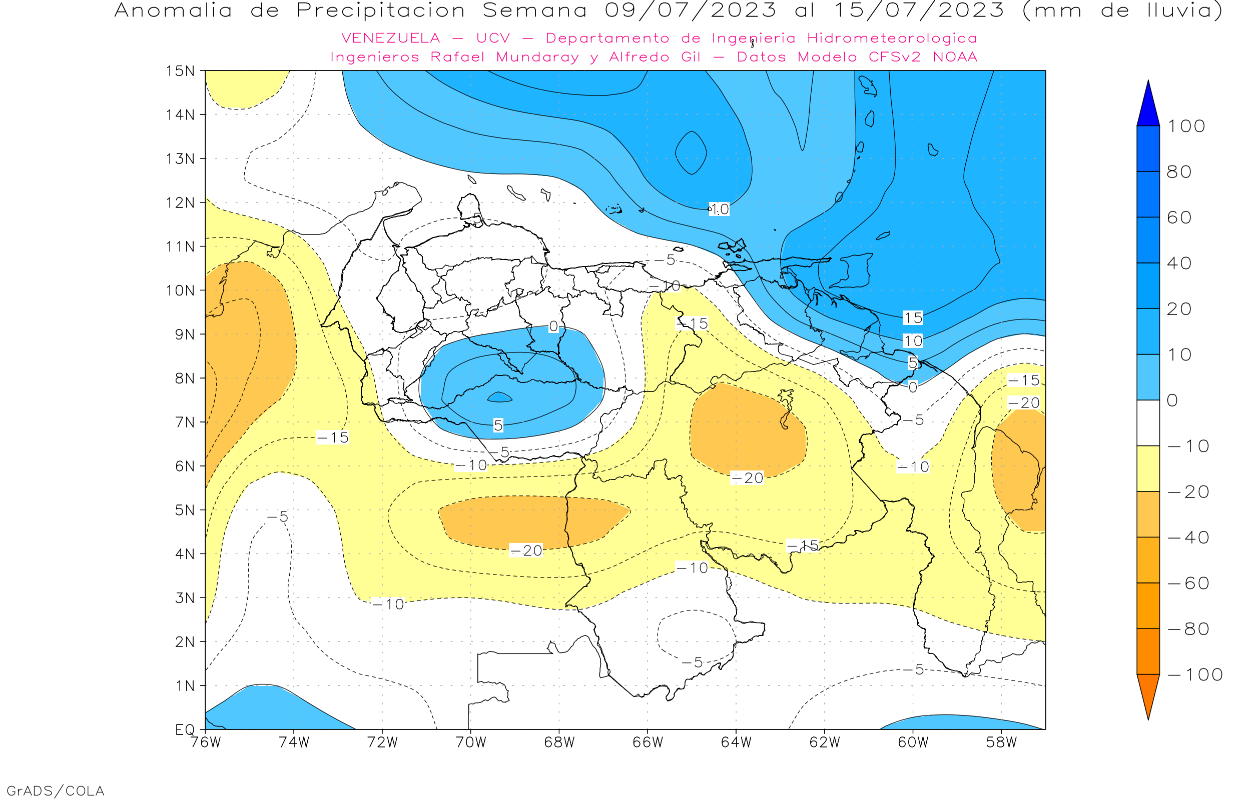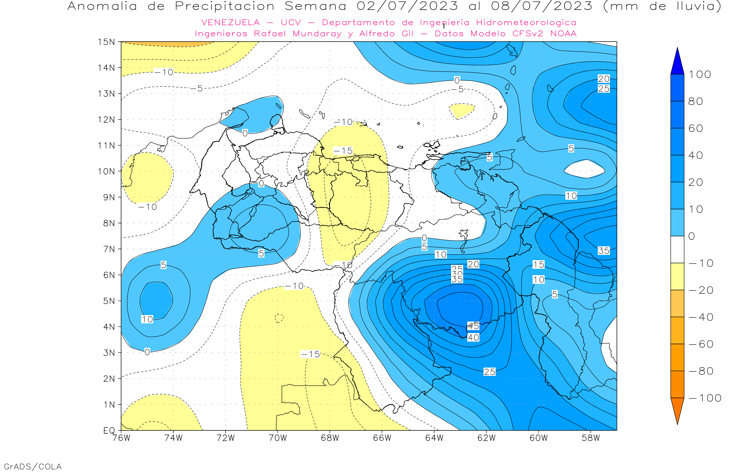 Pronostico de Anomalías Semanales para Venezuela, del 02 al 29/07/2023, usando datos del Modelo CFSv2 de NOAA y ECMWF.