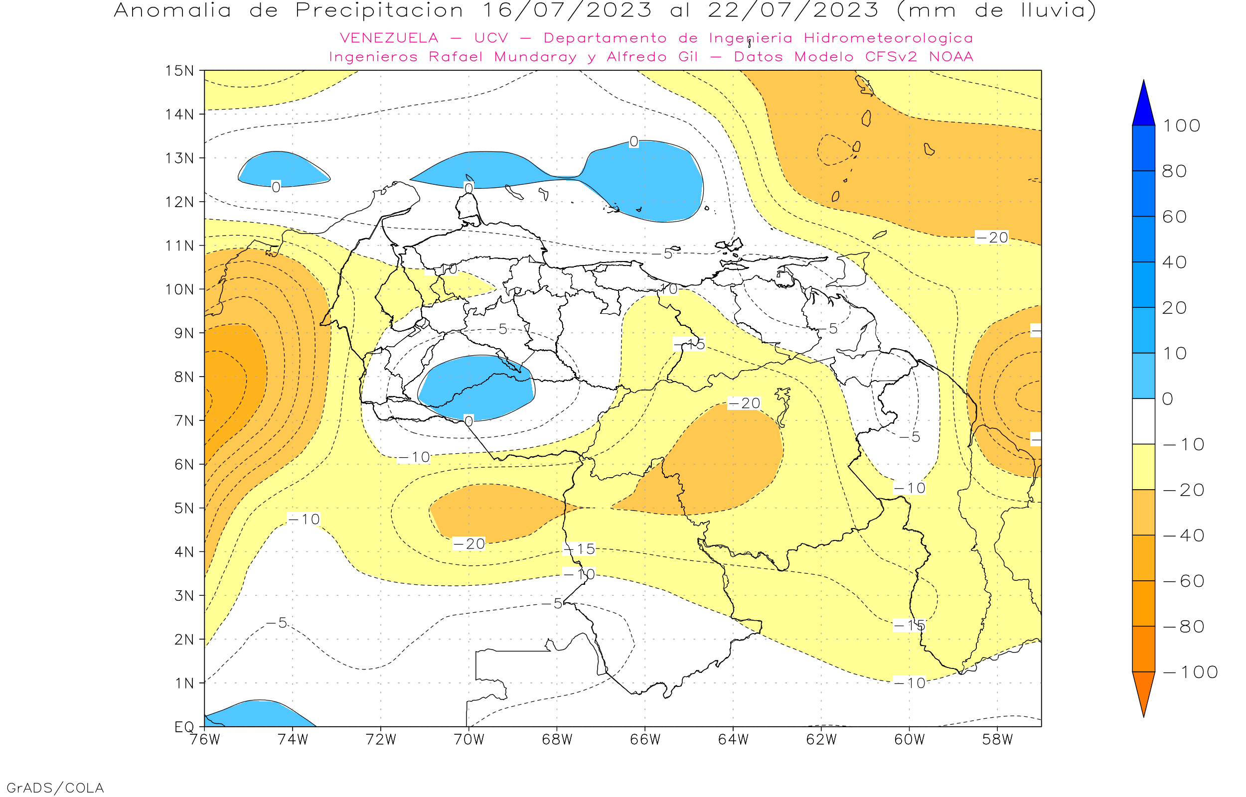 El modelo GFSv2 prevé en general eventos de precipitaciones dentro del promedio histórico en casi todo el territorio nacional. Anomalias negativas en Bolívar.
