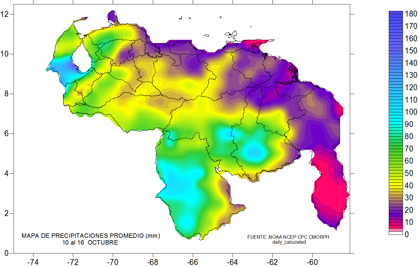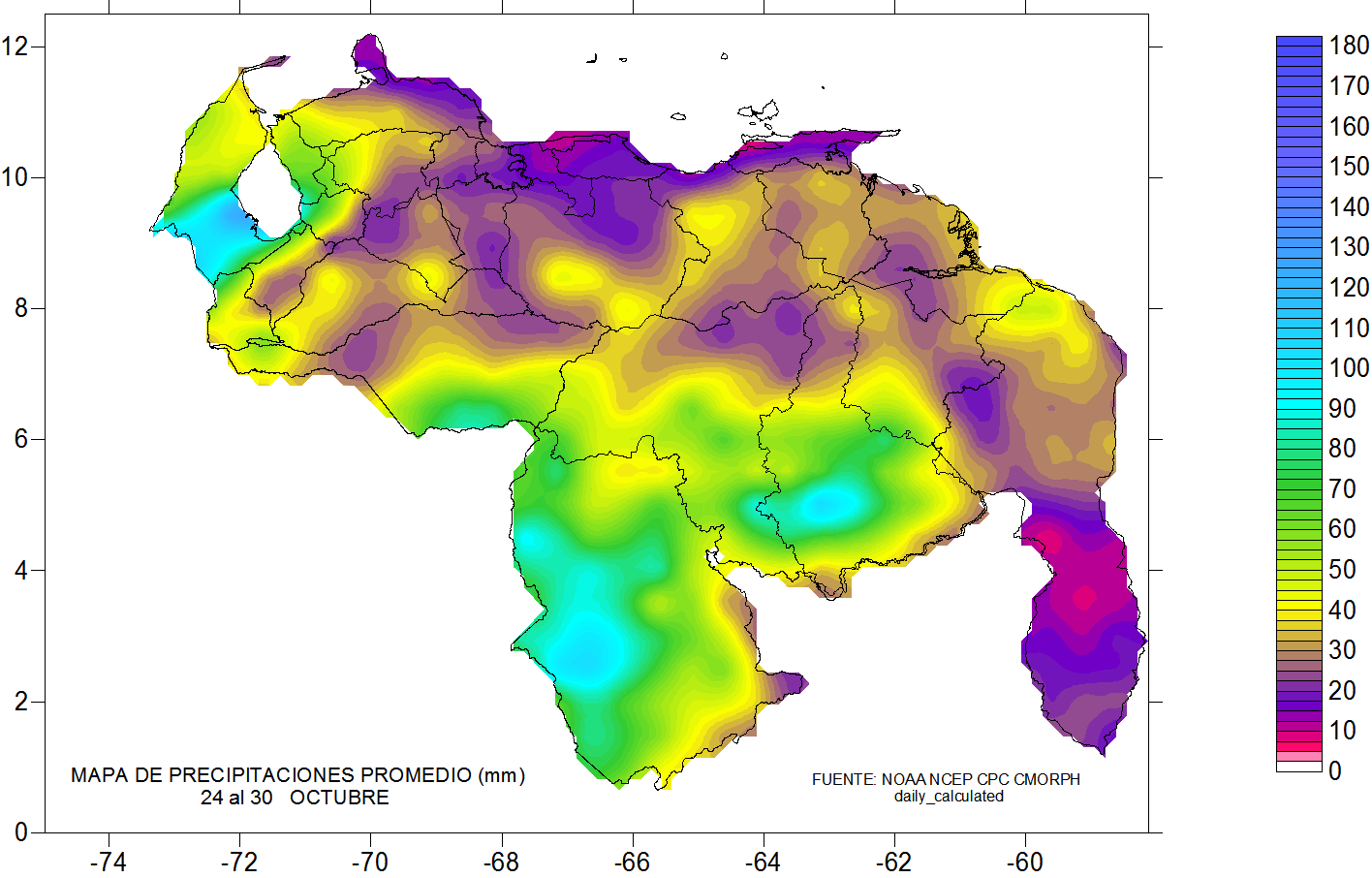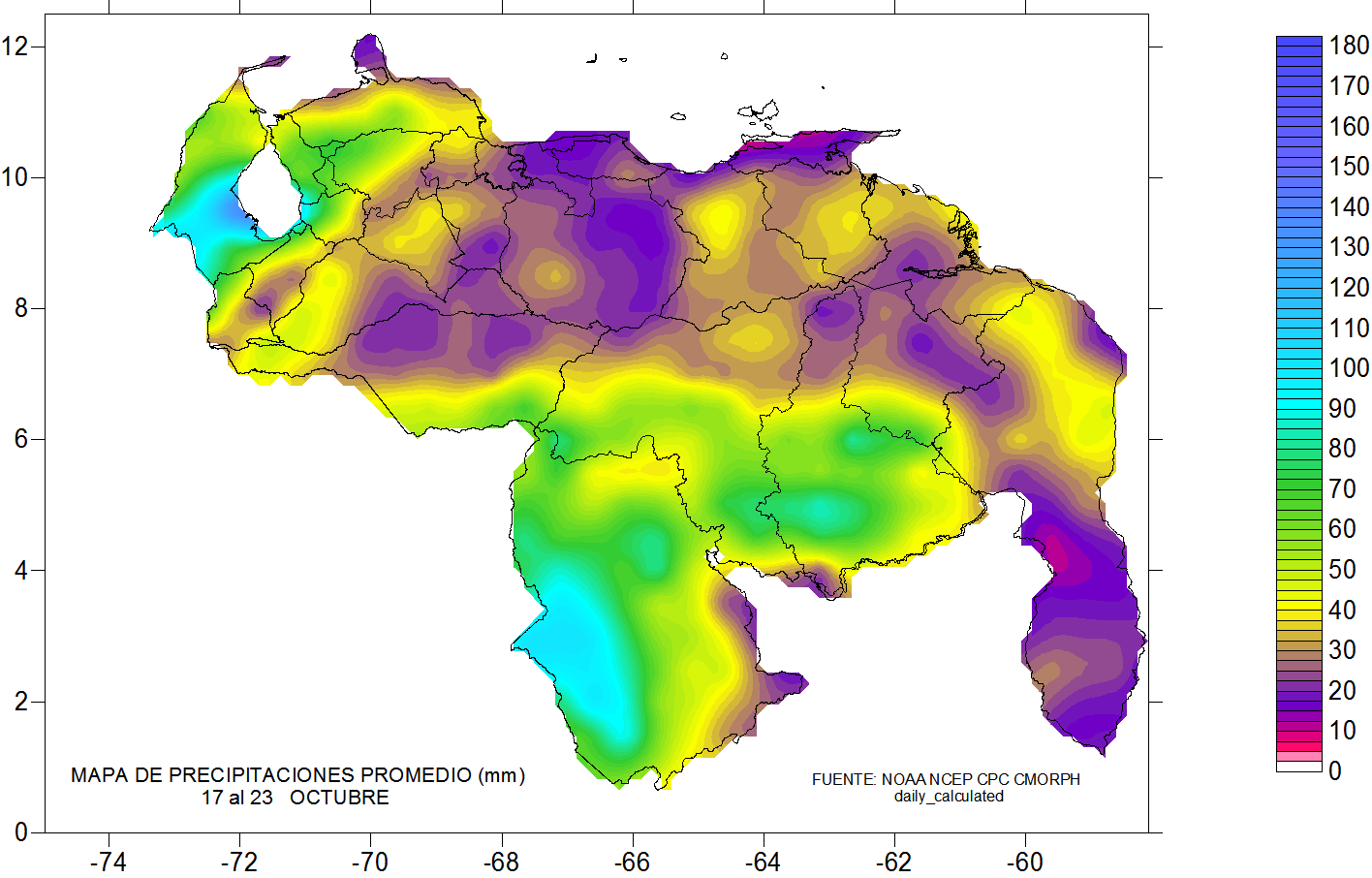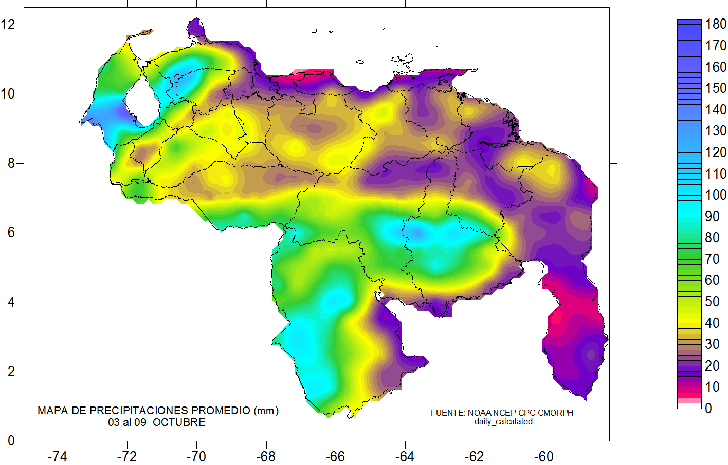 De acuerdo a la estadística de las precipitaciones estimadas para esta semana, se observa que los eventos más importantes se mantiene al sur del país, suroeste de Zulia, sureste de Falcón y sur de Apure . Ya se observa que las lluvias por encima de los 70 mm se ubican al sur de 6 norte, debilitándose las lluvias a lo largo de la cordillera andina, Falcón, Lara, llanos occidentales, Monagas, Sucre, Miranda, norte de Aragua, noreste de Bolívar y sureste de Amazonas.