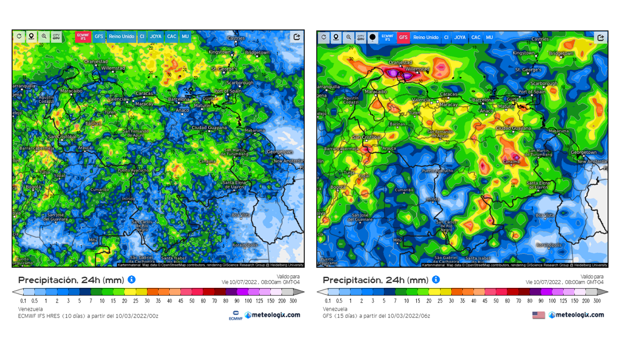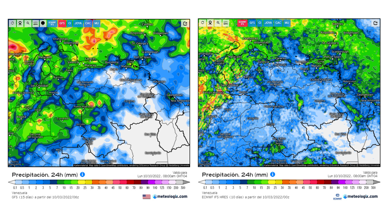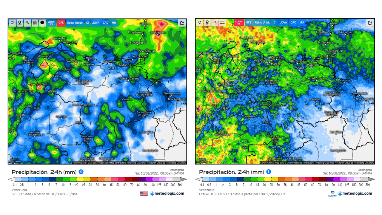 El modelo GFSv2 prevé en general eventos de precipitaciones dentro del promedio histórico en casi todo el territorio nacional, las positivas importantes en el este de oeste de Zulia, Delta Amacuro, este de Apure y norte de Amazonas.