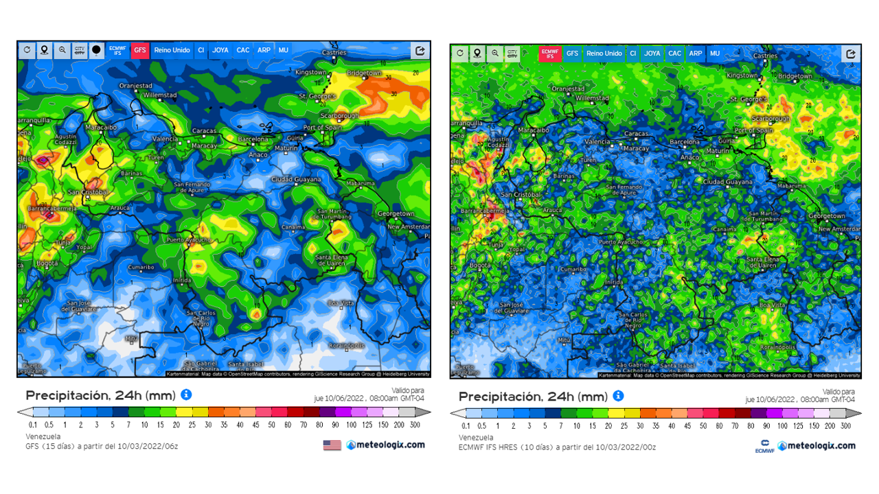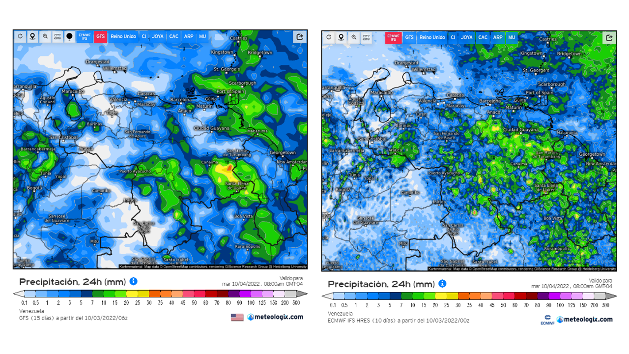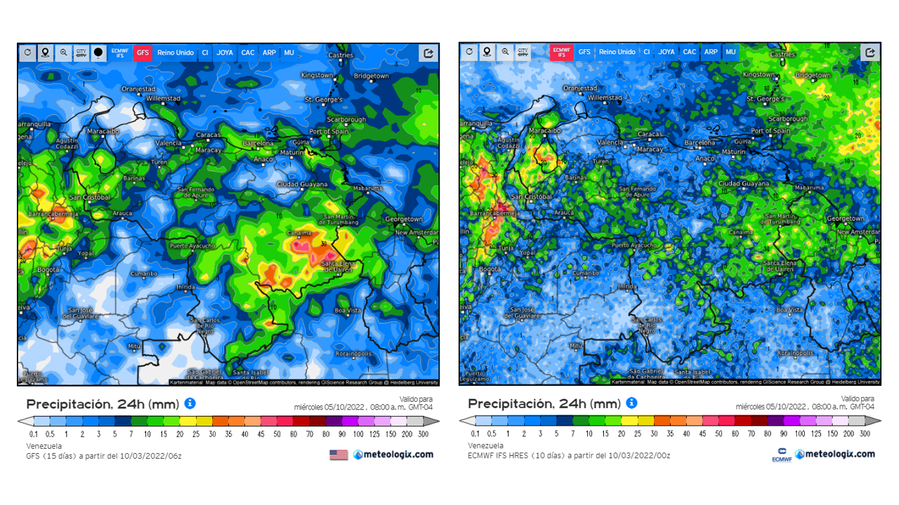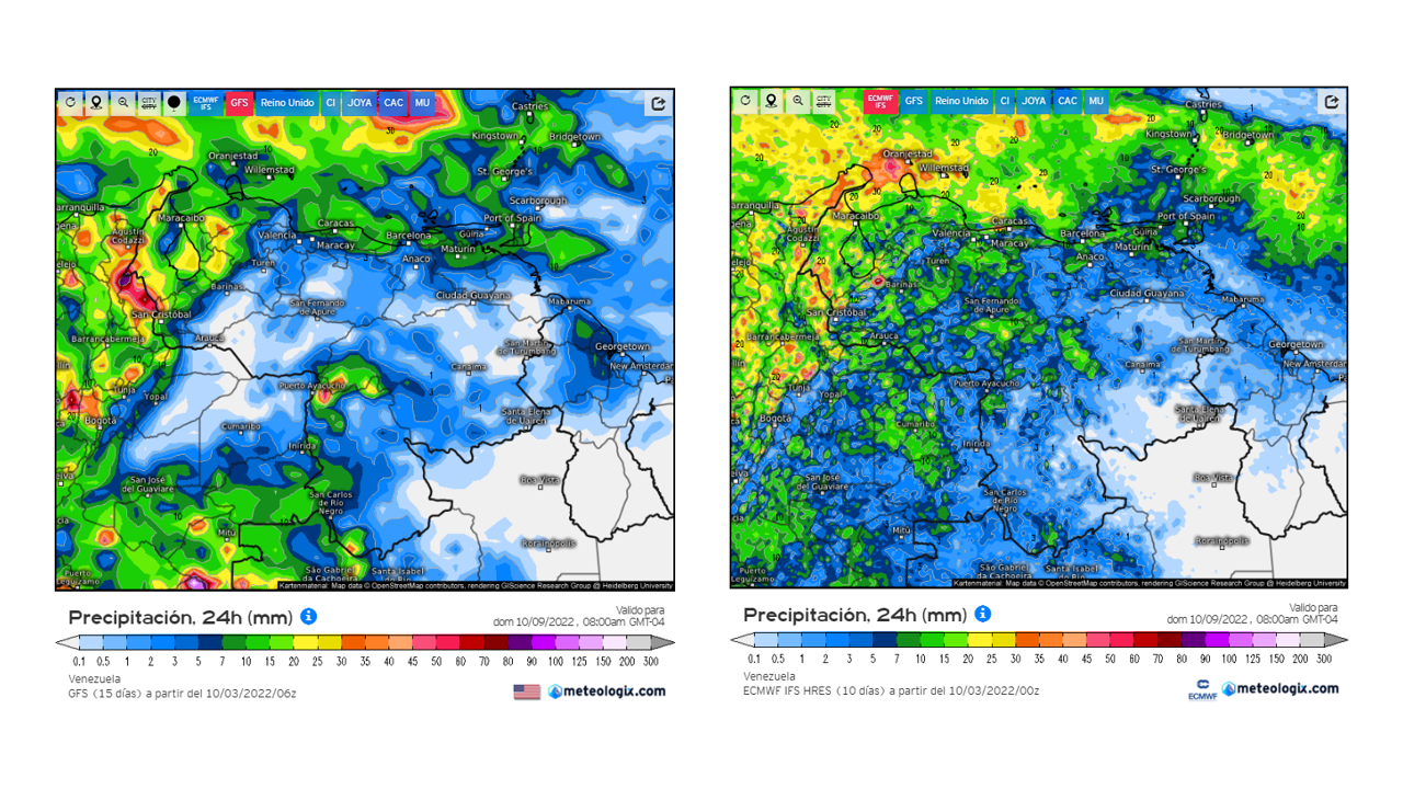 El modelo GFSv2 prevé en general eventos de precipitaciones dentro del promedio histórico en casi todo el territorio nacional, las positivas importantes en el este de oeste de Zulia, Delta Amacuro, este de Apure y norte de Amazonas.