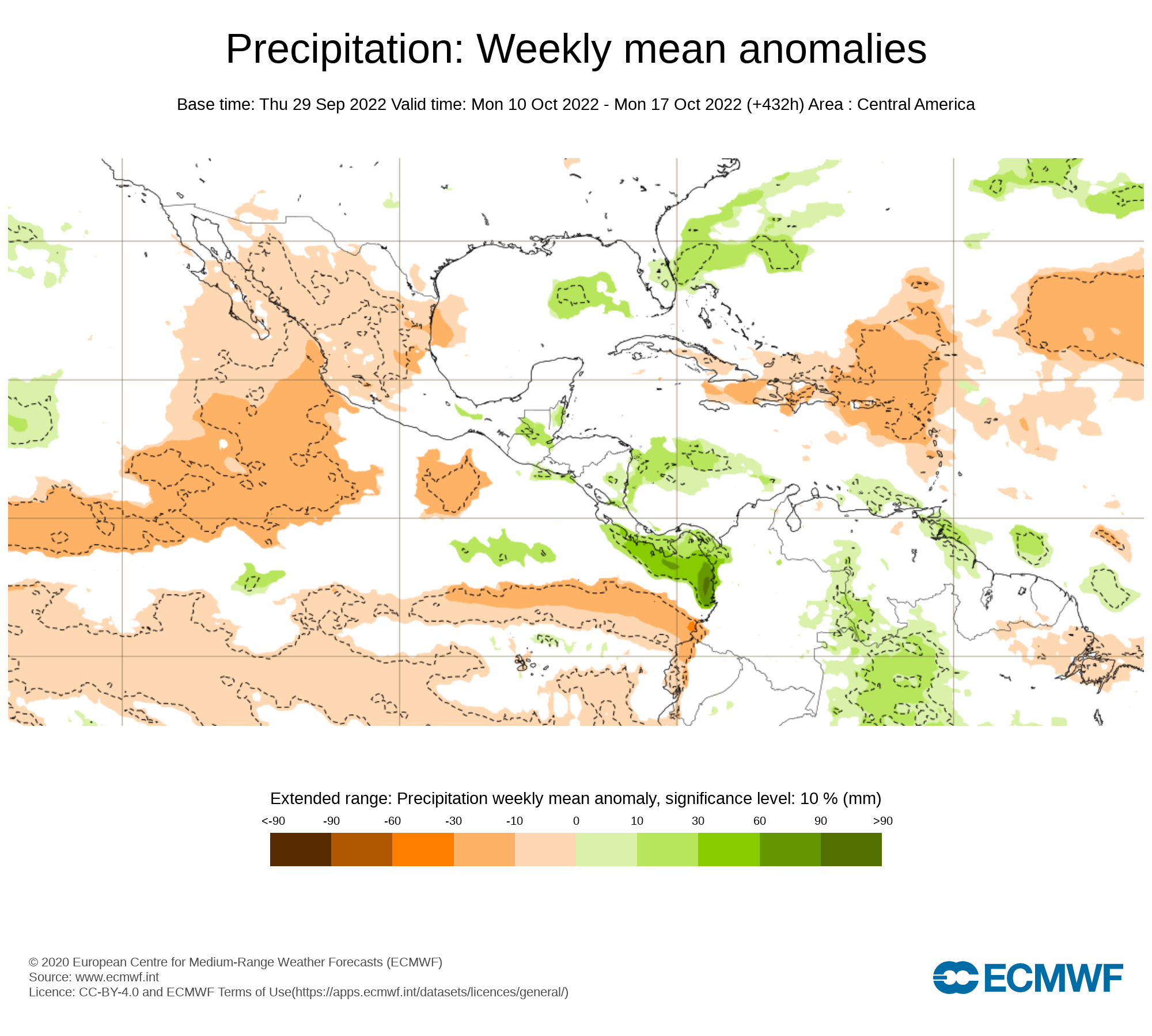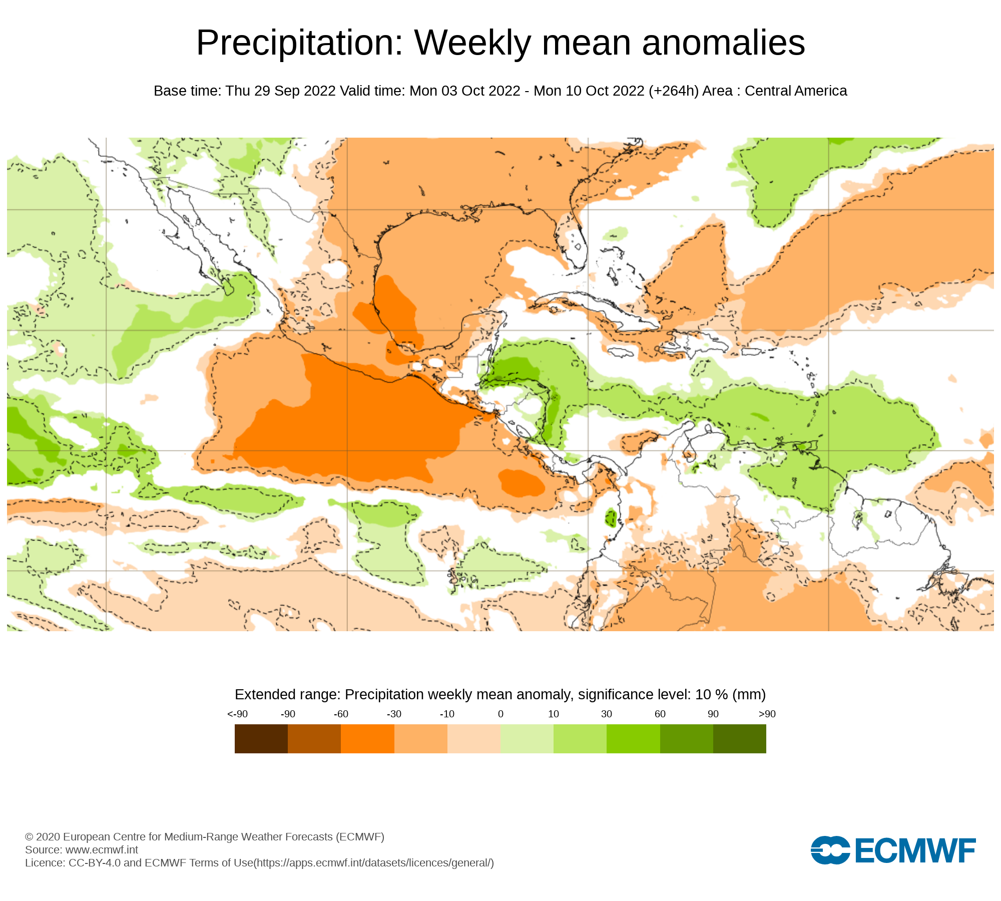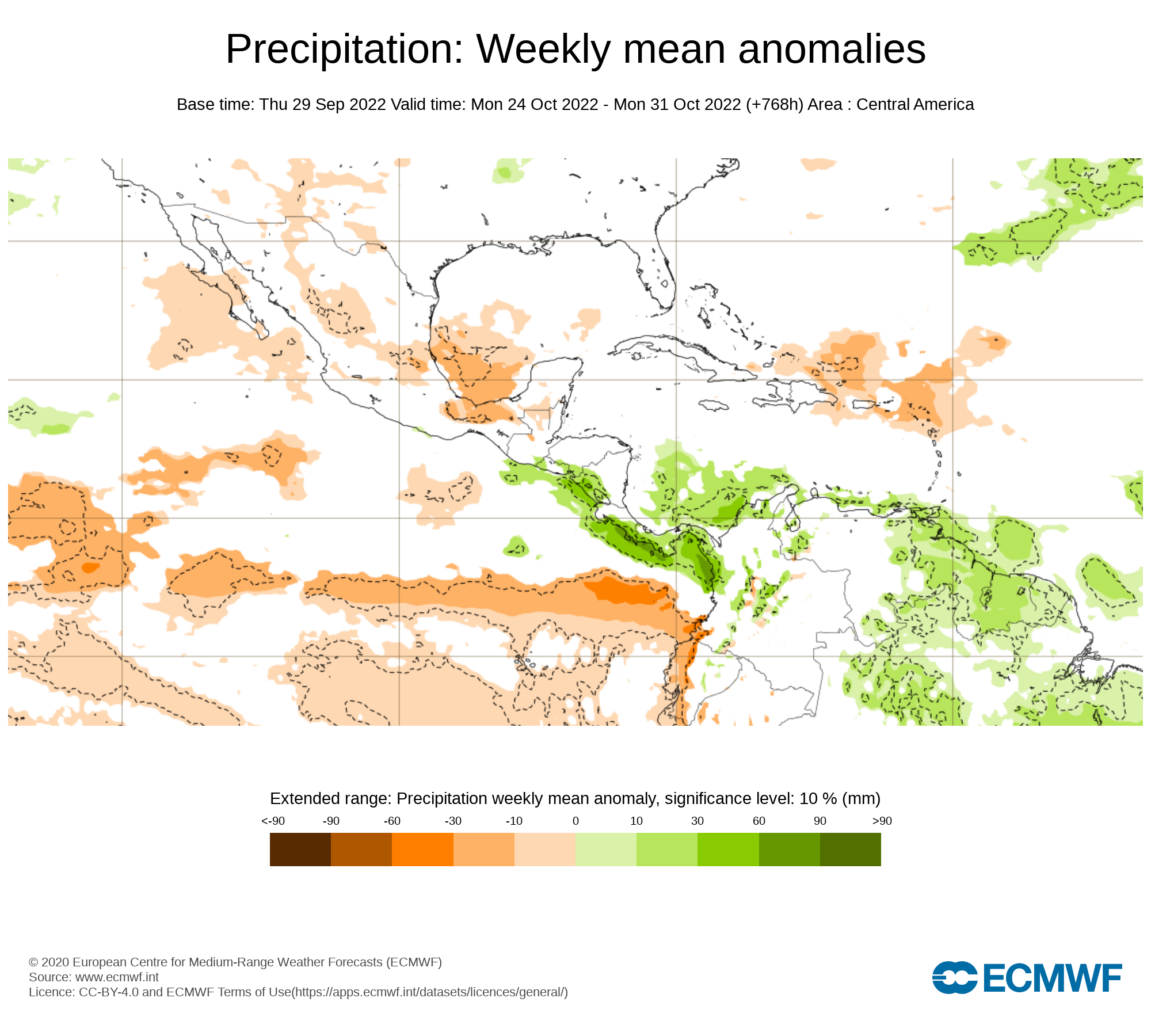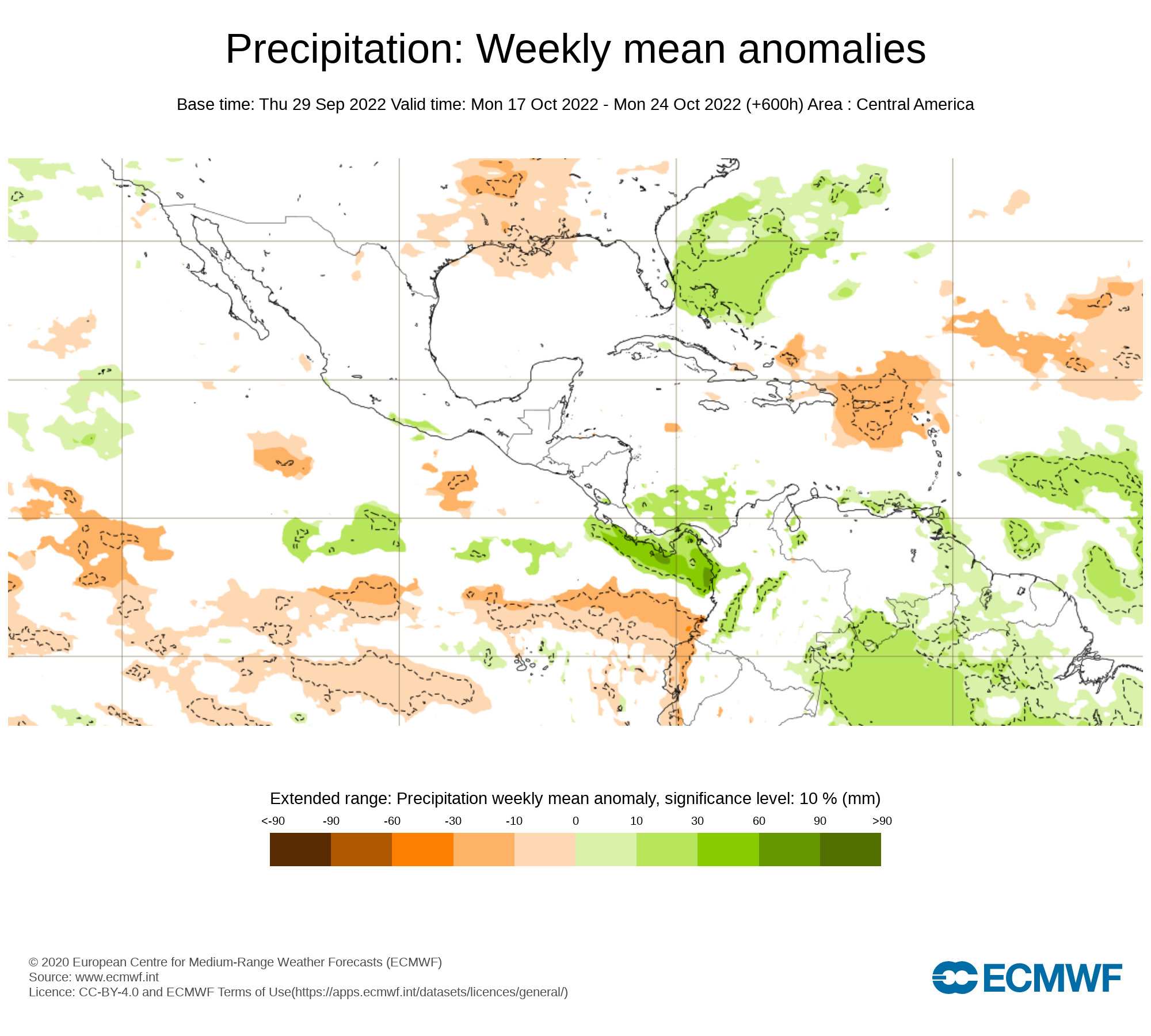 El pronostico semanal emitido por European Centre for Medium-Range Weather Forecast (ECMWF), se esperan eventos de precipitaciones promedio sobre el territorio nacional, con anomalías positiva en Bolívar, Monagas , Delta Amacuro y suroeste de Guárico Guárico
