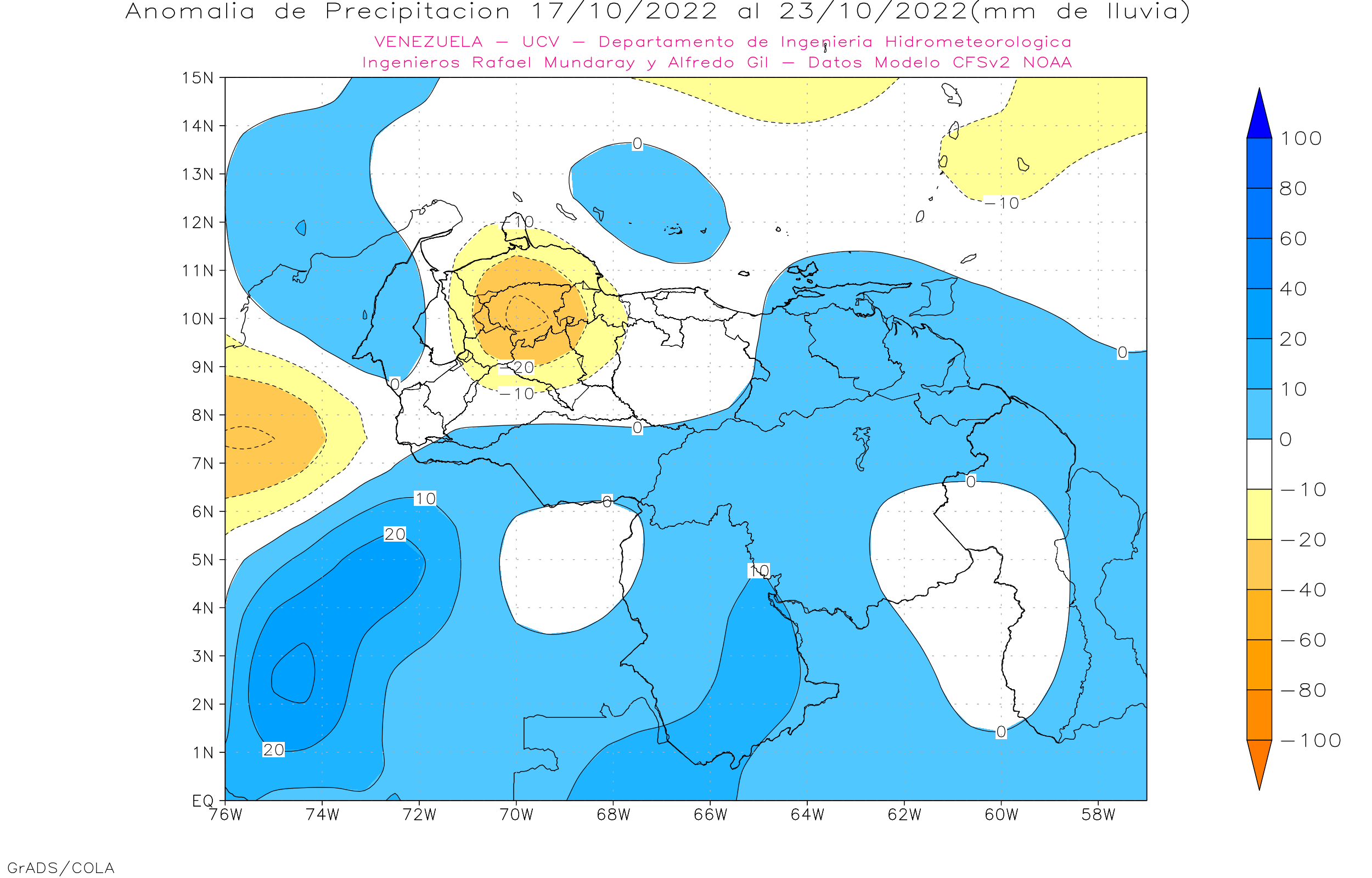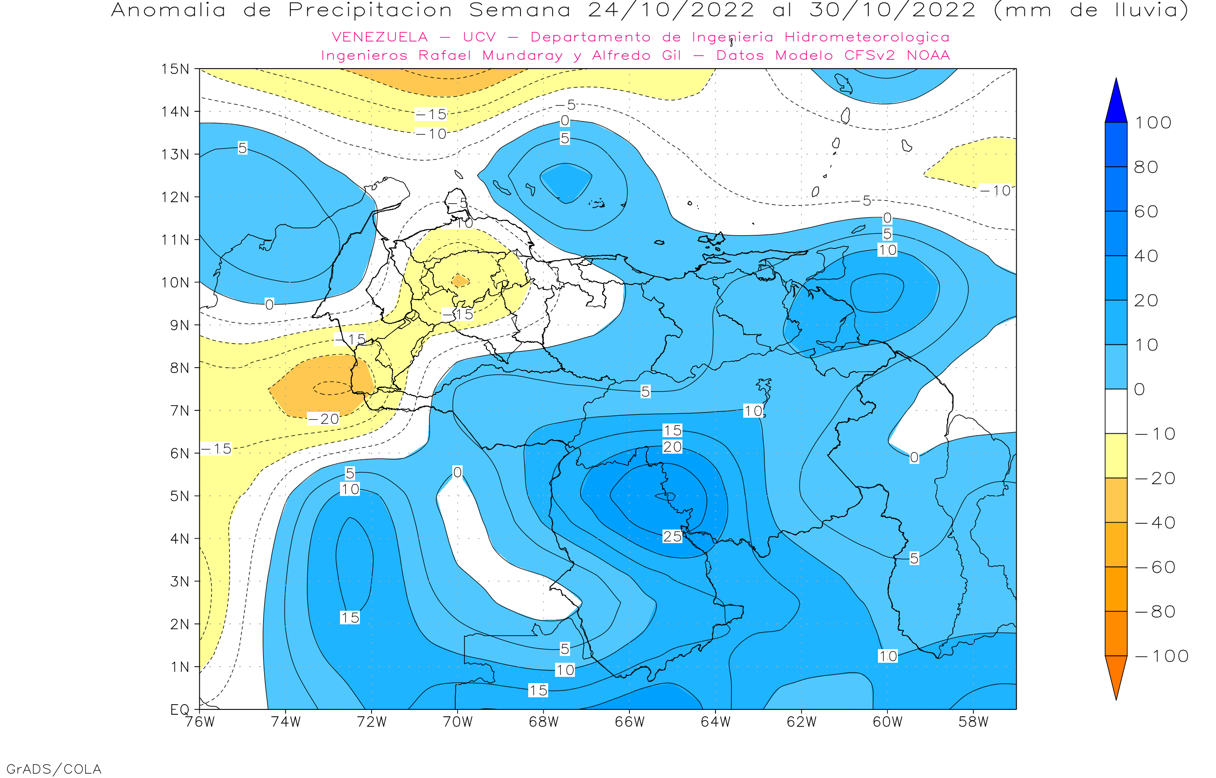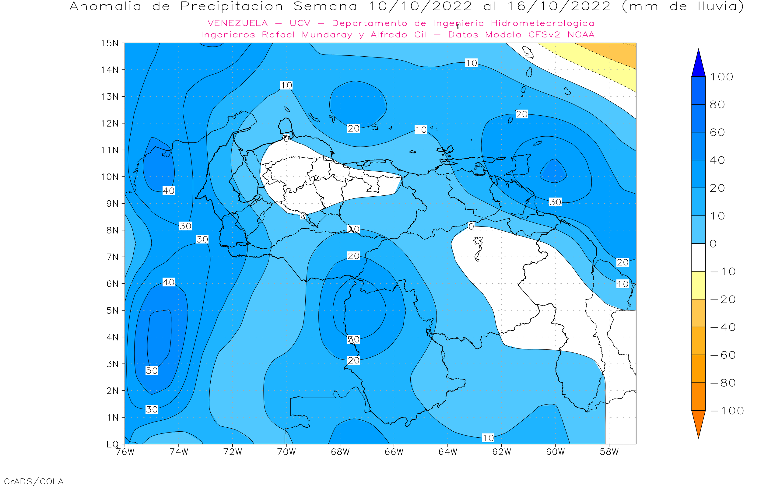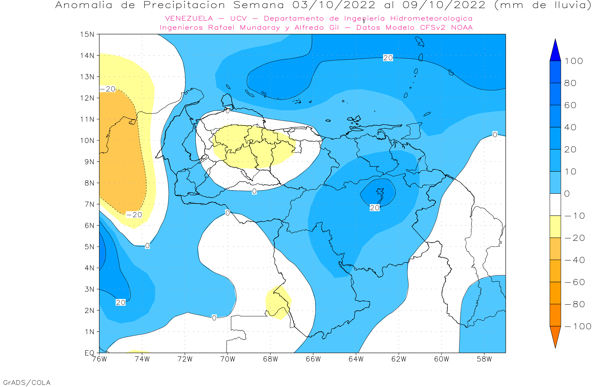 Pronostico de Anomalías Semanales para Venezuela, del 03 al 30/10/22, usando datos del Modelo CFSv2 de NOAA y ECMWF.