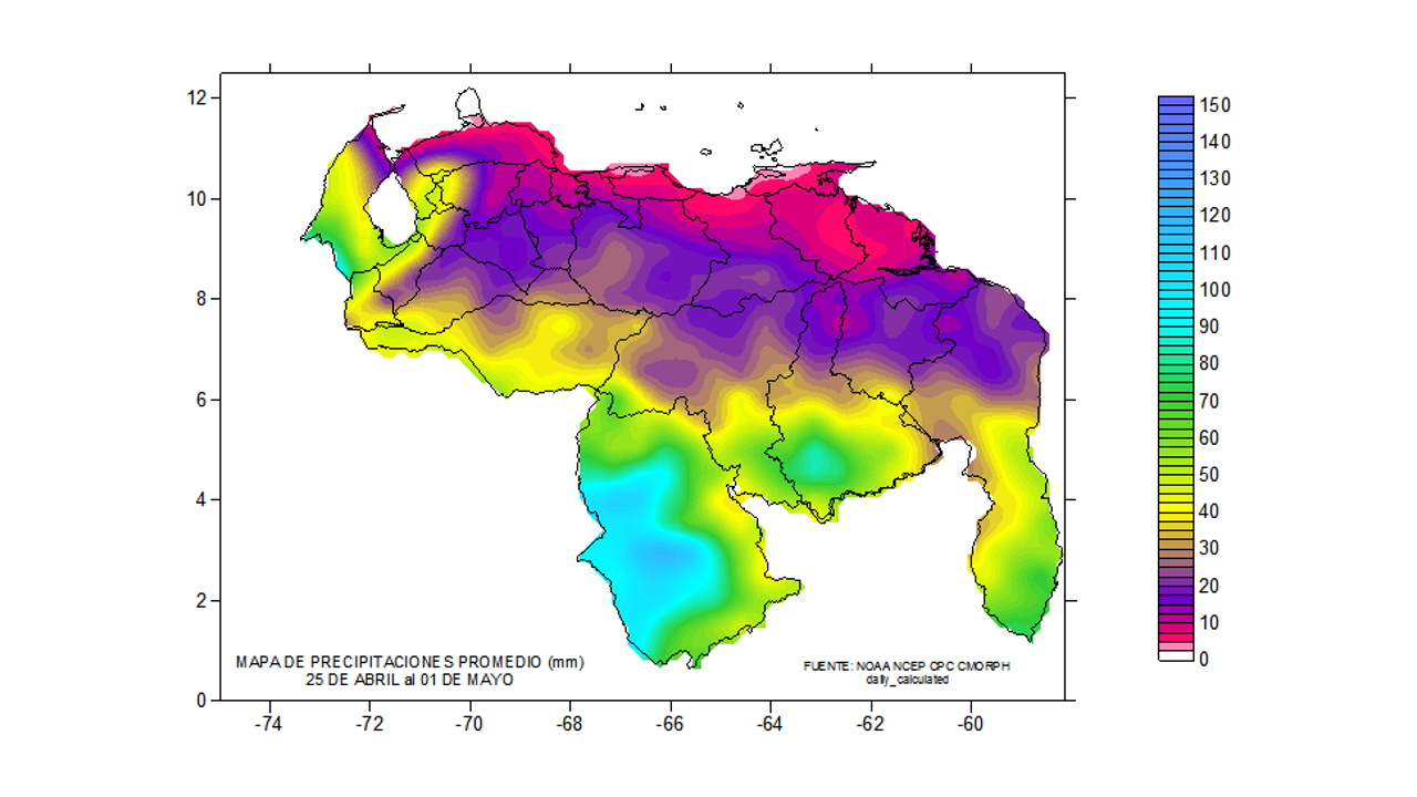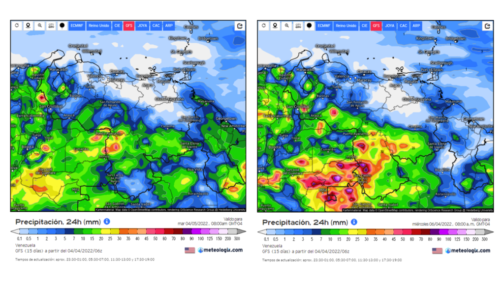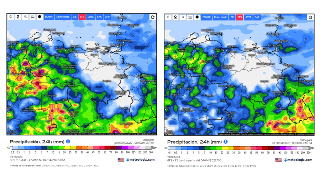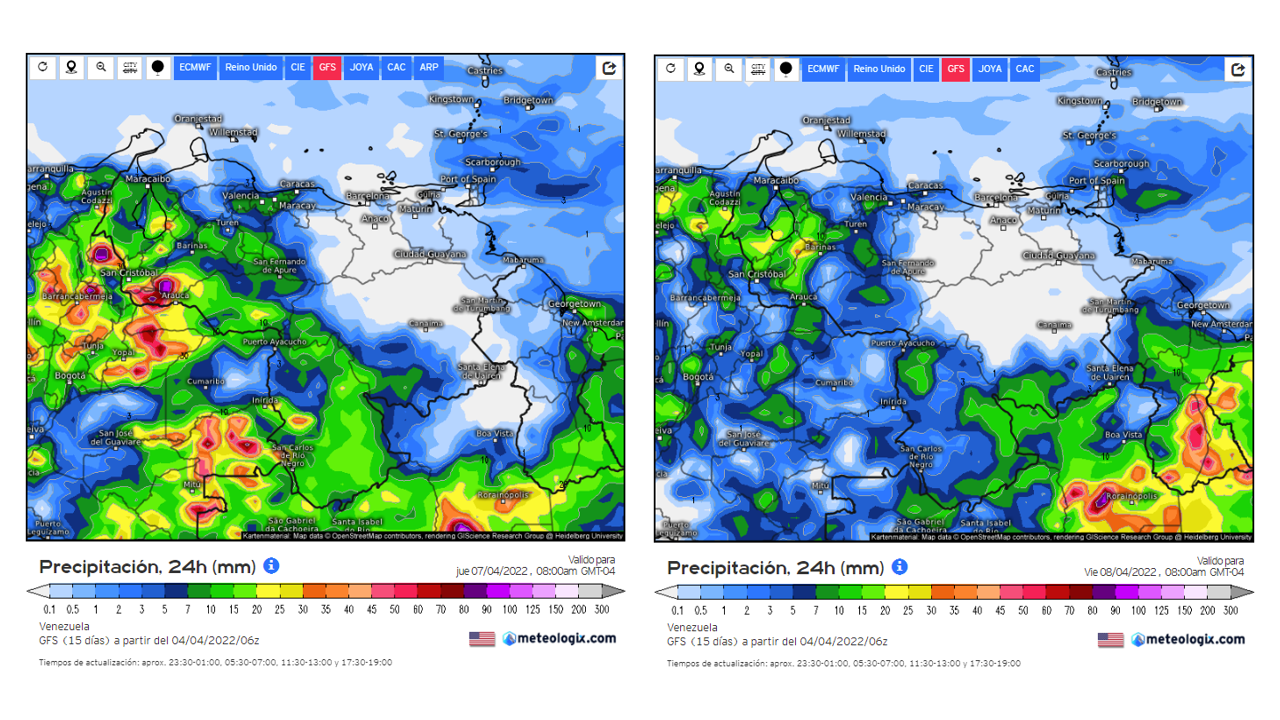 En el pronóstico diario del modelo GFS del 04 al 10 de abrik se espera al sur (Bolívar y Amazonas), comience la semana con eventos al suroeste de Bolívar y Amazonas, debilitándose los eventos en transcurso de la semana, y se incrementan nuevamente para el fin de semana en Amazonas. Los estados centrales (Aragua, Carabobo, Miranda, Vargas, Yaracuy y Guárico) algunos eventos aislados y de moderados a débiles se esperan en el transcurso de la semana. Los estados occidentales (Zulia, Lara, Falcón) se espera al principio de la semana eventos importantes al oeste de Zulia y se deben mantener en el zulia en el resto de la semana. La región andina (Táchira, Mérida y Trujillo) se esperan eventos al principio de la semana, y manteniendose en el transcurso de la semana. Los llanos occidentales (Portuguesa, Apure, Barinas y Cojedes) se esperan débiles y disperson de precipitaciones en la región, los mas importante a media semana, y la región oriental (Anzoátegui, Sucre, Monagas y Delta Amacuro) se espera eventos de precipitaciones débiles y dispersos en Delta Amacuro.