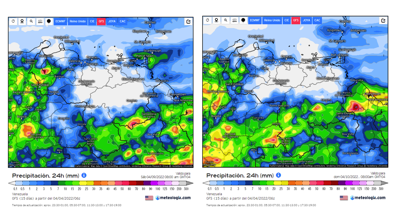 El modelo GFSV2 prevé en general eventos de precipitaciones dentro del promedio histórico y positivas importantes en los estados occidentales, Apure, los andesAmazonas y Delta Amacuro