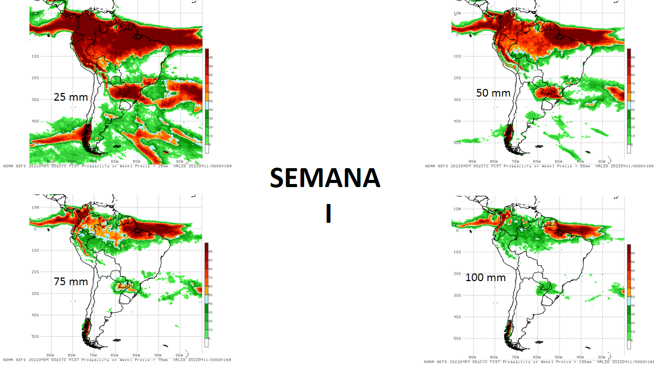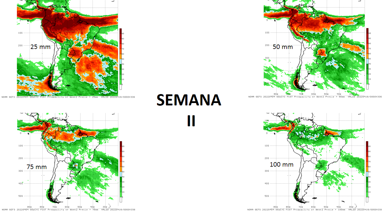 Las Probabilidades de excedencia total de precipitación para semana del 11 al 17 de abril, superiores a 25, 50, 75 y 100 mm, se prevé las mayores probabilidades para eventos mayores de 25 mm Bolívar, Delta Amacuro, Amazonas y los andes, la mayor probabilidad de 50 mm al sur de los estados Amazonas y Bolívar, y los andes, para eventos mayores de 75 y 100 mm las probabilidades se reducen y observan puntos importantes al sur de de los estados Bolívar y Amazonas.
