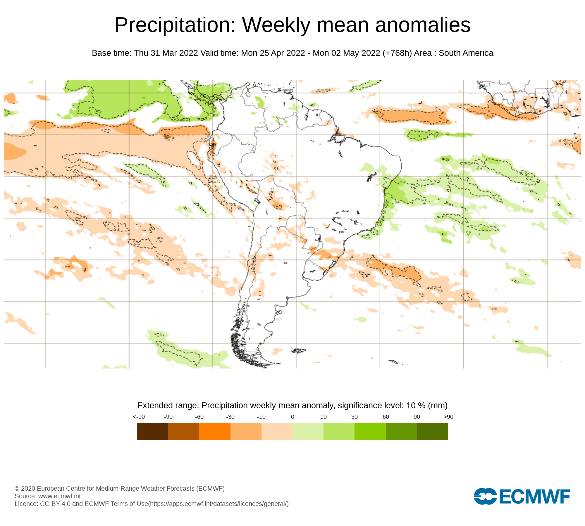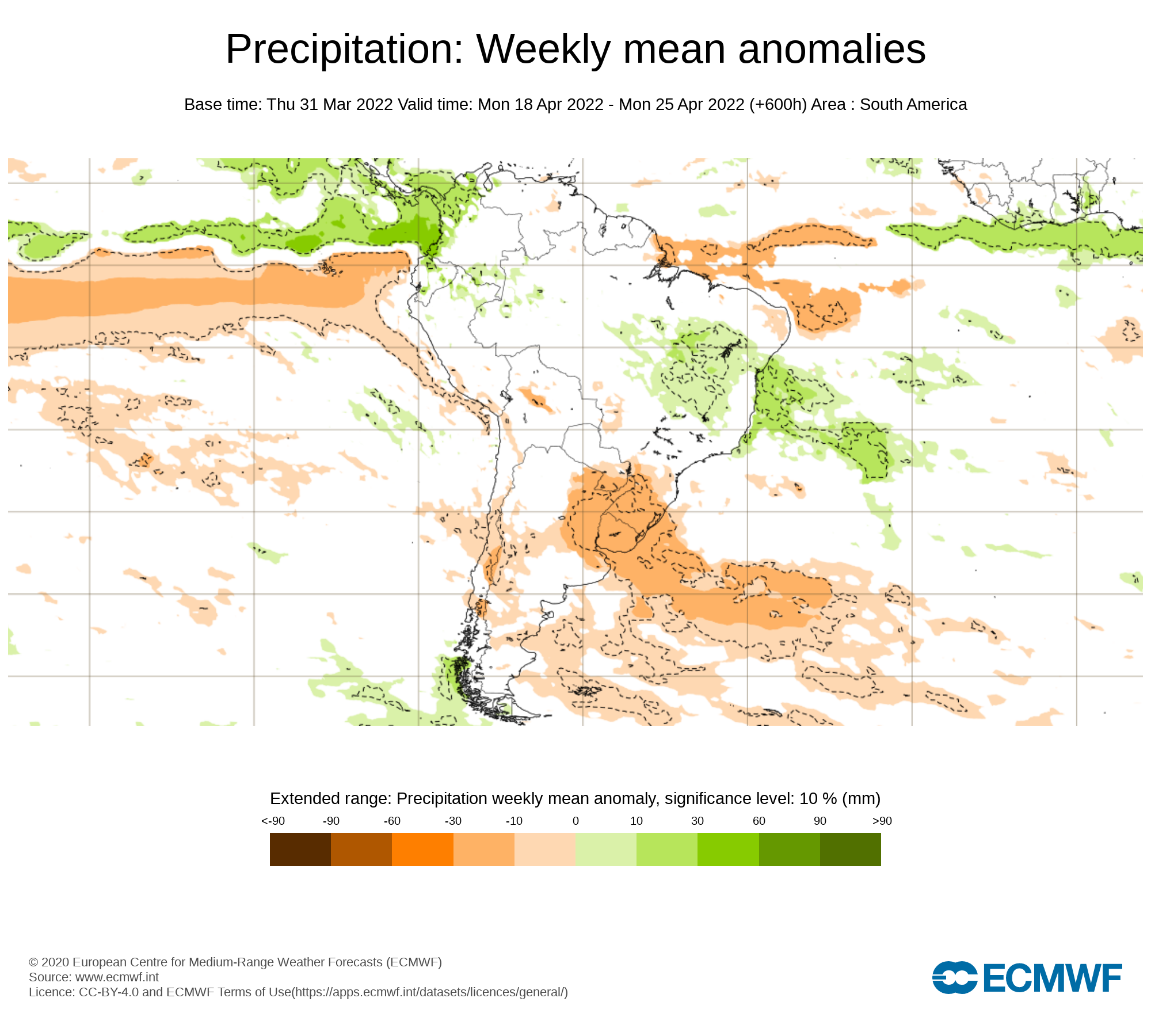 El pronostico semanal emitido por European Centre for Medium-Range Weather Forecast (ECMWF), se esperan eventos de precipitaciones con anomalías negativas en casitodo el territorio nacional.